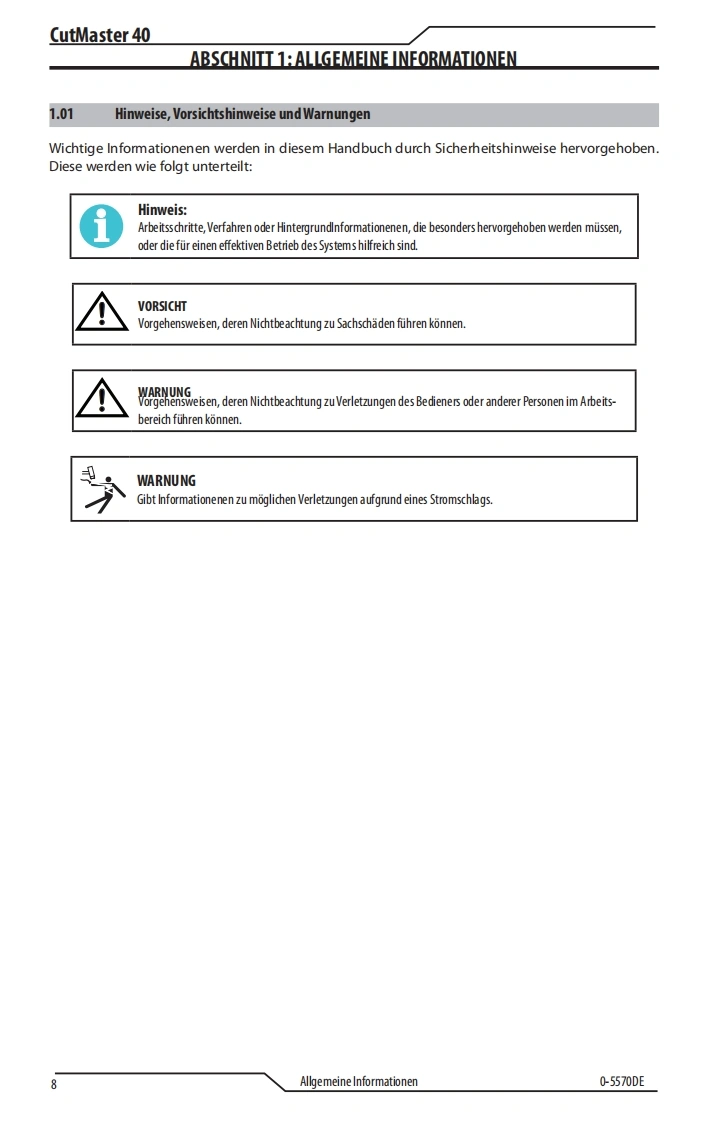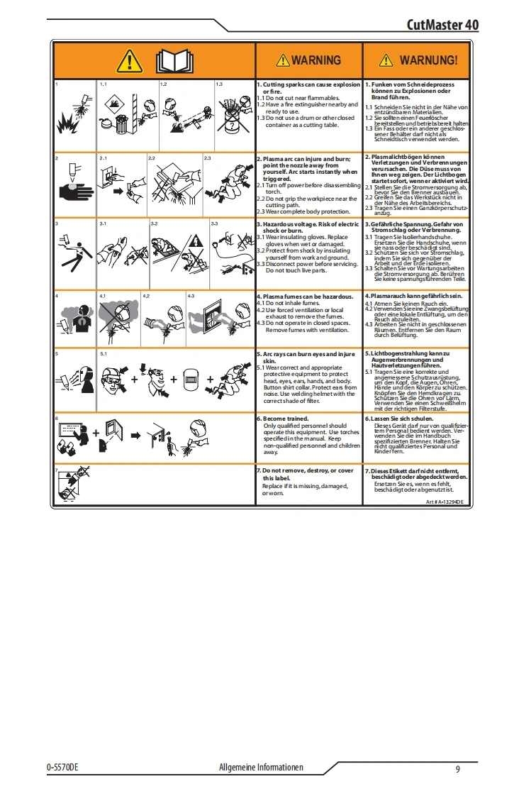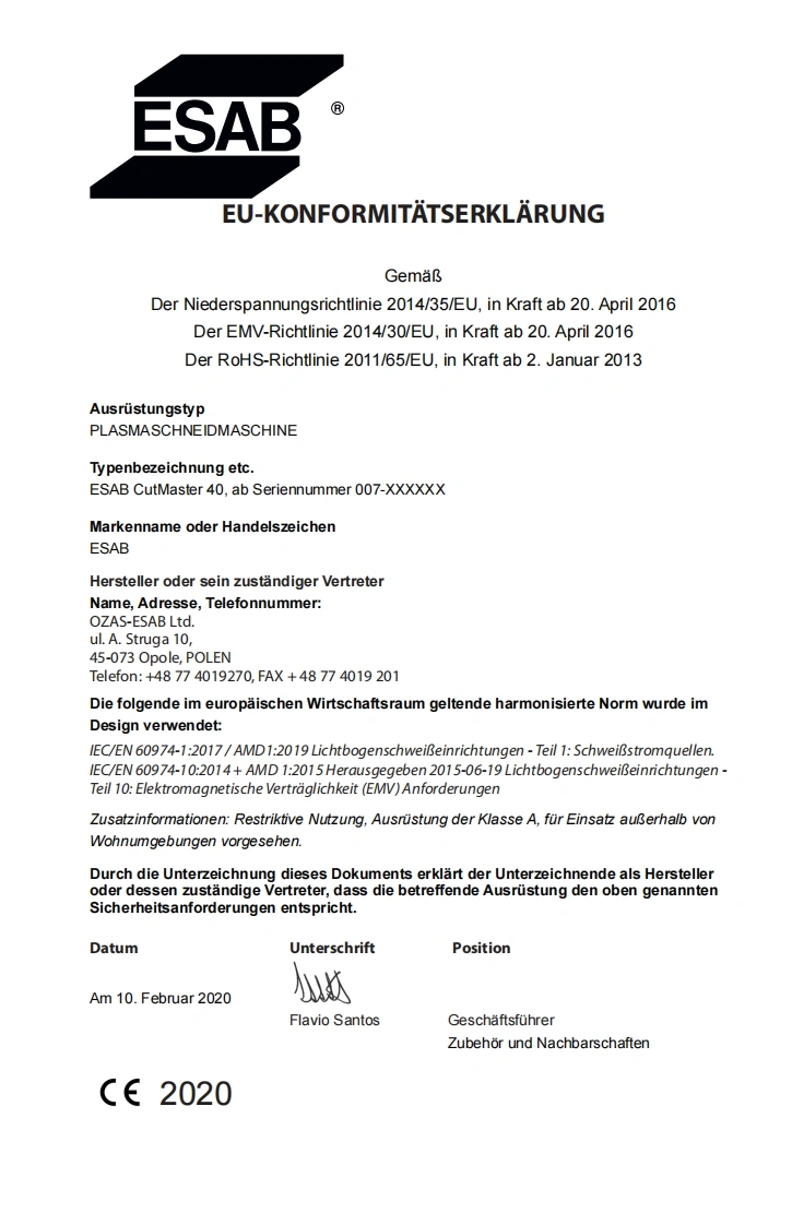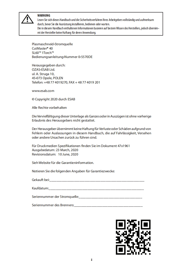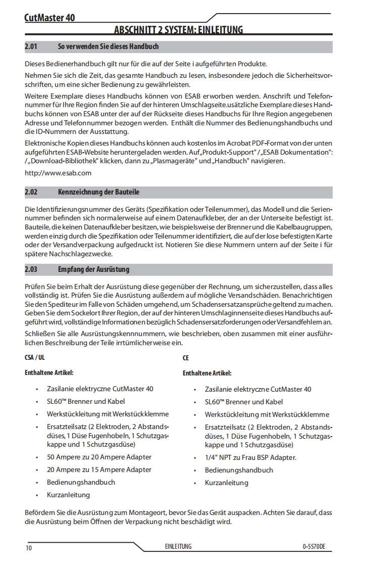 ®NETZSPANNUNGSPANNUNGESABPHASIG120-240VAUSGABEMAX.AUSGABEDC40AMPERECUTMASTER®40PLASMASCHNEIDMASCHINEBedienung-sanleitungESABArt A-14396DERevision:ACAusgabedatum:10 June,2020Handbuch Nr.:0-5570DEesab.comWARNINGCancer and Reproductive Harmwww.P65Wamings.ca.govWash hands after handling.