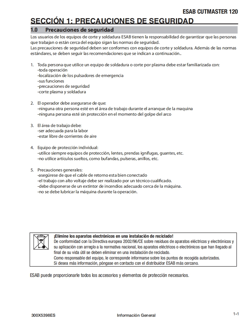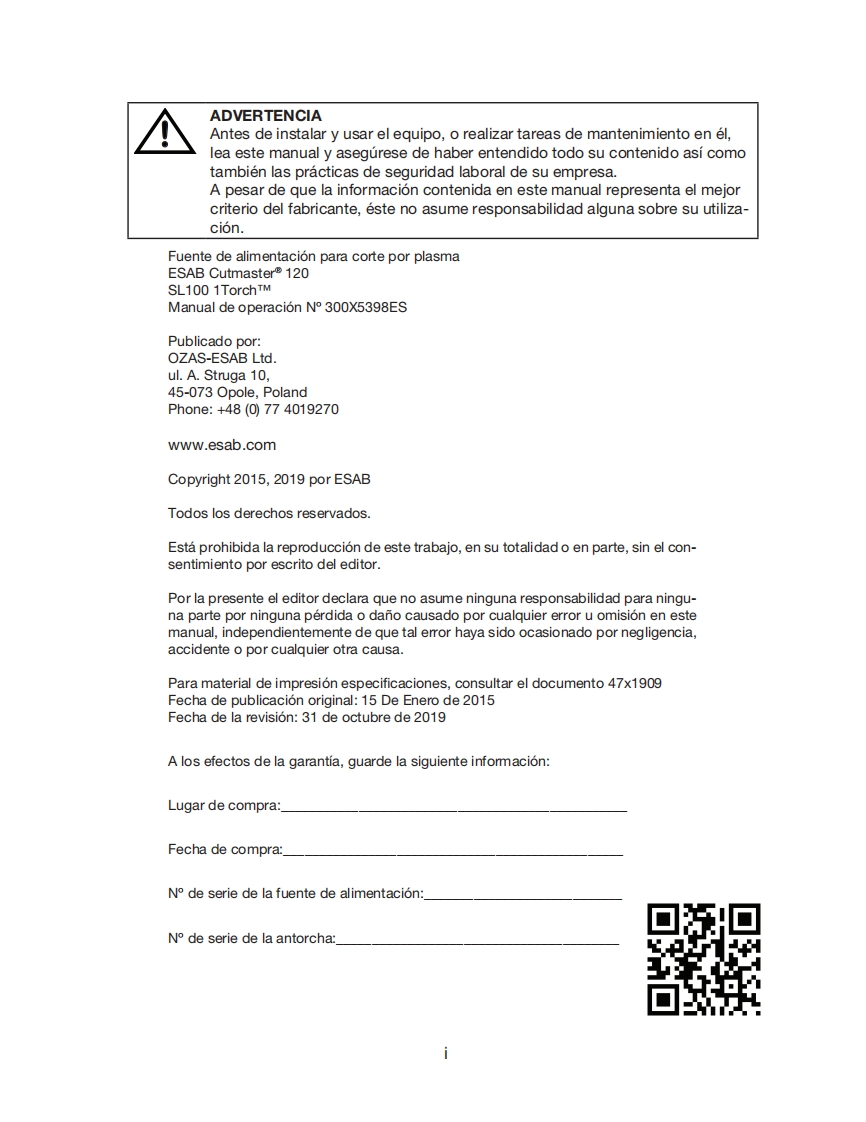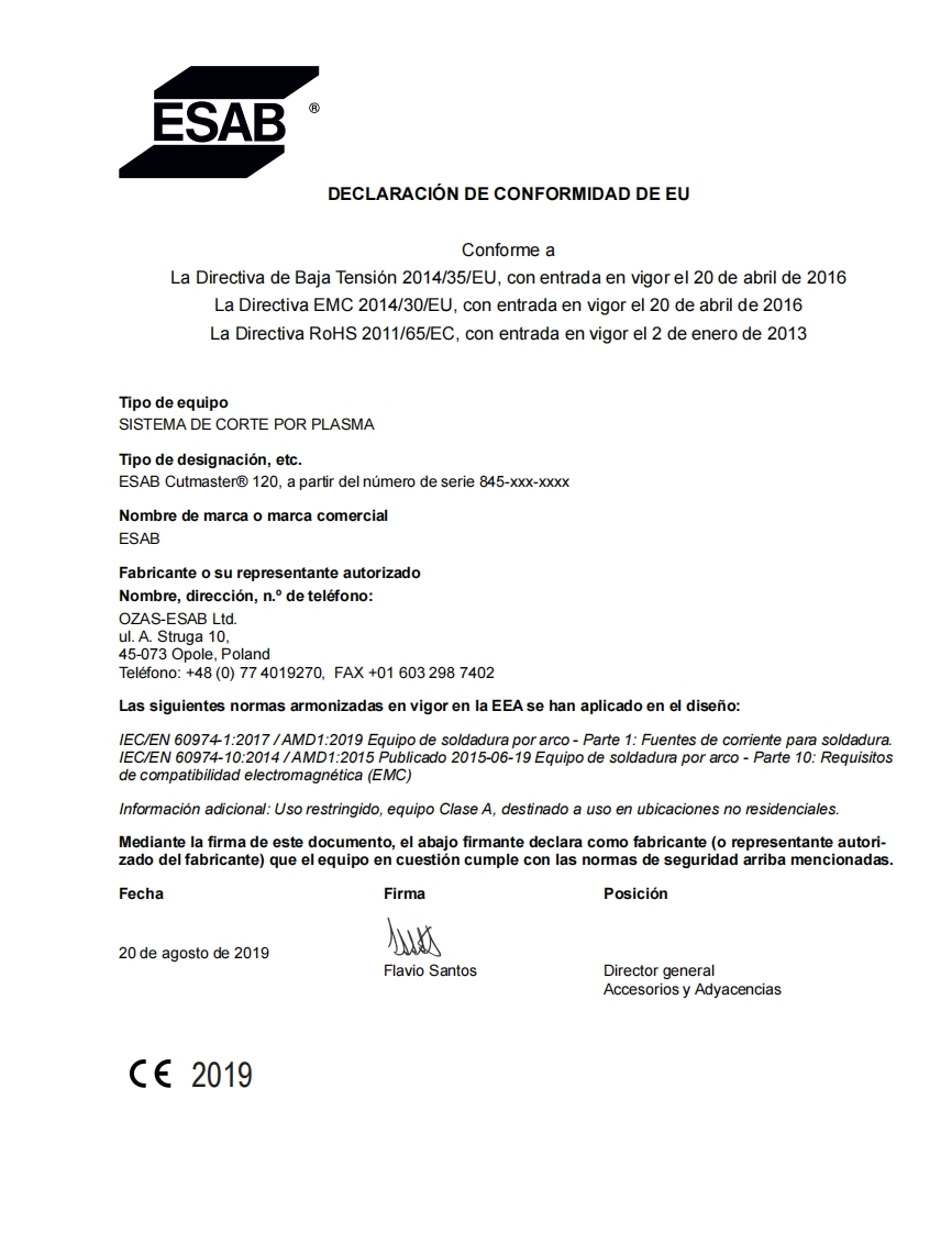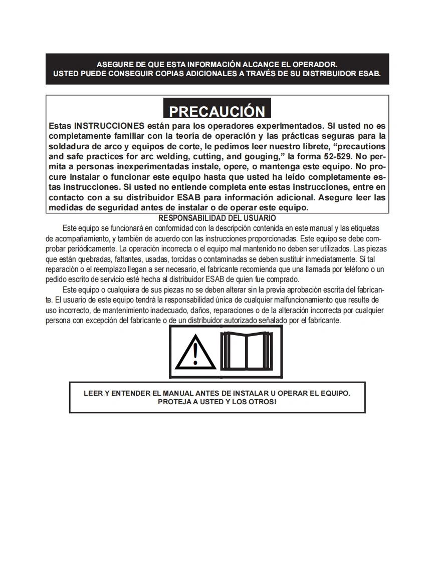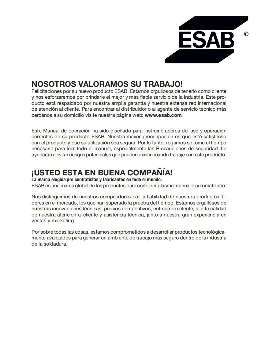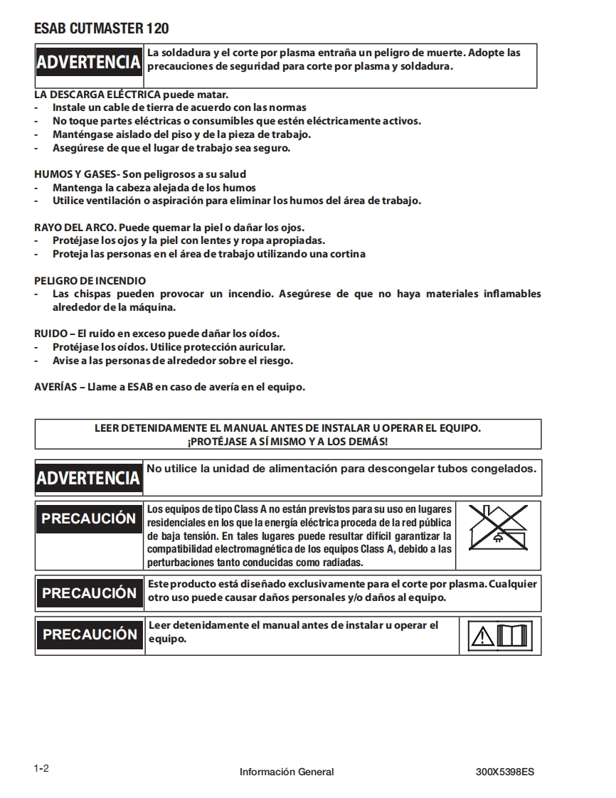 ESAB-ESAB-Cutmaster®-120操作手册含电器原理图找手册网24天前发布关注私信11.67MB78页040ESAB-ESAB-Cutmaster®-120操作手册含电器原理图此内容为付费资源,请付费后查看¥19¥21黄金会员免费钻石会员免费登录购买付费资源 第1页 / 共78页 第2页 / 共78页 第3页 / 共78页 第4页 / 共78页 第5页 / 共78页 第6页 / 共78页 第7页 / 共78页 第8页 / 共78页 第9页 / 共78页 第10页 / 共78页 试读已结束,还剩68页,您可下载完整版后进行离线阅读 THE ENDESAB焊机/林肯焊机 文本预览 ESABESAB Cutmaster⑧120SISTEMA DE CORTE POR PLASMASL100 1TorchTMManual deoperacionA如#A-12776ESDC1203 FASE400NAMPS((esab.euRevision:AFFecha de emision:31 de octubre de 2019 Manual No.:300X5398ES 查看更多 收起部分 喜欢就支持一下吧收藏