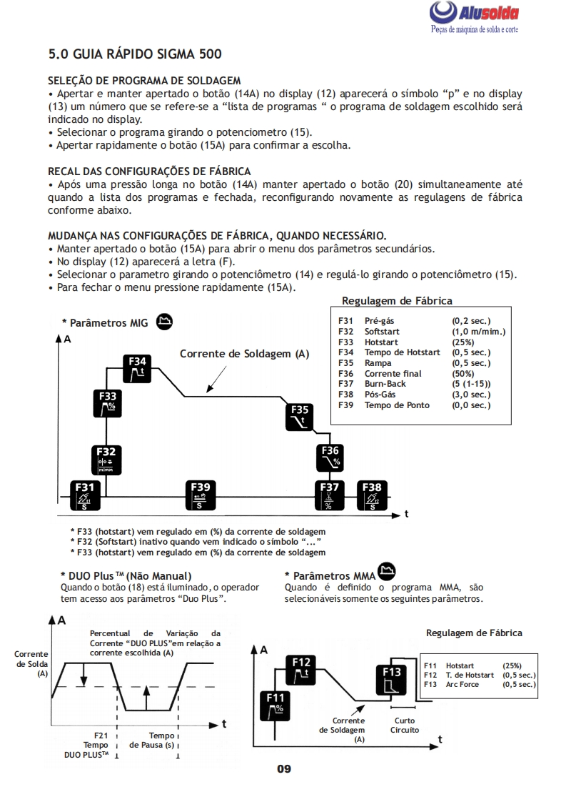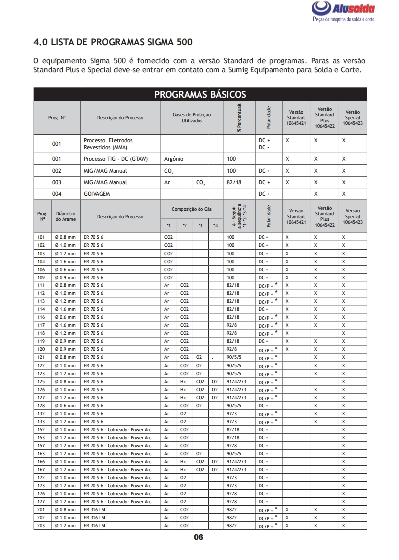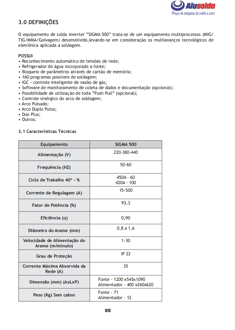 早只飞AlusoldaSUMIG币MANUAL DE INSTRUCǒESSUGSIGMA。+巨6SIGMA 500MULTIPROCESSOImportante:Este manual foi redigido para soldadores:Leia-o atentamente antes deImportante:Leia o manual atentamente antes de utilizar o equipamento.Em caso de inexperienciaou se nao conhecer os metodos e o funcionamento seguro,contate um tecnico.Nao tente instalar,utilizar,nem efetuar a manutencao do equipamento,sem a qualificacao necessaria,ler e entenderas instrucoes do manual e mantenha uma copia deste manual junto a maquina.Este manual foiconcebido para atender as necessidades de utilizacao do equipamento e esta de acordo com aNormativa Regulamentadora(NR 12)do Ministerio do Trabalho,ultima revisao 12/2011.Em caso de duvidas a respeito da instalacao e utilizacao,contate a SUMIG pelo Tel:+55 54 3220-3900Caxias do Sul RS-CNPJ 92.236.629/0001-53 CREA-RS 165254