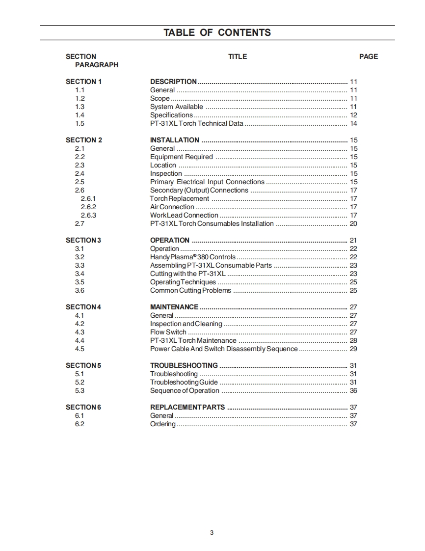 ESABHandyPlasma®380PlasmarcTM Cutting SystemHandyPlasma 380This manual provides complete instructions for the following HandyPlasma 380 cutting system(machine and PT-31XL torch)starting with Serial No.PPOR347001:ESAB P/N0558004441-230V,1-Phase,50/60HzInstruction Manual05580046150712004