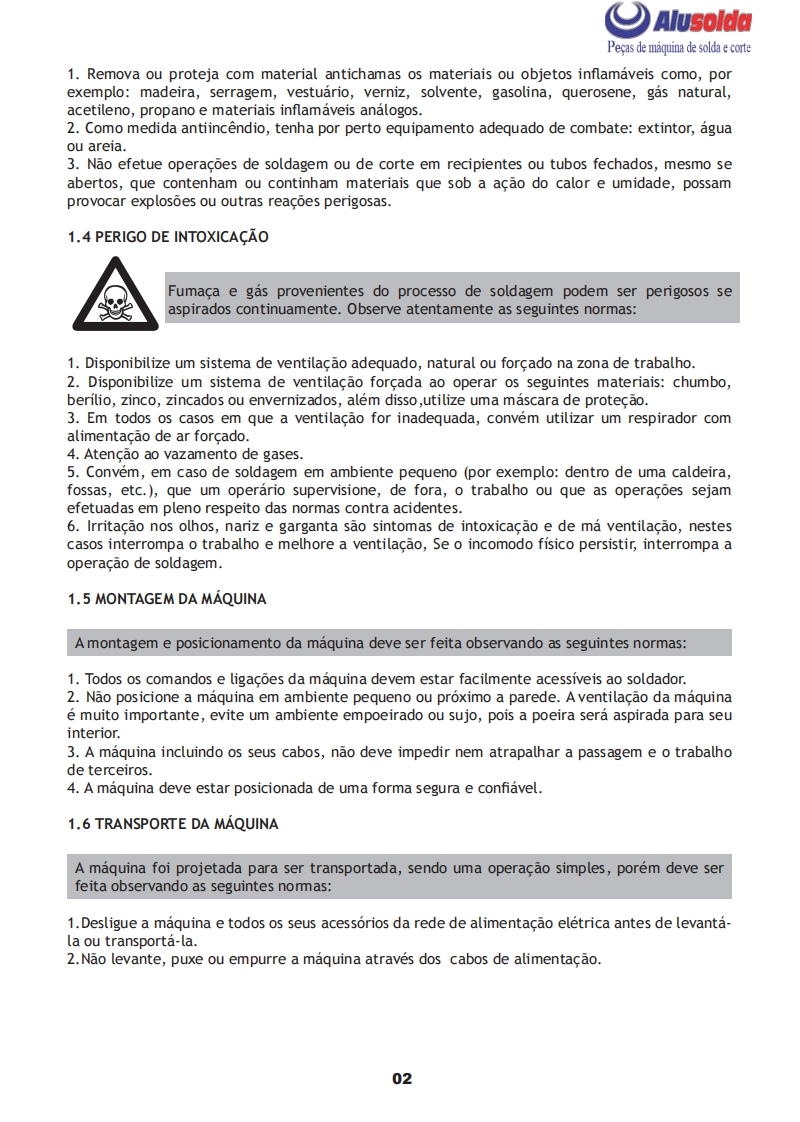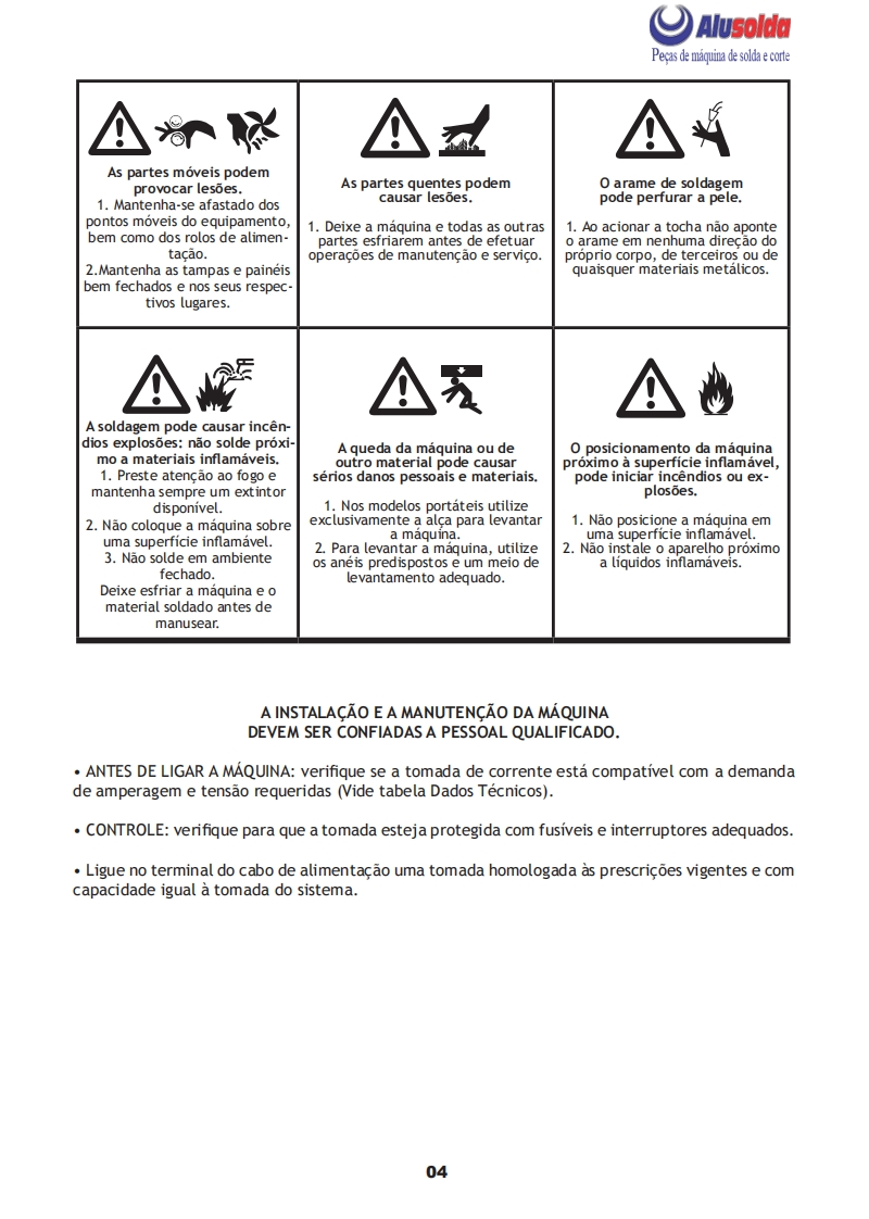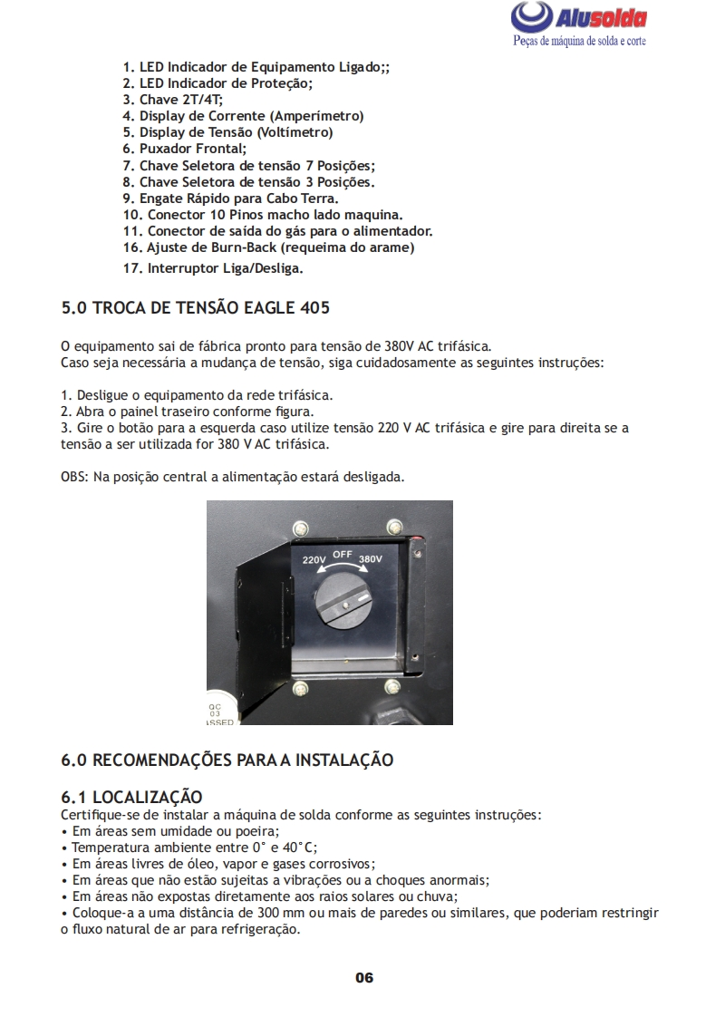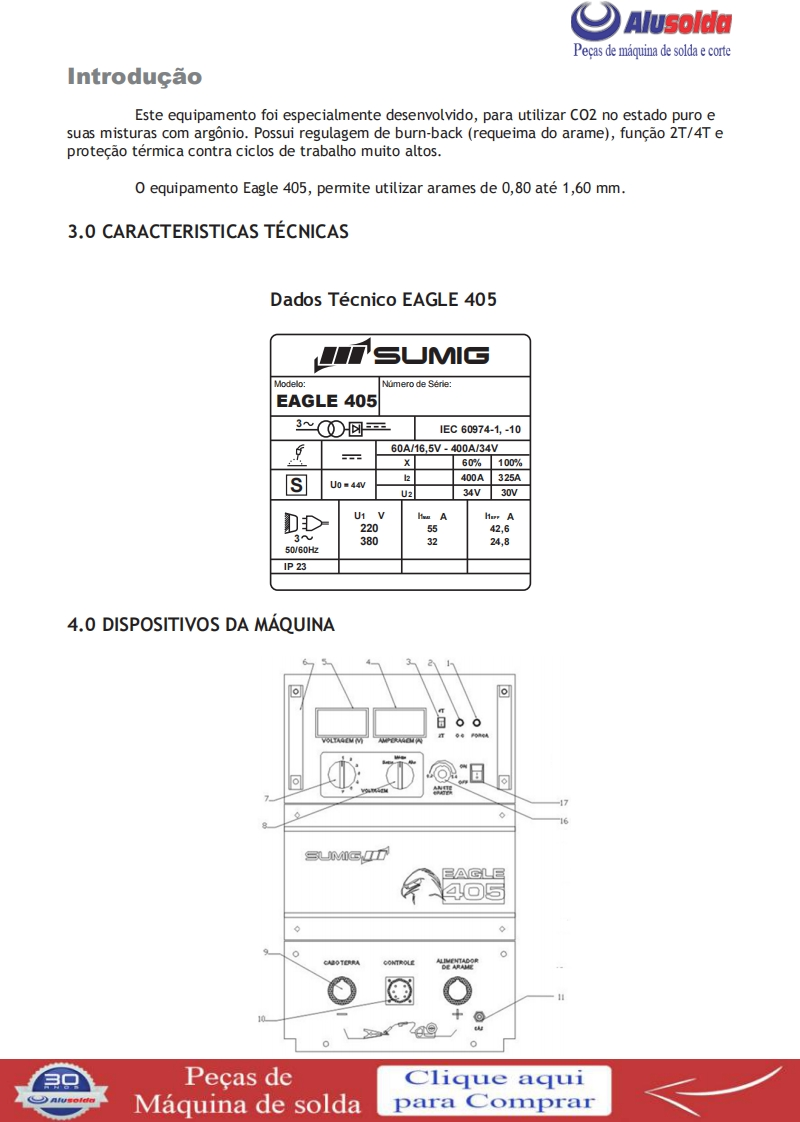 口AlusoldaSUMIGMANUAL DE INSTRUCOESSUMIGSUMIGMG EAGLE 405Importante:Este manual foi redigido para soldadores:Leia-o atentamente antes deImportante:Leia o manual atentamente antes de utilizar o equipamento.Em caso de inexperienciaou se nao conhecer os metodos e o funcionamento seguro,contate um tecnico.Nao tente instalar,utilizar,nem efetuar a manutencao do equipamento,sem a qualificacao necessaria,ler e entenderas instrucoes do manual e mantenha uma copia deste manual junto a maquina.Este manual foiconcebido para atender as necessidades de utilizacao do equipamento e esta de acordo com aNormativa Regulamentadora (NR 12)do Ministerio do Trabalho,ultima revisao 12/2011.Em caso de duvidas a respeito da instalacao e utilizacao,contate a SUMIG pelo Tel:+55 54 3220-3900Caxias do Sul RS CNPJ 92.236.629/0001-53 CREA-RS 165254