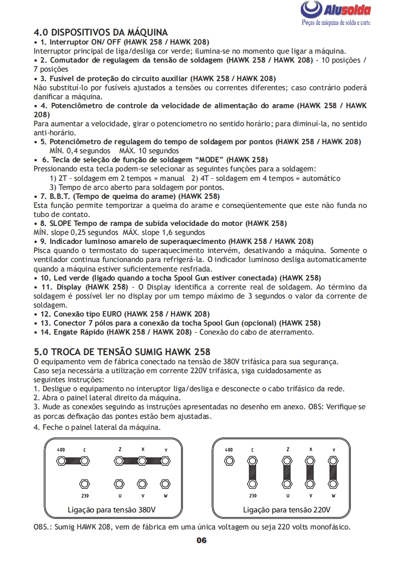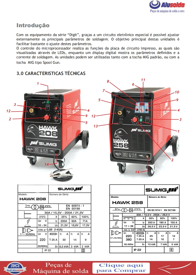 SUMIGEQUIPAMENTOSMANUAL DE INSTRUCǒESHAWK208SUMIG如國温一围SUMIG258都图盟MIG HAWK 208e HAWK 258Importante:Este manual foi redigido para soldadores:Leia-o atentamente antes deutilizar a maquina.Em caso de inexperiencia ou se nao conhecer os metodos e ofuncionamento seguro da maquina,contate um tecnico.Nao tente instalar,utilizar,nem efetuar a manutencao da maquina,sem adquirir a experiencia necessaria,lere entender as instrucoes do manual.Em caso de duvidas a respeito da instalacao eutilizacao desta maquina,contate a Sumig.