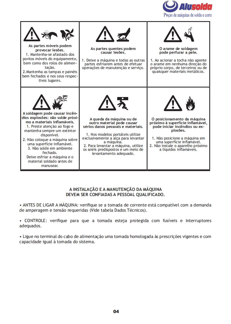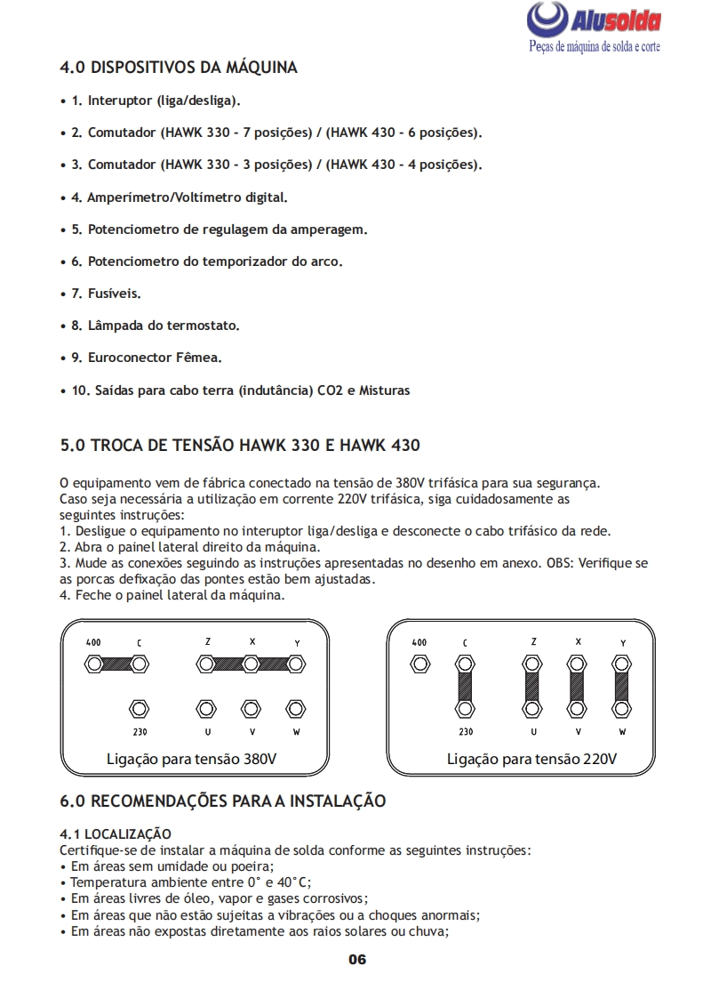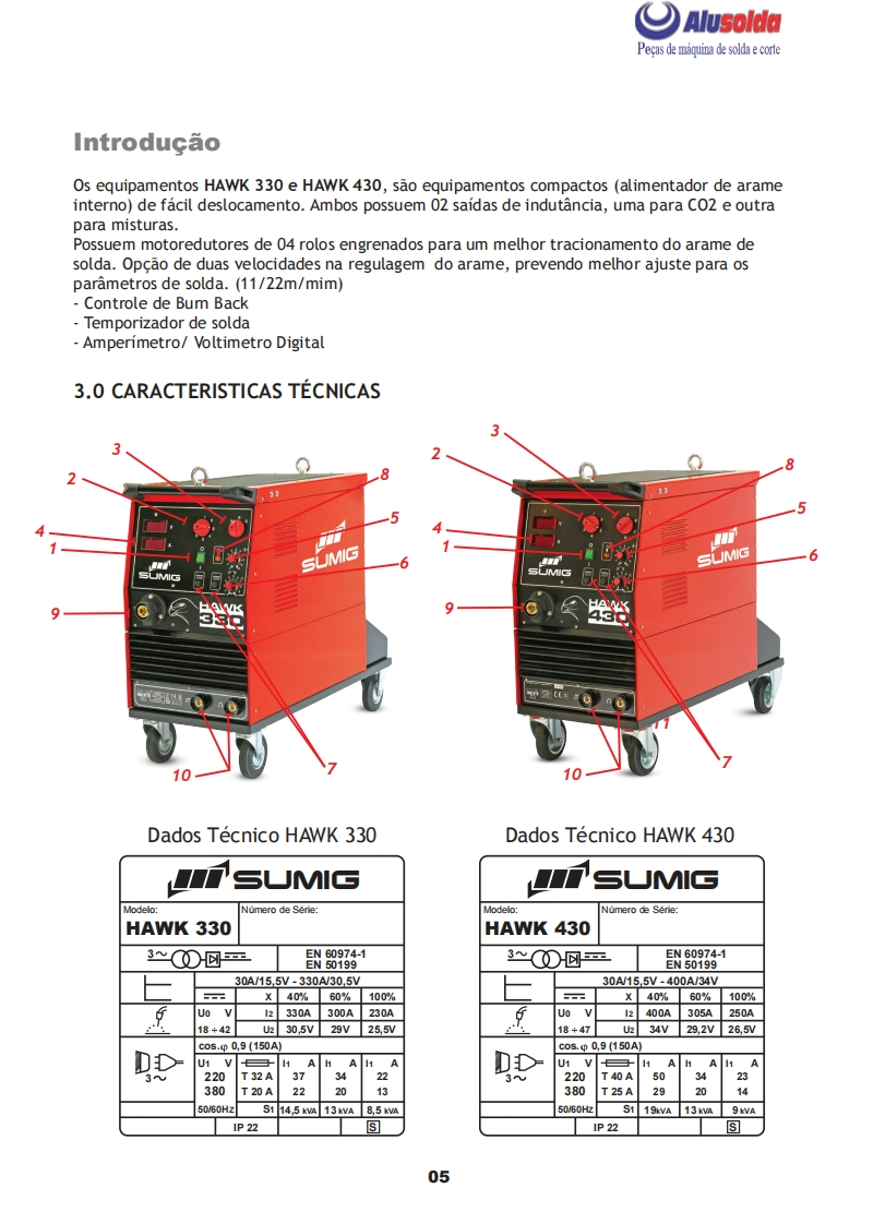 卓只AlusoldaSUMIG=QUIPAMENT▣三MANUAL DE INSTRUCǒESSUMIG8336SUMIGMIG HAWK 330eHAWK 430是Importante:Este manual foi redigido para soldadores:Leia-o atentamente antes deutilizar a maquina.Em caso de inexperiencia ou se nao conhecer os metodos e ofuncionamento seguro da maquina,contate um tecnico.Nao tente instalar,utilizar,岳nem efetuar a manutencao da maquina,sem adquirir a experiencia necessaria,lere entender as instrucoes do manual.Em caso de duvidas a respeito da instalacao eutilizacao desta maquina,contate a Sumig.