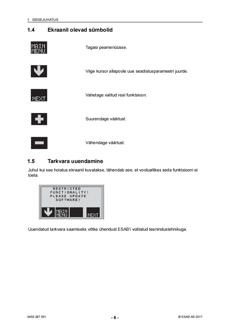 ESAB-U6-eesti操作手册含电器原理图找手册网24天前发布关注私信3.26MB48页034ESAB-U6-eesti操作手册含电器原理图此内容为付费资源,请付费后查看¥19¥21黄金会员免费钻石会员免费登录购买付费资源 第1页 / 共48页 第2页 / 共48页 第3页 / 共48页 第4页 / 共48页 第5页 / 共48页 第6页 / 共48页 第7页 / 共48页 第8页 / 共48页 第9页 / 共48页 第10页 / 共48页 试读已结束,还剩38页,您可下载完整版后进行离线阅读 THE ENDESAB焊机/林肯焊机 文本预览 ESABAristo®U6V24.0Volt8.0m/min告ROKFILL START NEXT8/AE可Kasutusjuhend0459287501EE20170331Valid for:from program version 2.14P 查看更多 收起部分 喜欢就支持一下吧收藏