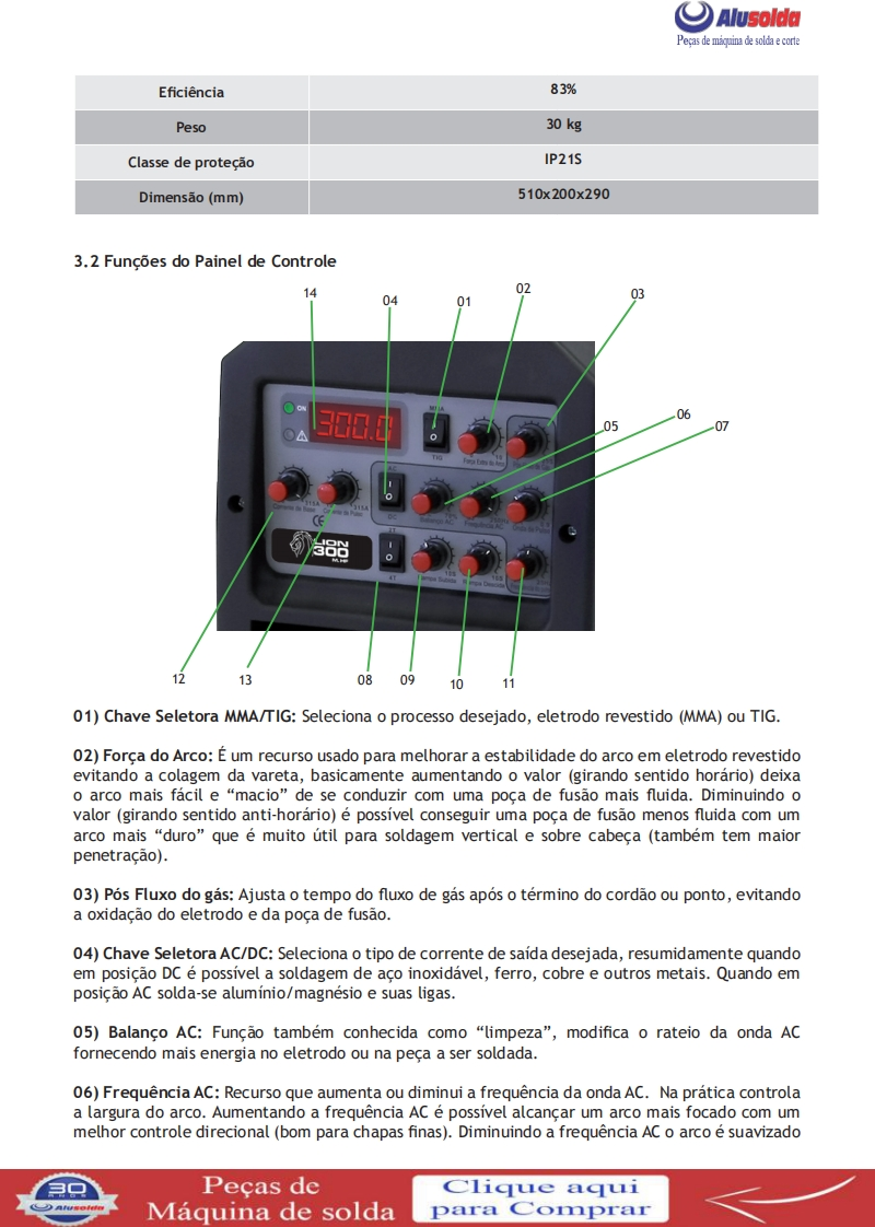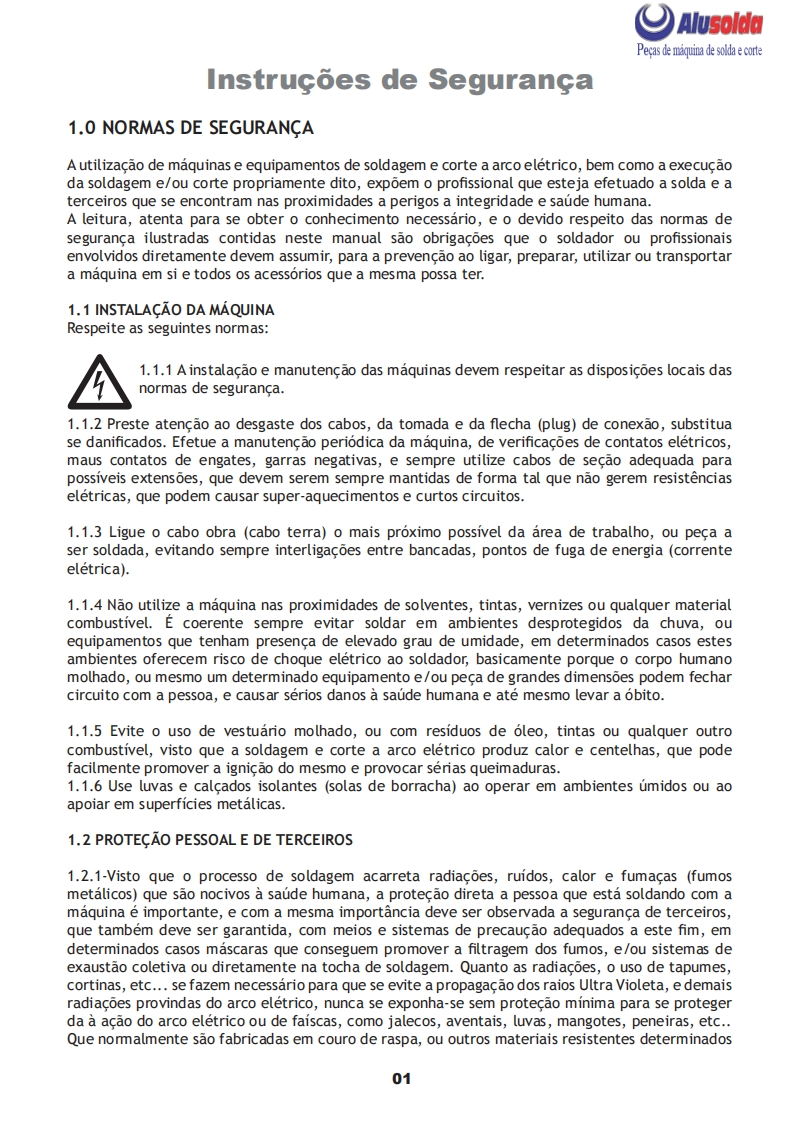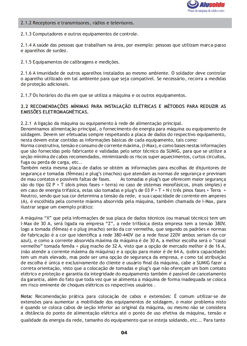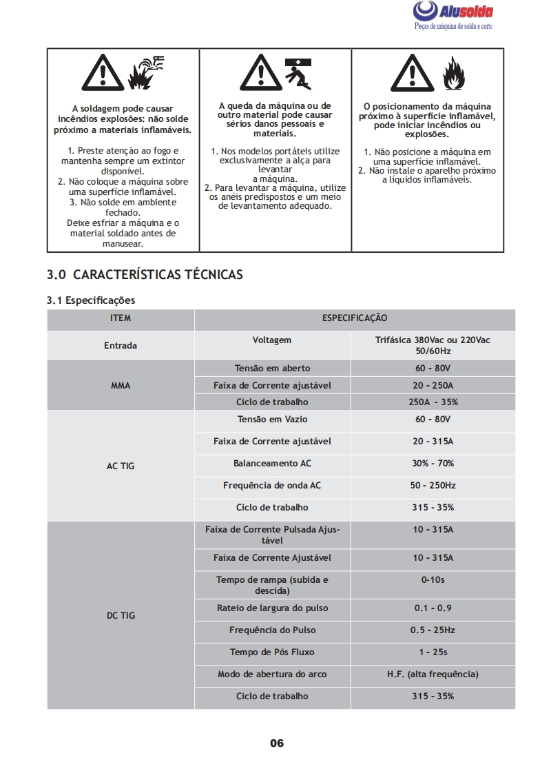 AlusoldaSUMIGúMANUAL DE INSTRUCOES5孔m6D8TIG AC/DC/MMA LION 300Importante:Este manual foi redigido para soldadores:Leia-o atentamente antes deImportante:Leia o manual atentamente antes de utilizar o equipamento.Em caso de inexperienciaou se nao conhecer os metodos e o funcionamento seguro,contate um tecnico.Nao tente instalar,utilizar,nem efetuar a manutencao do equipamento,sem a qualificacao necessaria,ler e entenderas instrucoes do manual e mantenha uma copia deste manual junto a maquina.Este manual foiconcebido para atender as necessidades de utilizacao do equipamento e esta de acordo com aNormativa Regulamentadora (NR 12)do Ministerio do Trabalho,ultima revisao 12/2011.Em caso de duvidas a respeito da instalacao e utilizacao,contate a SUMIG pelo Tel:+55 54 3220-3900Caxias do Sul RS-CNPJ 92.236.629/0001-53 CREA-RS 165254