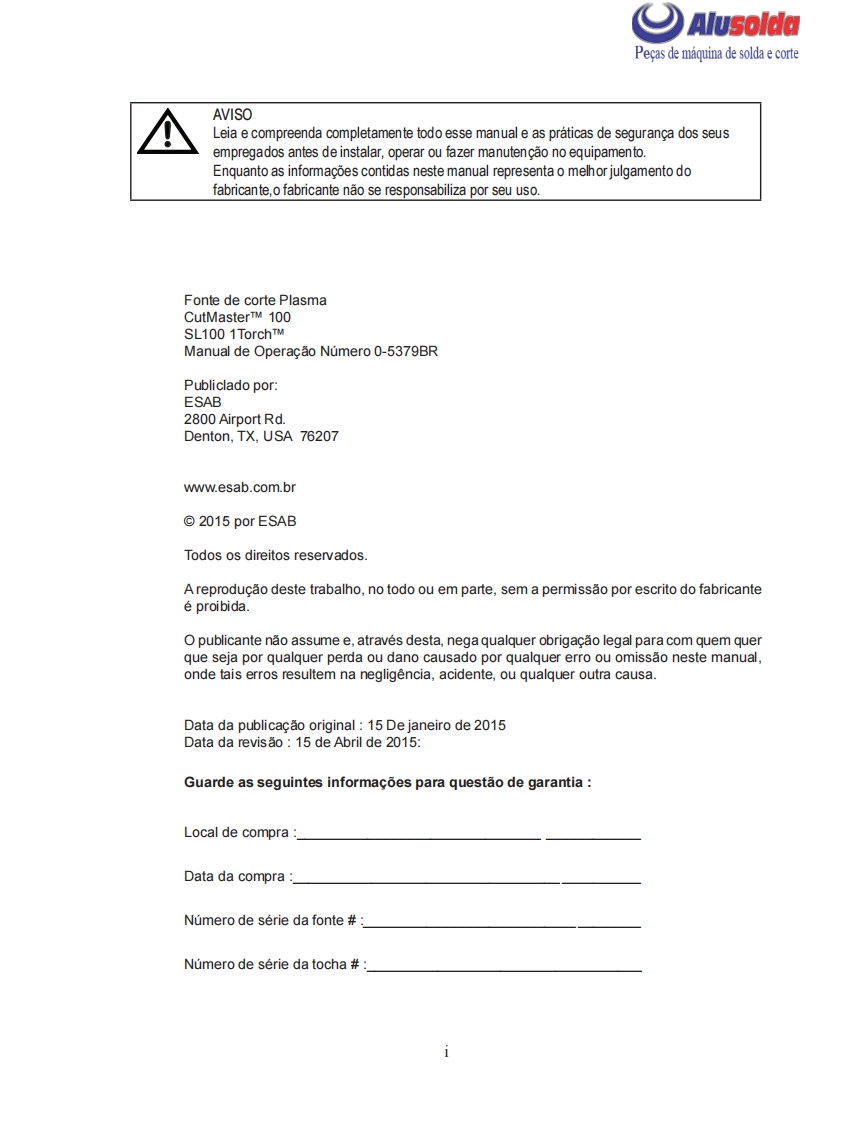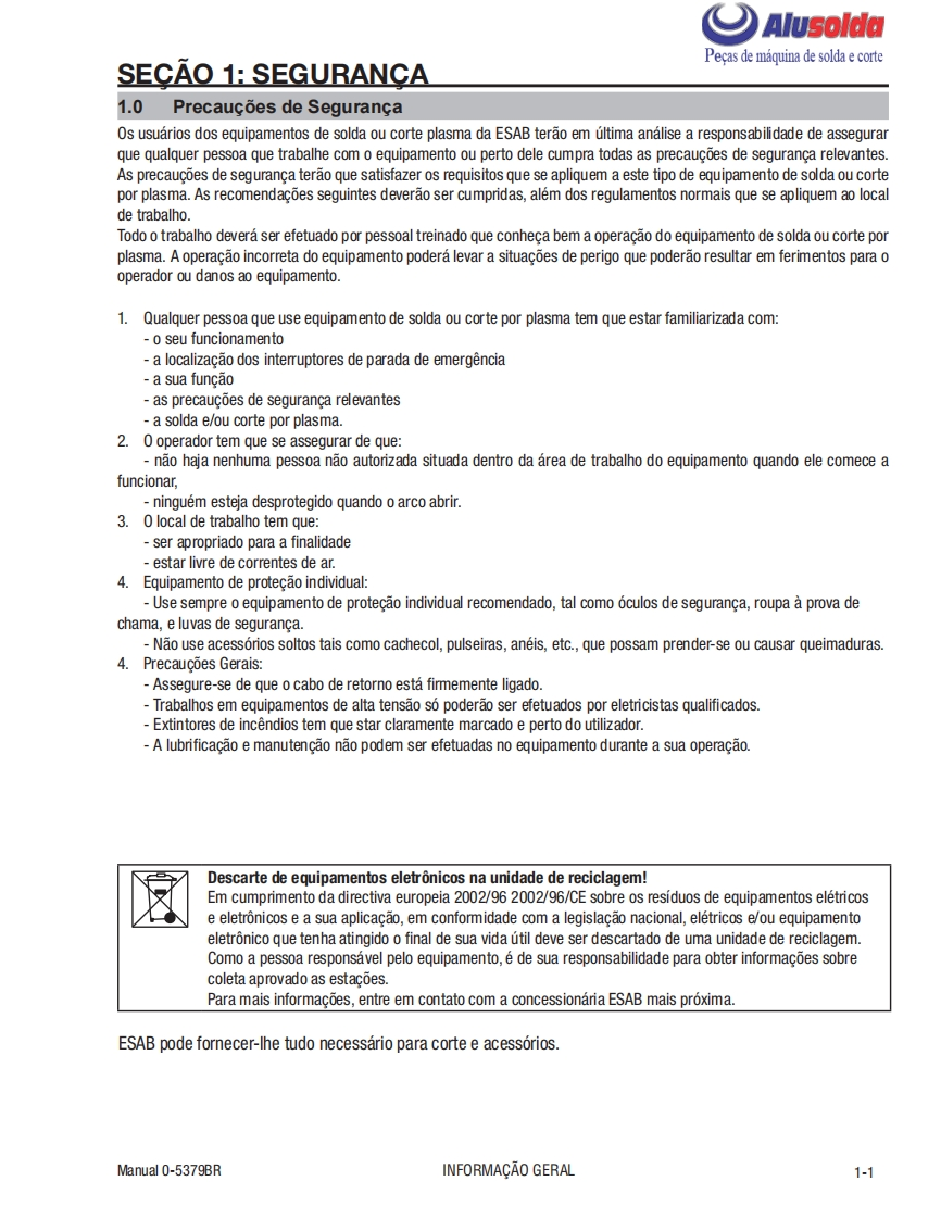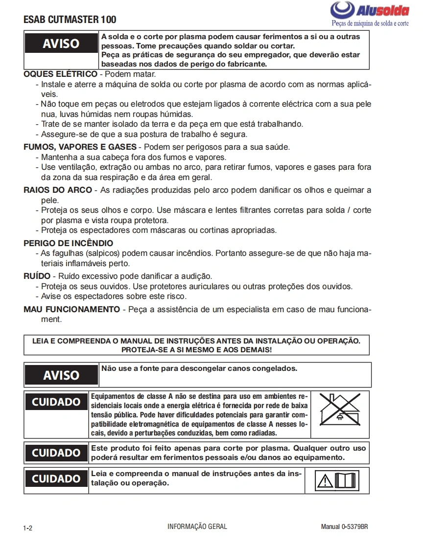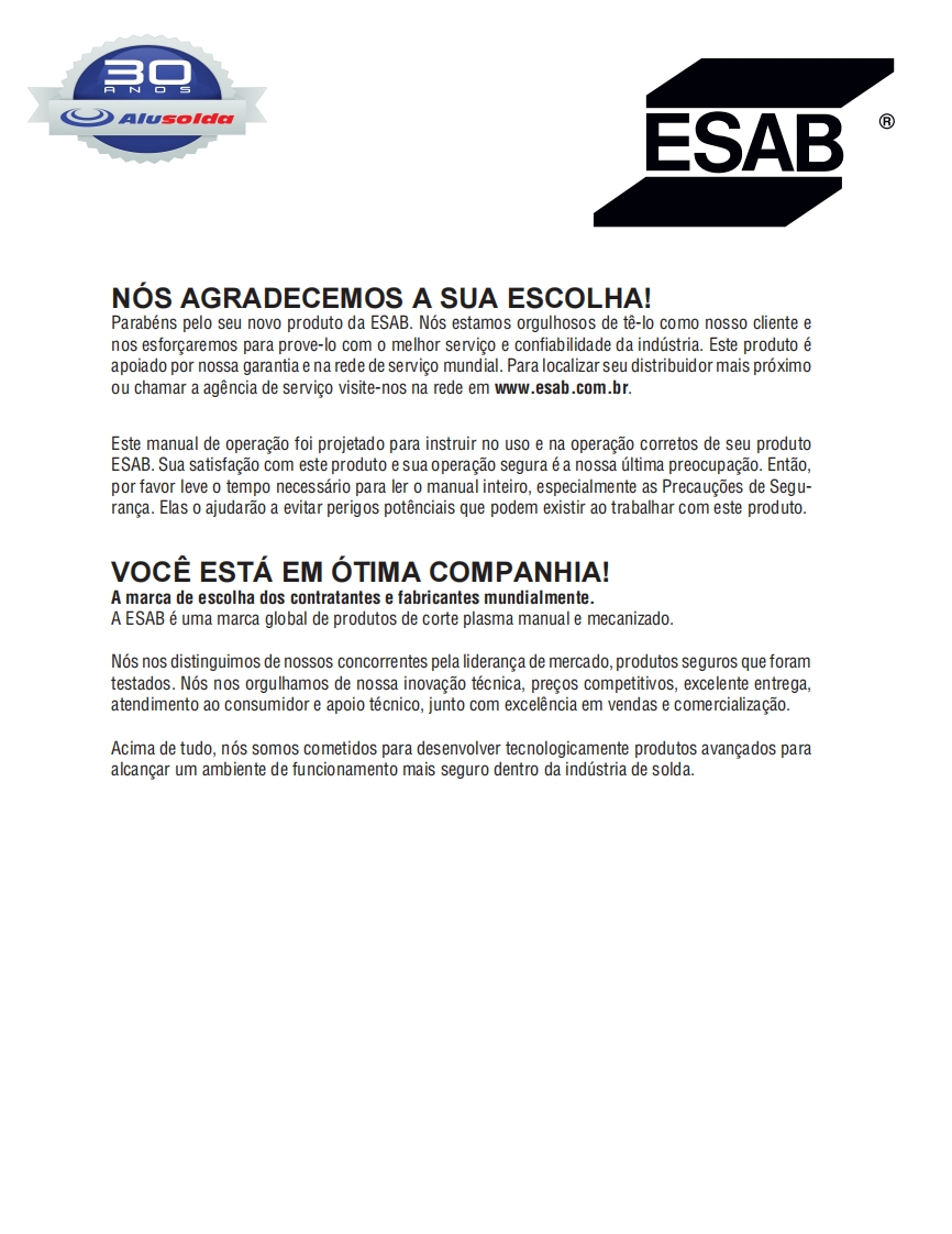 ESAB_CUTMASTER_100操作手册含电器原理图找手册网25天前发布关注私信6.58MB76页044ESAB_CUTMASTER_100操作手册含电器原理图此内容为付费资源,请付费后查看¥19¥21黄金会员免费钻石会员免费登录购买付费资源 第1页 / 共76页 第2页 / 共76页 第3页 / 共76页 第4页 / 共76页 第5页 / 共76页 第6页 / 共76页 第7页 / 共76页 第8页 / 共76页 第9页 / 共76页 第10页 / 共76页 试读已结束,还剩66页,您可下载完整版后进行离线阅读 THE ENDESAB焊机/林肯焊机 文本预览 只AlusoldaESABESAB Cutmaster®1O0ISTEMA DE CORTE PLASMASL100 1TORCHTMManual deOperacaoA如4A-127728R_A8100ccFASE3FASES208/230400V460VAMPSVersao:ABData:15 de Abril de 2015Manual:0-5379BResab.com.br 查看更多 收起部分 喜欢就支持一下吧收藏