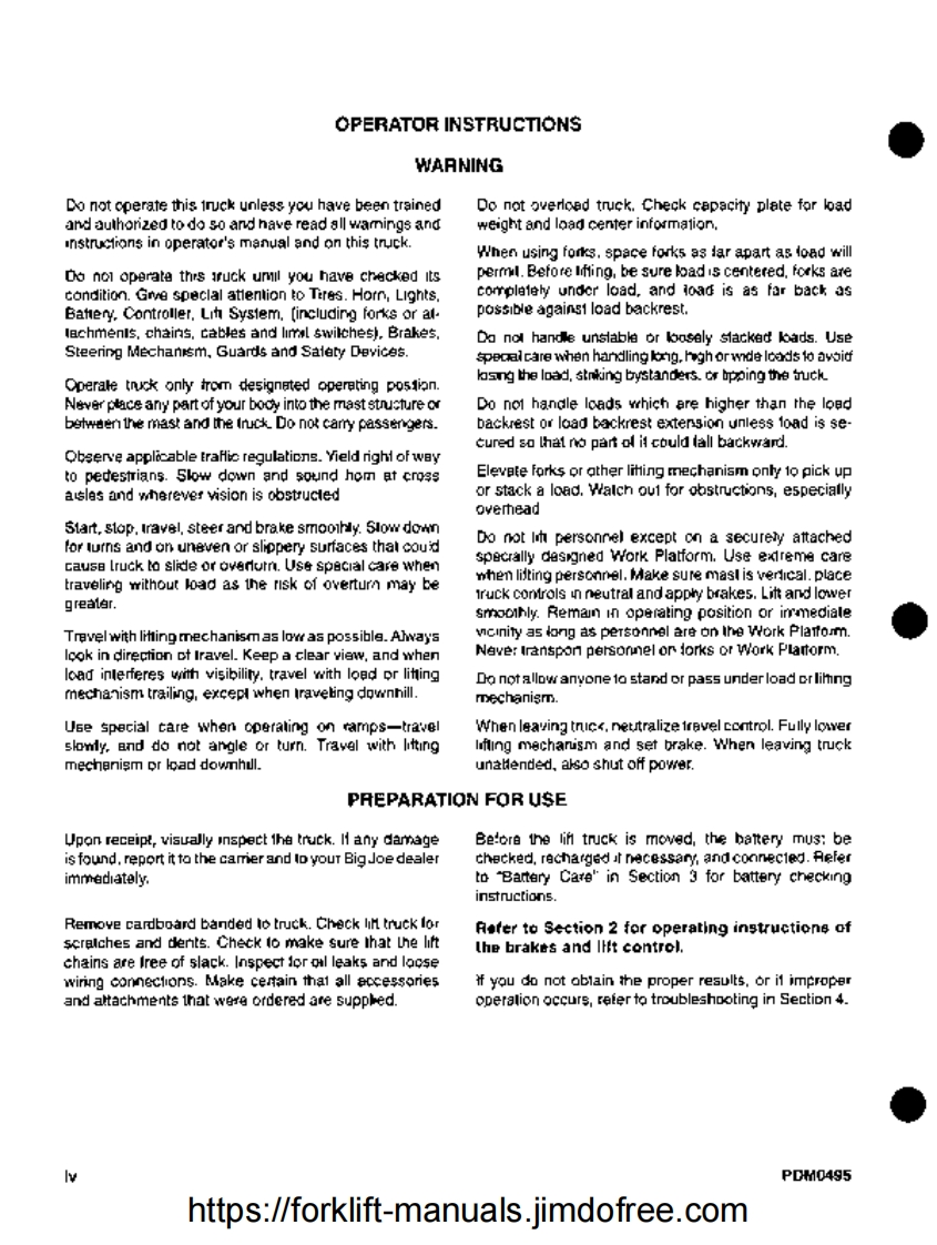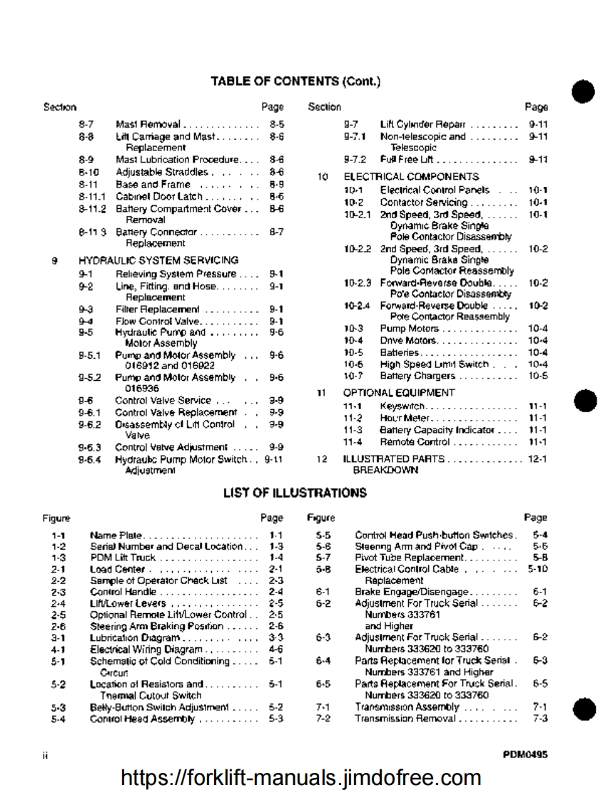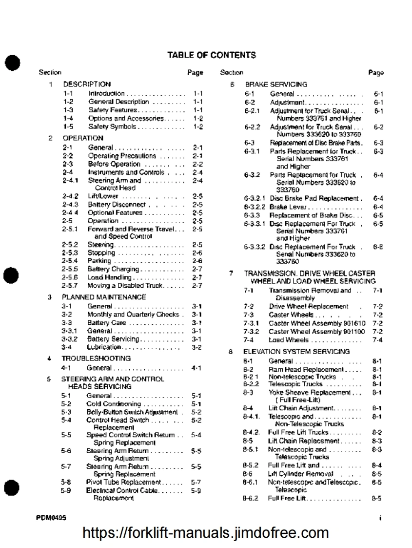 oIObE....Manual 901353Model PDM S/N 333620 and HigherThis manual is affected by the following BULLETINS:These are found in the bulletin folder of the navigation screen.BulletinRevTitle187Transistor Speed Controller207Transistor Control Head220ATransistor Control Head228Trans Controller/Contactor pan(Type E Trucks)245Battery Safety and Maintenance272Battery Quick Disconnect Cable kits318Control Arm Assembly325PDM Adjustable Straddle Supplement329ASpeed Resistor Retrofit330PDM Smart Charger 004983-01333PDM Pump Motor 016939342PDM Wal-Mart Truck356Cylinder 503568 packing change364Alltrax 12V Controller 005467-03https://forklift-manuals.jimdofree.com