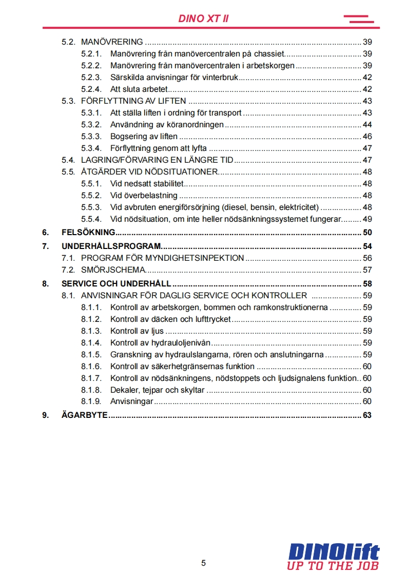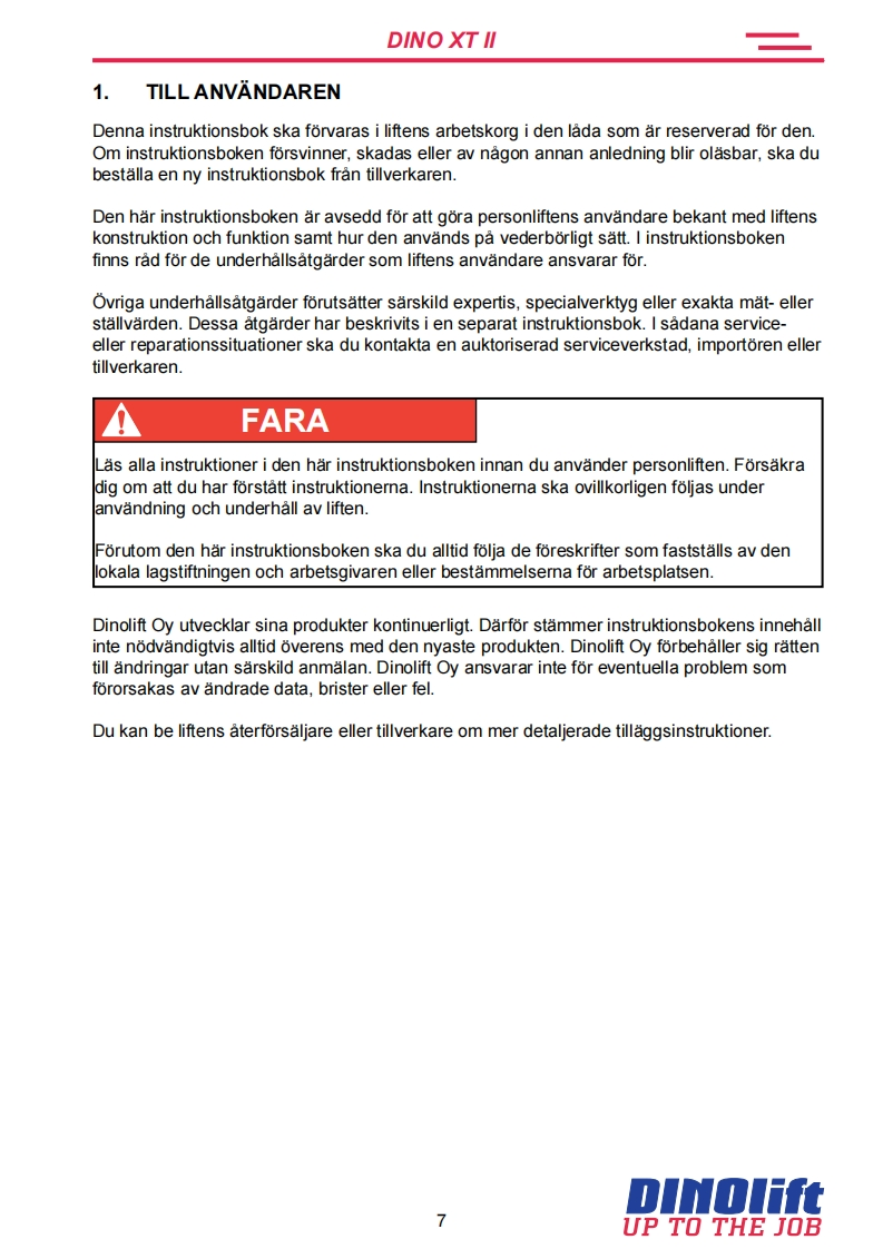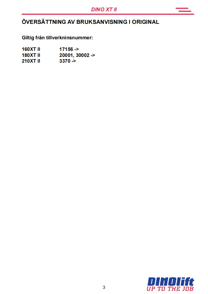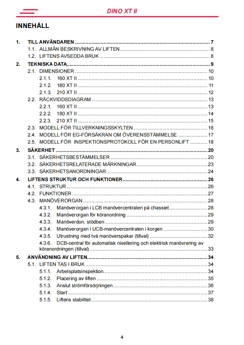 Dino_160XT_II操作与维护维修手册找手册网前天发布关注私信5.28MB65页050Dino_160XT_II操作与维护维修手册此内容为付费资源,请付费后查看¥19¥21黄金会员免费钻石会员免费立即购买您当前未登录!建议登陆后购买,可保存购买订单付费资源 第1页 / 共65页 第2页 / 共65页 第3页 / 共65页 第4页 / 共65页 第5页 / 共65页 第6页 / 共65页 第7页 / 共65页 第8页 / 共65页 第9页 / 共65页 第10页 / 共65页 试读已结束,还剩55页,您可下载完整版后进行离线阅读 THE END杭州叉车/Dino 文本预览 BRUKSANVISNING0010160XT II180XT11210XT11DINOTillverkare:Aterforsaljare:DINOlftUP TO THE JOBRaikkolantie 145FI-32210 LOIMAATel.+358201772400info@dinolift.comwww.dinolift.com 查看更多 收起部分 喜欢就支持一下吧收藏
