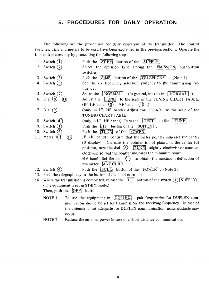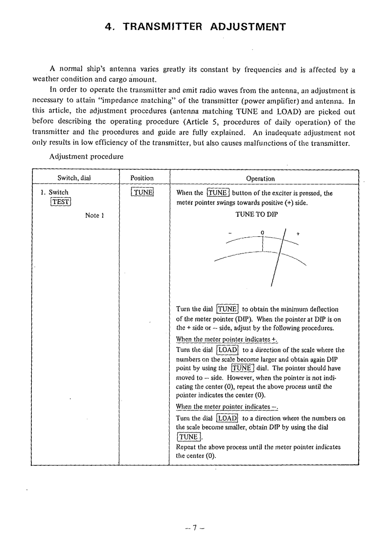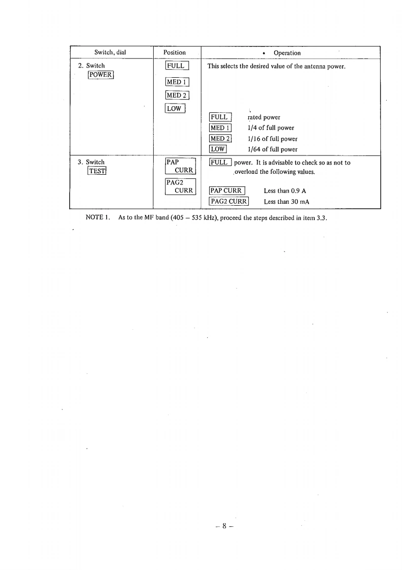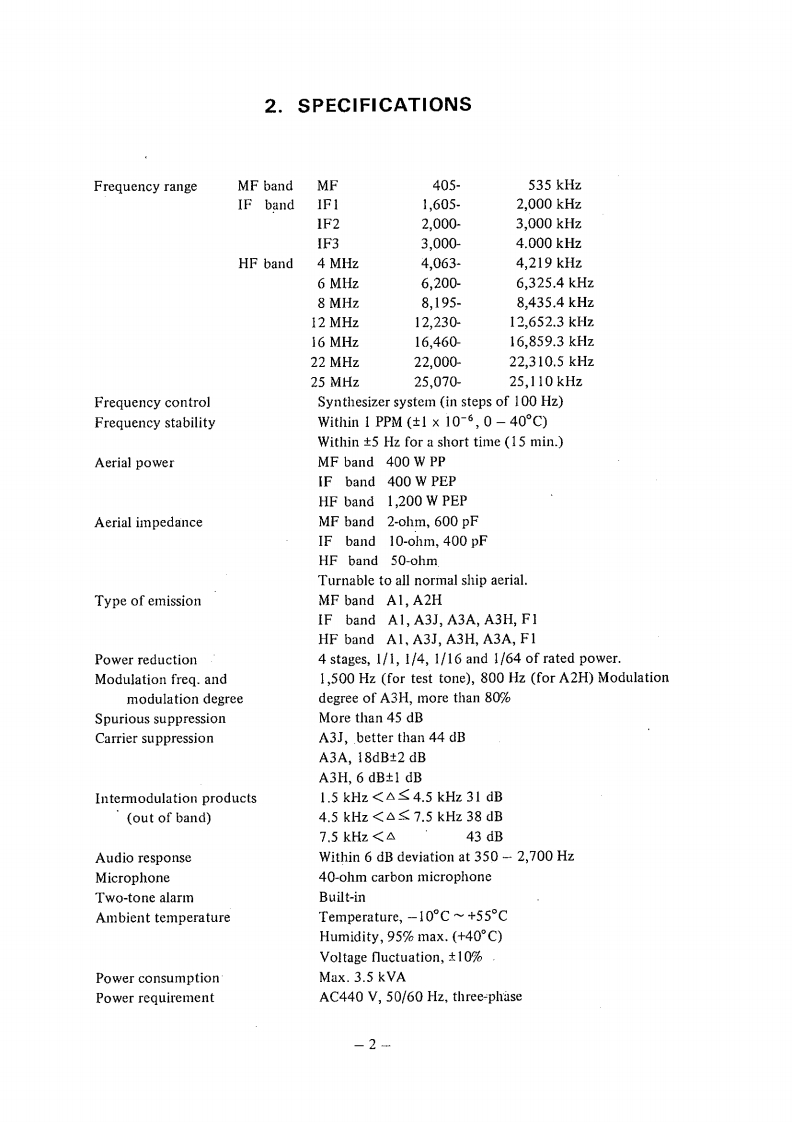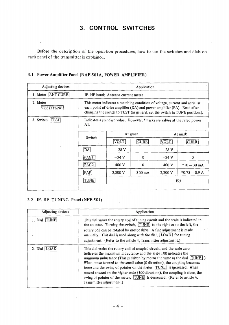 TABLE OF CONTENTSPage1.GENERAL2.SPECIFICATIONS.3.CONTROL SWITCHES3.1 Power Amplifier Panel ..............×3.2 IF.HF TUNING Panel43.3 MF TUNING Panel·...34 Eciter ..............................................54.TRANSMITTER ADJUSTMENT .........................................7,5.PROCEDURES FOR DAILY OPERATION..·.·····96.PRECAUTIONS IN TRANSMITTER HANDLING106.1 Daily Operation ........................106.2 Maintenance...............106.3 How to Use the TUNING CHART TABLE116.4 Removal and Insertion of the Power Tube(8122)116.5 Interface with Telex (TTY)..........................................116.6 When Overload Circuit Operates...........126.7 When dummy antenna is used............127.CIRCUIT INFORMATION137.】Exciter...··137.2 Power amplifier ....257.3 IF.HF TUNING ..........267.4 MF TUNING .................277.5 Power Supply Unit....................28