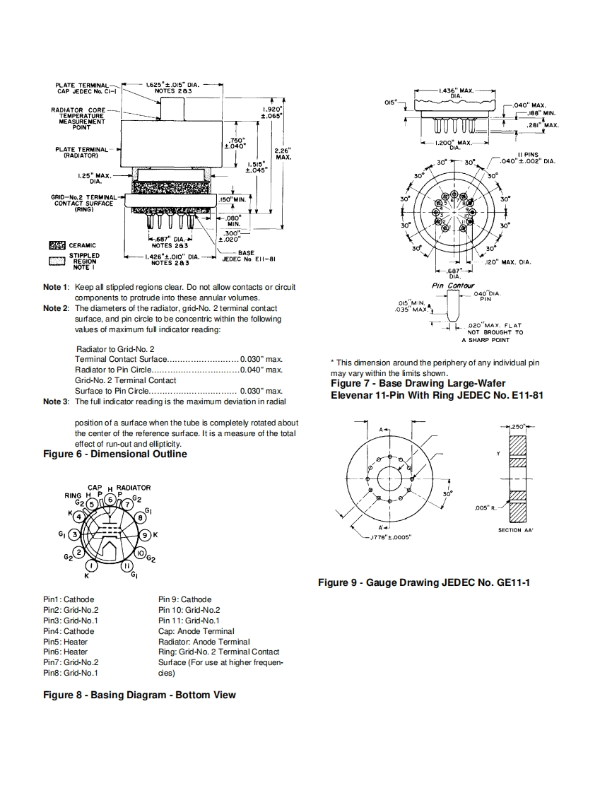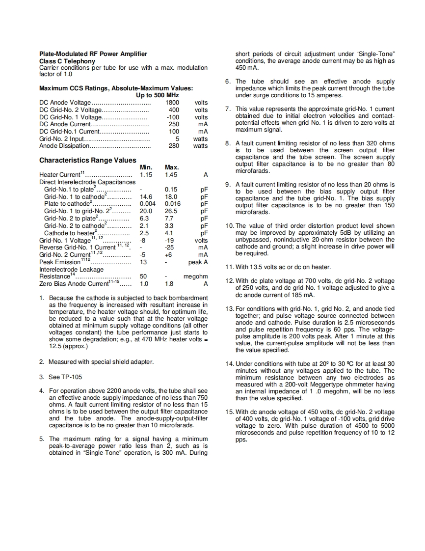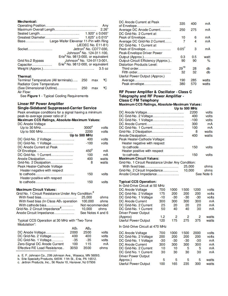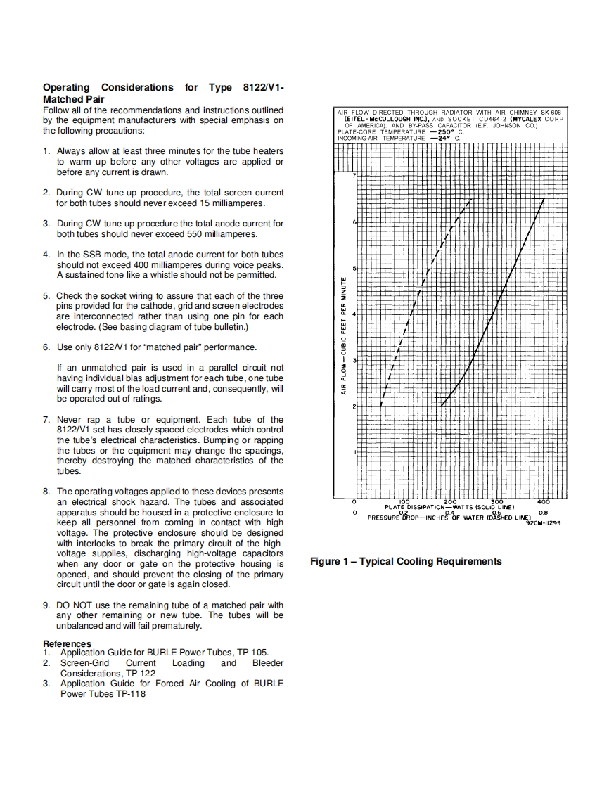 8122Power TubeLinear Beam Power TubeCoaxial-Electrode StructureCeramic Metal SealsFull Ratings up to 500 MHzForced-Air Cooled380 Watts PEP Output at 30 MHz AB570 Watts PEP Output at 30 MHz AB2300 Watts CW Output at 470 MHzMatched Pair AvailableBURLE-8122 is a very small,low-cost,forced-air-The three grid-No.1 leads to separate pinscooled beam power tube designed for use as an RFaccommodate a split-input circuit for distributedpower amplifier,oscillator,regulator,distributedamplifier service.amplifier,or linear RF power amplifier in mobile orfixed equipment.The BURLE 8122/V1 is the designation for a matchedpair of Type 8122 Beam Power Tubes for use inThe 8122 features a light-weight,cantilever-supportedequipments not having individual bias adjustment.Thiscylindrical electrode structure within a ceramic-metalpair is matched to assure balanced operation within aenvelope.This construction provides a very sturdybias range of 28 to 40 volts,so that each tube will havetube and permits high-temperature operation.an approximately equal anode current during zero-signal and signal operation.Such matching alsoThe terminal arrangement of the 8122 facilitates useassures efficient,full system operation and givesof the tube with tank circuits of the coaxial or striplineoptimum life expectancy.type.Effective isolation of the output circuit from theinput circuit is provided at the higher frequencies byGeneral Datathe low-inductance ring terminal for grid-No.2.A base-Electrical:pin termination for grid-No.2 is also available forHeater,for Unipotential Cathode:operation of the 8122 at the lower frequencies.Voltage(AC or DC)'13.5±.10%voltsCurrent at 13.5 volts1.3AThe tripod arrangement of both the cathode and theMinimum heating time60grid-No.1 leads not only simplifies construction,butMu-Factor.Grid No.2 to Grid No.1enhances electrical characteristics.The three cathodefor Anode Volts =450.Grid-No.2leads reduce the inductance path to RF ground andVolts =325,and Anode Amperes =1.212reduce the input admittance at high frequencies.Direct Interelectrode Capacitances:2Grid No.to anode.…0.15max.pFGrid No.1 to cathode.16.3This data sheet gives application informationAnode to cathode...0.01pFunique to the BURLE 8122.It is to be used inGrid No.1 to grid No 2..........23.3conjunction with the publication,"ApplicationGrid No.2 to anode.7.0Guide for BURLE Power Tubes,TP-105",forGrid No.2 to cathode.2.7Fgeneral application information.Cathode to heater.…3.3BURLE