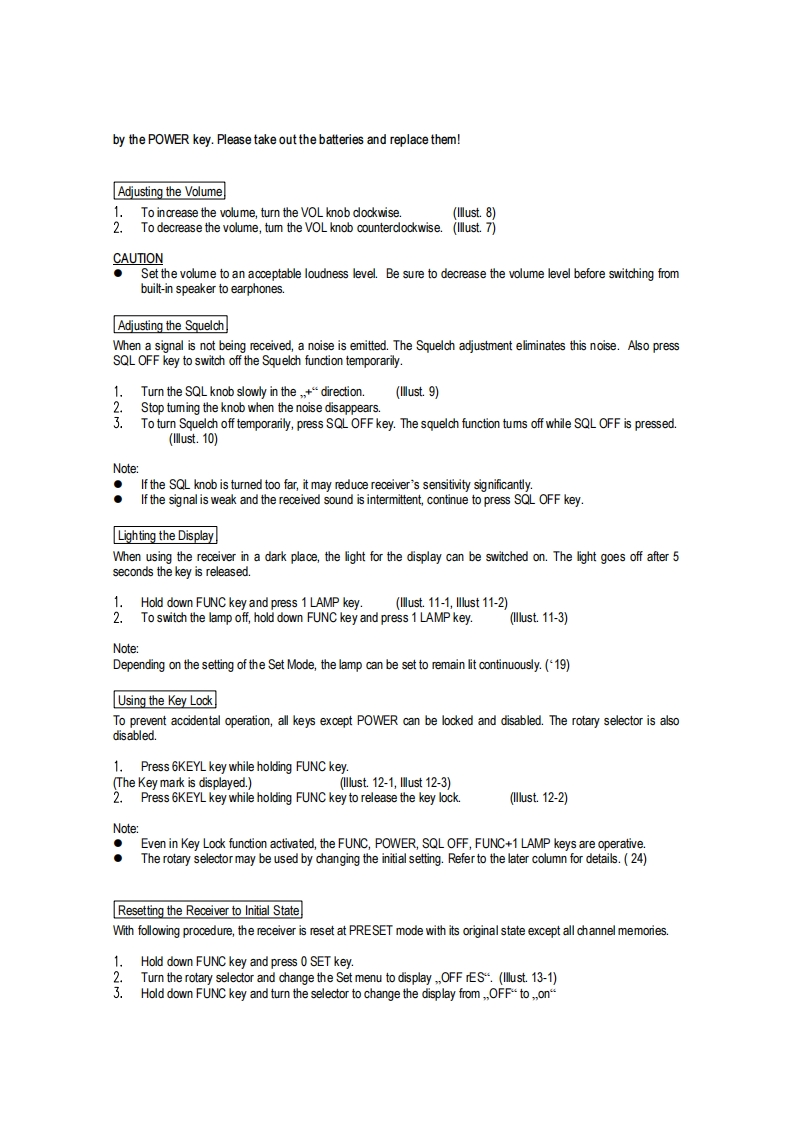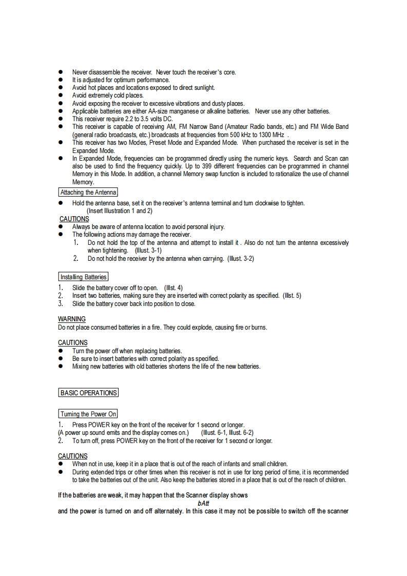 Albrecht.Kommunikationstechnik aus NorddeutschlandAX400/AE 500 H First EditionOwner's ManualThank you for purchasing our receiverFor proper use of this receiver,please read this manual thoroughly.Keep this manual in a safe place for future referenceWARNINGDo not use any batteries other than size AA Alkaline or manganese batteries.Using different batteries couldcause fire,electric shock or failure.●Do not place consumed batteries in a fire.They could explode,causing fire or burns.●Do not install or remove batteries while your hands are wet.This could cause electric shock.●In the event that smoke is emitted,a strange odor or noise is generated,or similar abnormality occurs,it couldcause fire,electric shock or breakdown.Consult your dealer immediately for the necessary instructions orrepair needed.Do not attempt to repair the receiver yourself.Doing so may lead to serious damage or physical injury●Do not attempt to disassemble or modify this product in any way.This could lead to fire,electric shock orbreakdown.CAUTIONDo not use this product for anything other than a receiver.When not in use,keep it out of the reach of infants and small children.During extended trips or other times when this product is not in use for long perods,take the batteries outKeep the batteries stored in a safe place and out of the reach of infants and small children.Discontinue use of this product if it has a negative influence on TV,electronic device,therapeutic devices andor other equipment.●Always be aware of antenna location to avoid personal injury.●When conducting routine maintenance,be sure to disconnect the power for additional safety.Do not place this product in locations with extreme temperature,high humidity or excessive dust.Do not keepit in an automobile.It could lead to fire,electric shock or breakdown.NOTICEUnauthorized use of the contents of radio communications or divulging its contents to other parties is prohibited bylawINTRODUCTION
