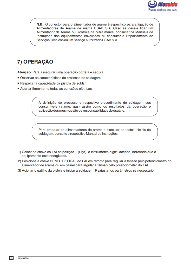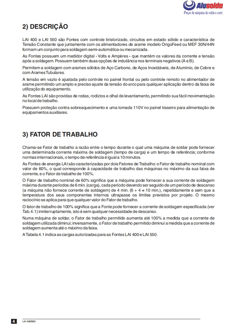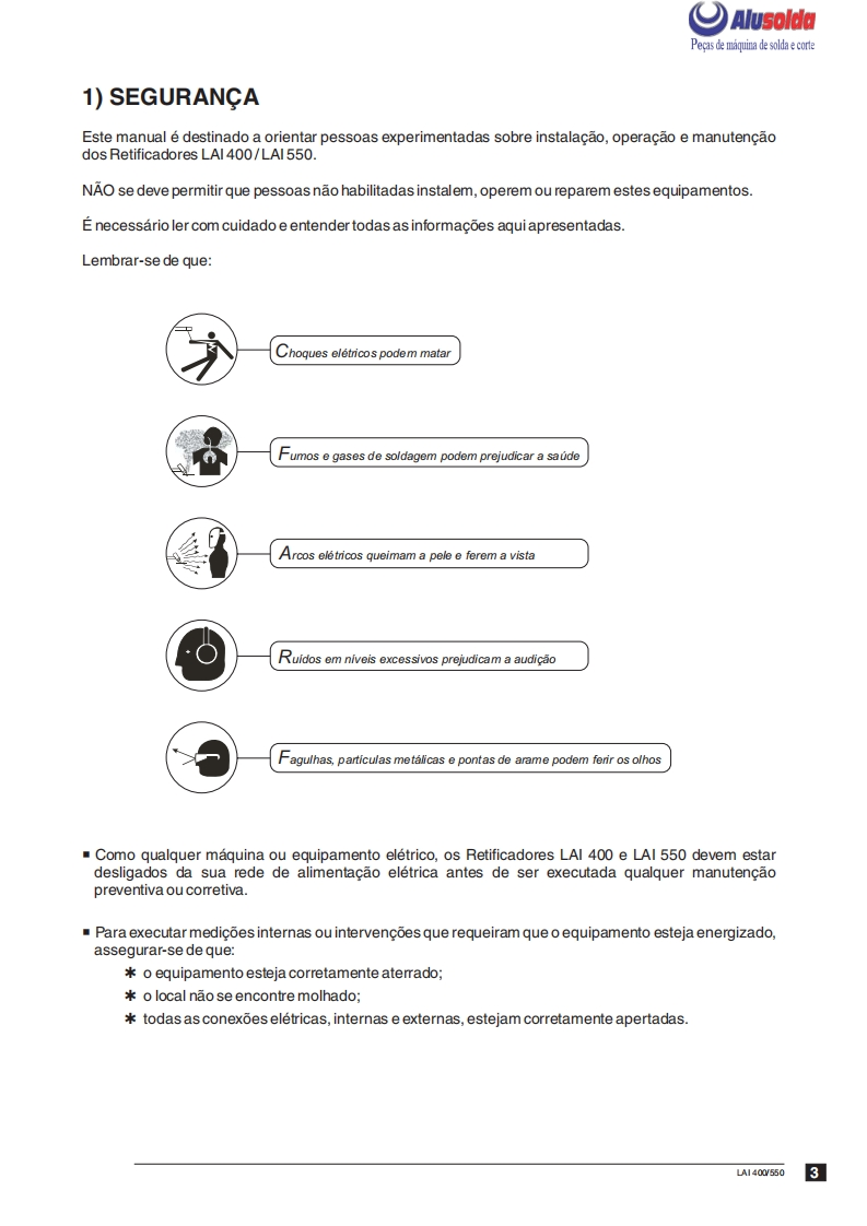早只AlusoldaESABLA1400/550Retificadores para soldasemi-automaticaESAB LAI 550ESAB LAI 400ESABManual do usuario e pecas de reposicaoReferenciaLA1400:0400057LA1550:0400067A ESAB se reserva o direito de alterar as especificagbes sem previo aviso.0206112082008Valido para n de serie a partir de FXXXXXX