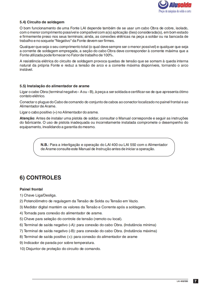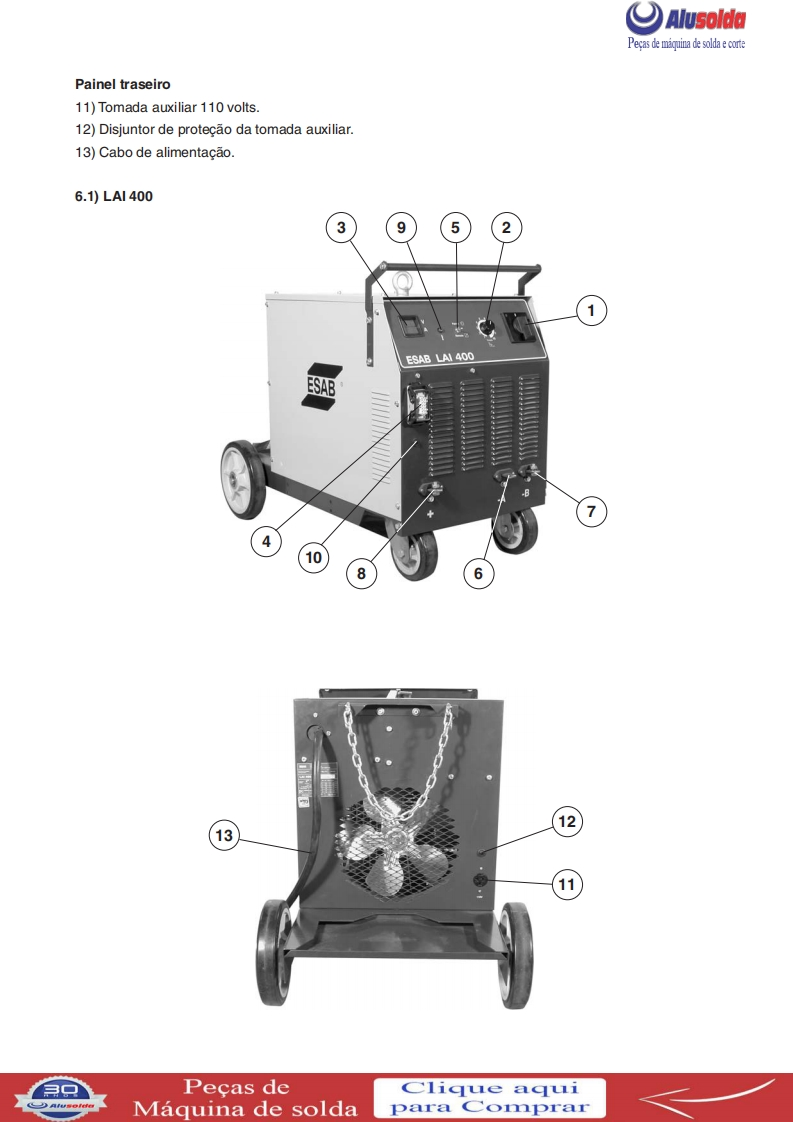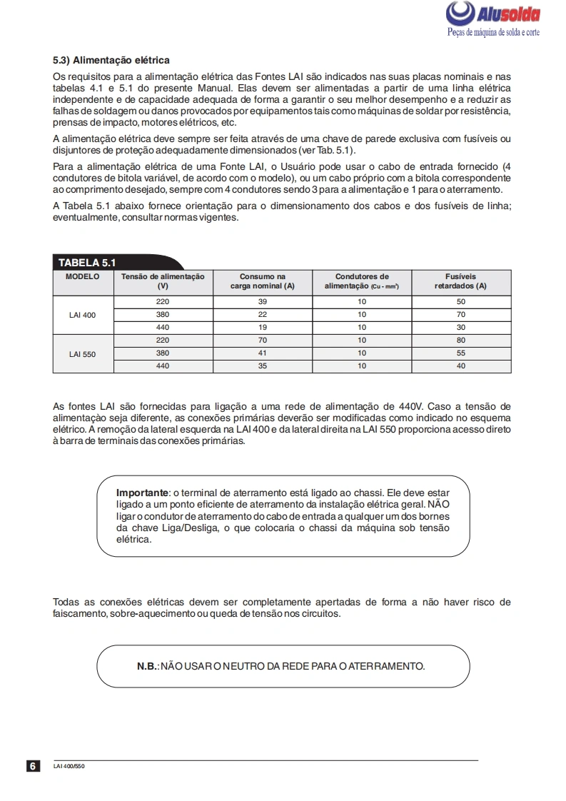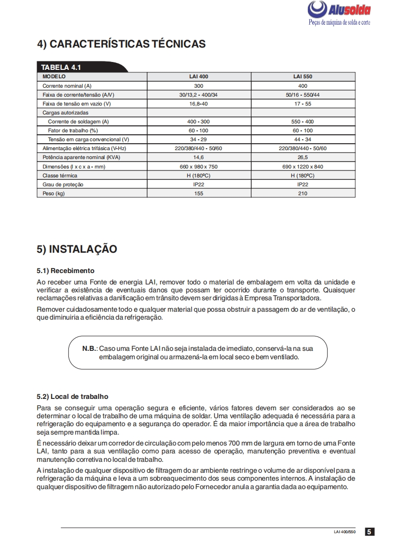 早只AlusoldaESABLA1400/550Retificadores para soldasemi-automaticaESAB LAI 550ESAB LAI 400ESABManual do usuario e pecas de reposicaoReferenciaLA1400:0400057LA1550:0400067A ESAB se reserva o direito de alterar as especificagbes sem previo aviso.0206112082008Valido para n de serie a partir de FXXXXXX