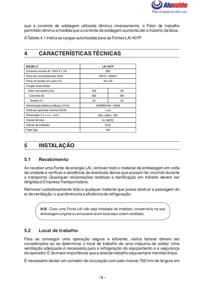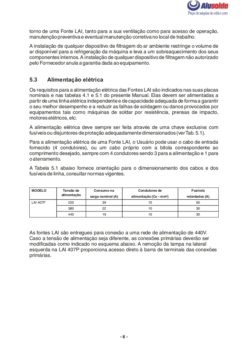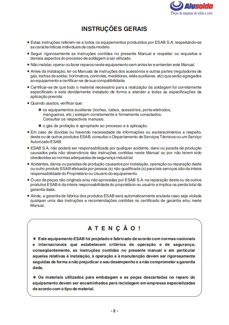 争只ESABAlusoldaLAI407PRetificador para soldasemi-automaticaESAB LAI 407PManual do usuario e pecas de reposicaoReferenciaLA1407P220-380-440V-60Hz0402186A ESAB se reserva o direito de alterar as especificagbes sem previo aviso0210225122009Valido para n de serie a partir de FXXXXXX