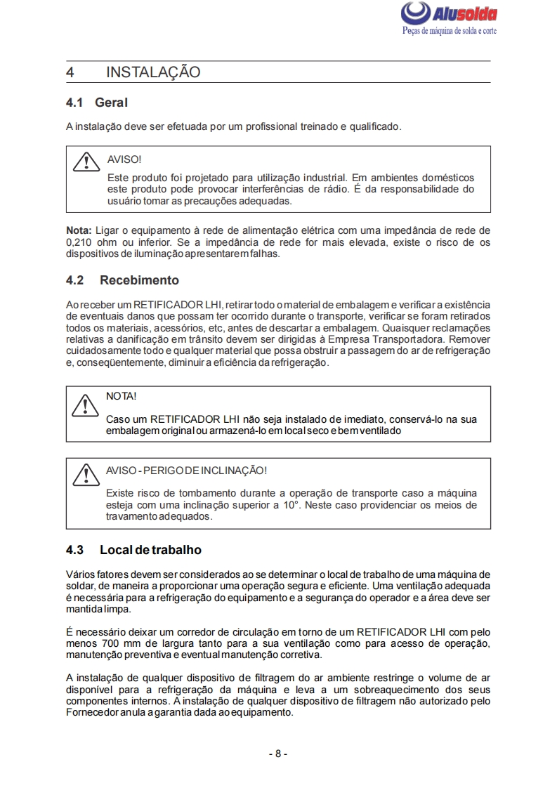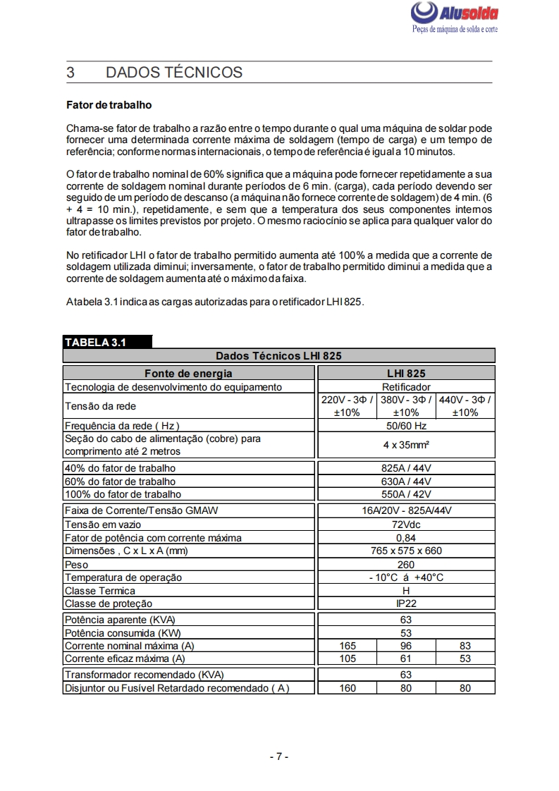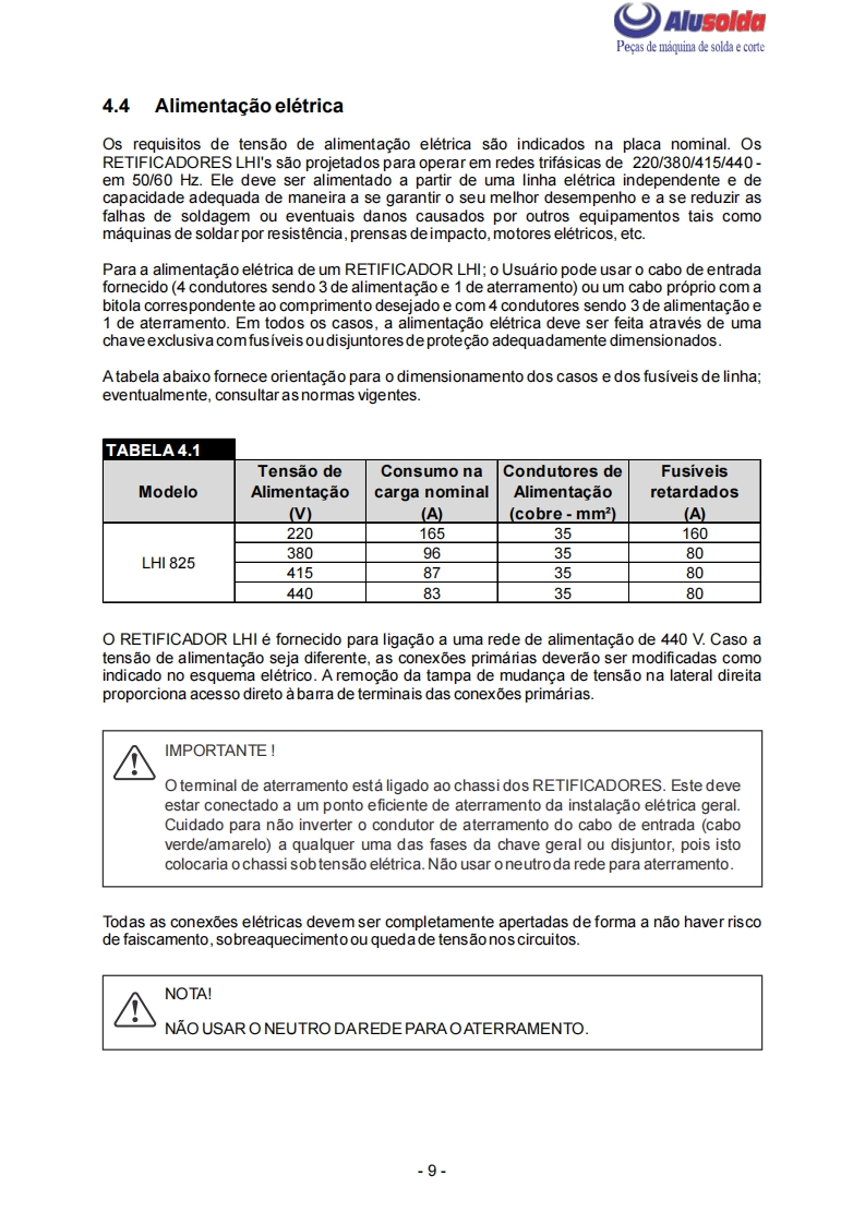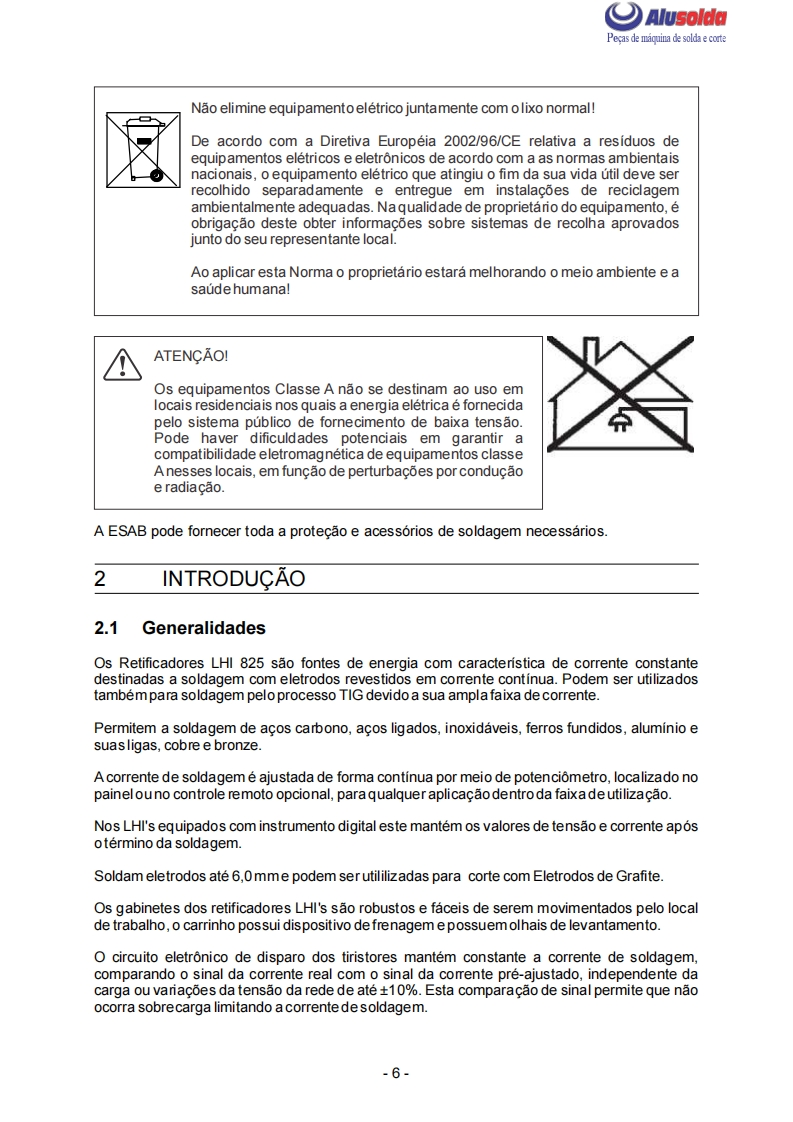 口AlusoldoESABLHI425Retificador para soldagemcom eletrodos revestidos画LHI 825ESABManual do usuario e pecas de reposicaoLHI 825 (220-380-415-440V-50/60Hz)com VOLT/AMP.digital0400039LHI 825(220-380-415-440V-50/60Hz)sem VOLT/AMP.digital0400017LHI 825(220-380-415-440V-50/60Hz)sem VOLT/AMP.com filtro0401759AESAB se reserva o direitode alterar as caracteristicas tecnicas de seus equipamentos sem previo aviso020796608/2015