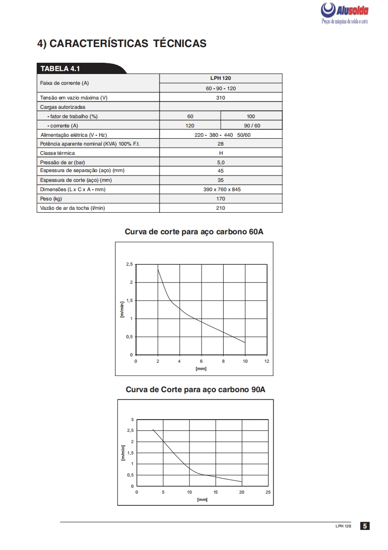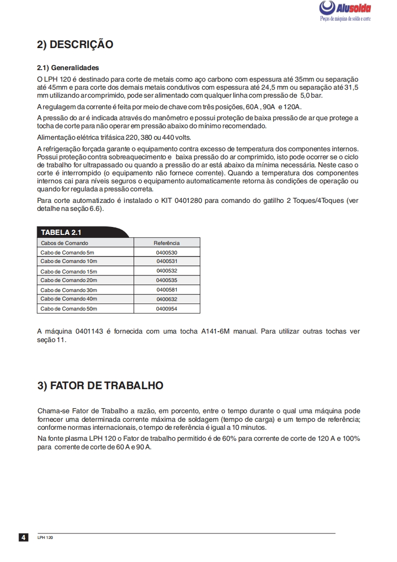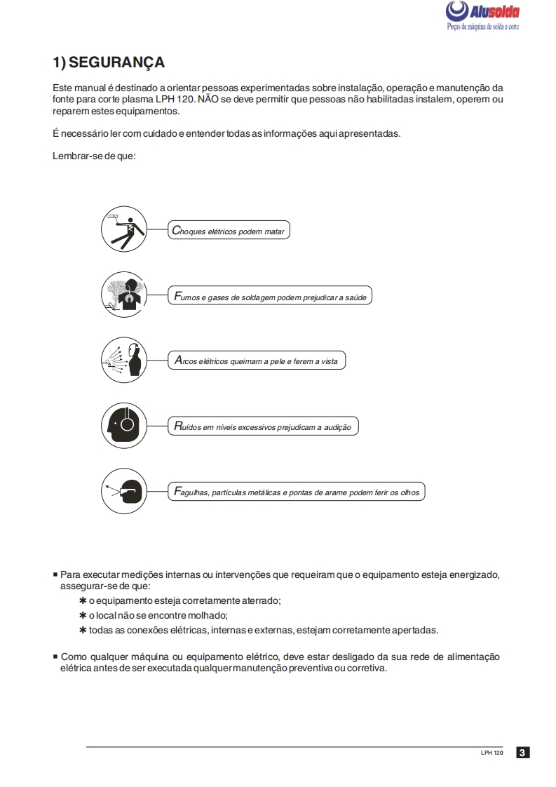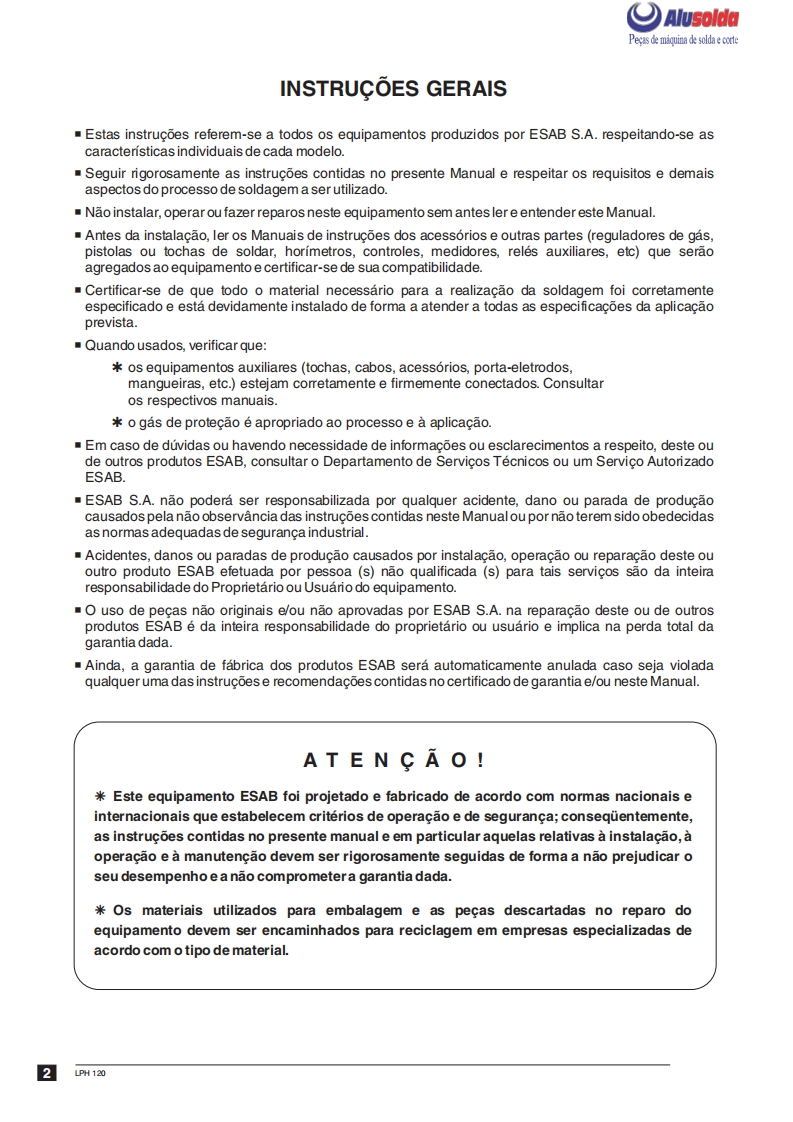 3回ESABAlusoldaLPH 120Fonte para corte plasmaManual de InstrucoesESAB LPH 120Ref.:LPH120220/380/440V50/60Hz0401143LPH 120 220/380/440V 50/60 Hz sem tocha0401304A ESAB se reservao direito de alteraras caracteristicas tecnicas de seus equipamentos sem previo aviso.