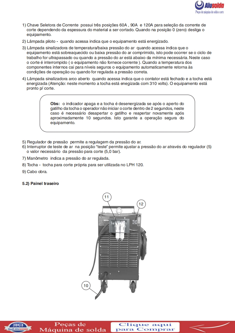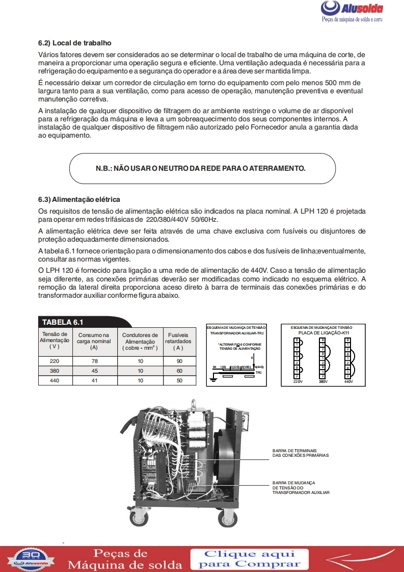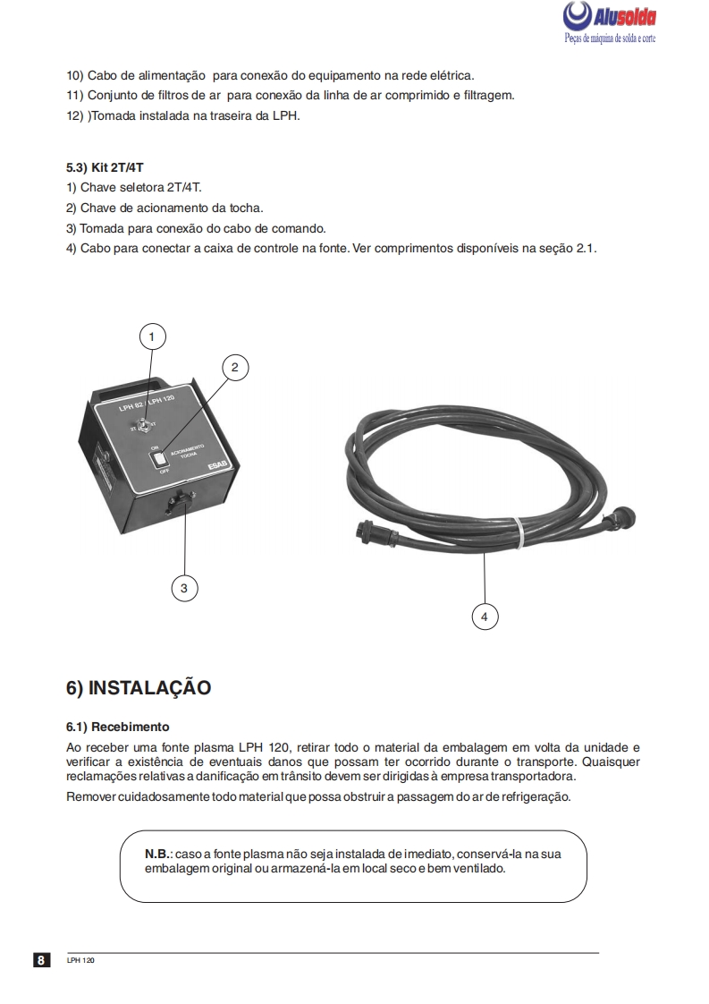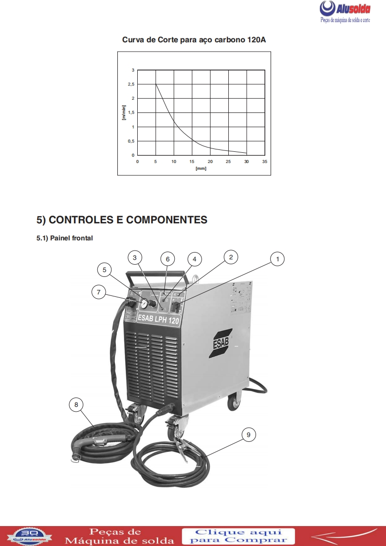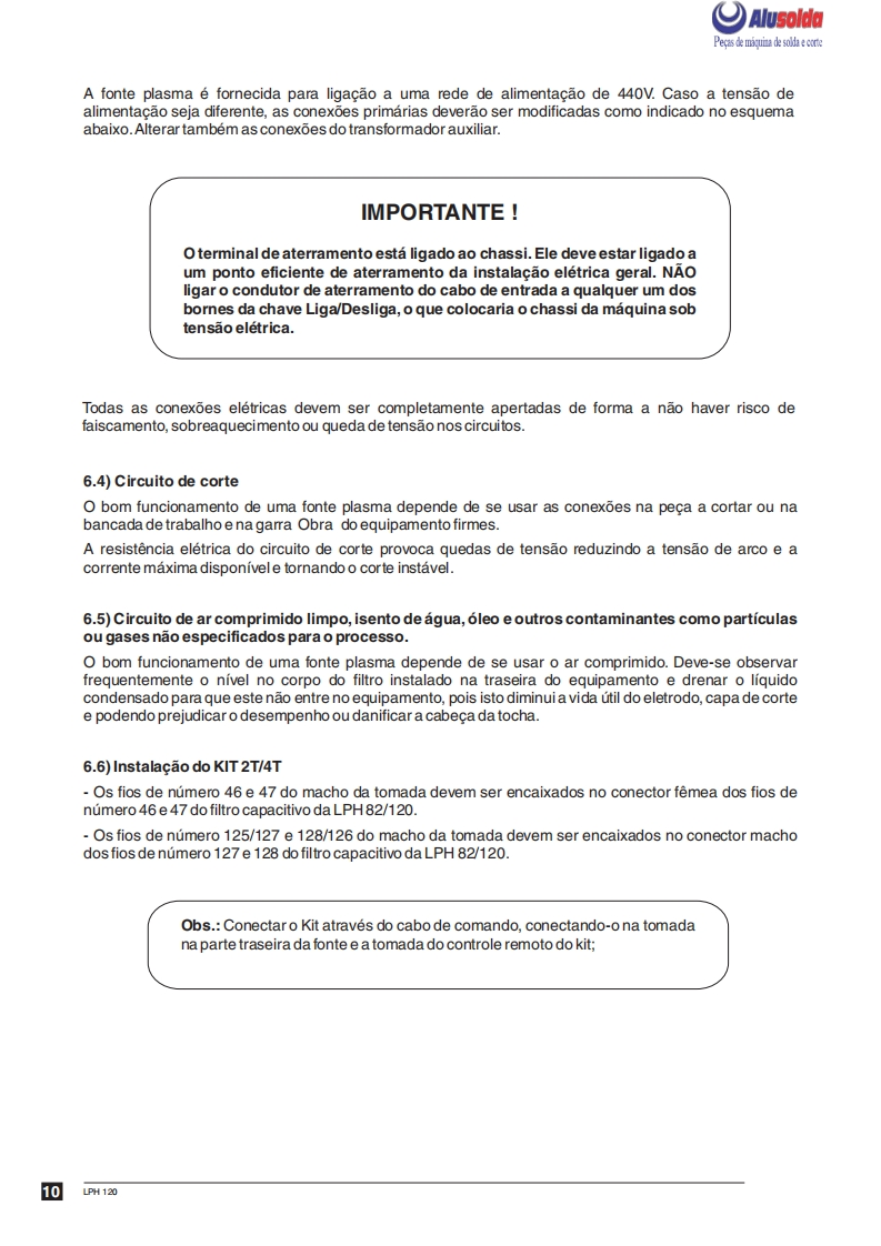 3回ESABAlusoldaLPH 120Fonte para corte plasmaManual de InstrucoesESAB LPH 120Ref.:LPH120220/380/440V50/60Hz0401143LPH 120 220/380/440V 50/60 Hz sem tocha0401304A ESAB se reservao direito de alteraras caracteristicas tecnicas de seus equipamentos sem previo aviso.