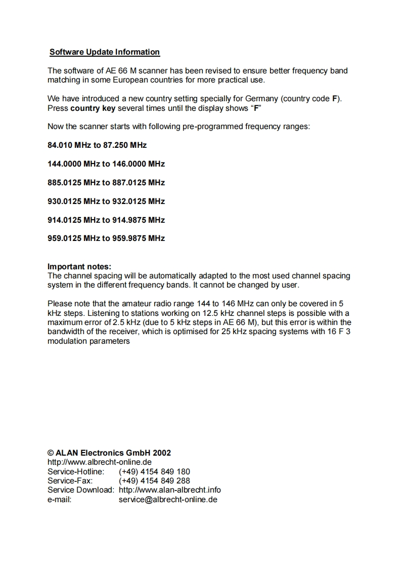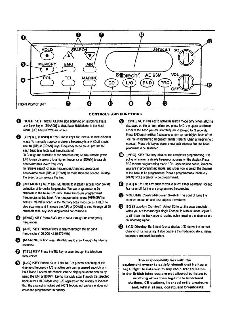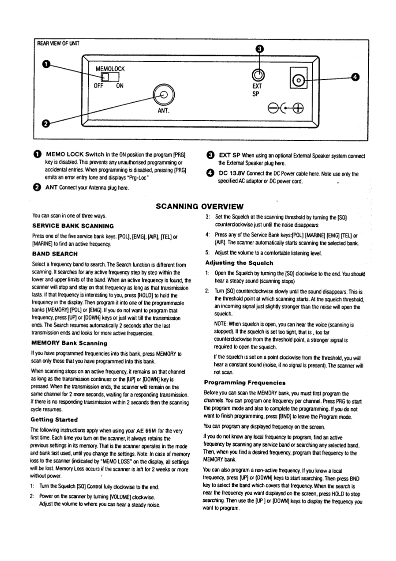 Albrecht,AE 66MKommunikationstechnik aus NorddeutschlandINSTRUCTIONS FOR USEThe AE 66M is a compact mobile/base scannec and one of theThese banks indlude:most advanced communications products available today.HAM/EMG Pre-programmed Channels and ten ProgrammableThe AE 66M features:Channets.JETSCAN:this lightening fast technology enables the AE 66MMARINE Pre-programmed Channels onlyto scan neary 100 channels or steps per second.The AE 66MTEL Pre-programmed Channels onlyscans about five times faster than any standard scanner sold inAIR Pre-programmed Channels onlyEurope.Because the frequency coverage within the servicePOL Pre-programmed Channels and twenty Programmablebanks is so large a very fast scanning system is essential.ChannelsMEM Twenty Programmable Channels only.SIX BANKS:Five pre-programmed Service banks and onestandard programmable Private bankLIQUID CRYSTAL DISPLAY Shows selected channels andfrequencies and numerous other indications.OUTLINE OF FUNCTIONSFor Mobile UseSERVICE BANK 5 frequencies have been pre-programmed and a1:Select an ideal locationin your vehicle to mount the AE 66M.Avoid aMEMORY BANK where desired frequencies can be programmed by userlocation that could interlere with your driving.In a passenger vehicleare provided on this unit.the ideal location is undemeath the dash board on the passenger sideThe SERVICE BANK is divided into POL.HAMEMG.AIR.TEL and MARINE2:Use the AE 66M mounting bracket as a template for marking the50 CH MEMORY AlI 50 channels can be stored as programminglocation of the mounting screws.frequencies by user.Details are as follows.NOTE:If there are screws already holding the dashboard,you can useMEMORY BANK:20 CHthe same screw holes to mount the bracket.POL BANK 20 CH3:Drill the necessary holes and secure the mounting bracket in placeHAM/EMG BANK 10 CHusing the screws provided.4:POL.HAM/EMG Banks have pre-programmed frequencies but also haveMount the radio to the bracket only after the wiring has beenCH MEMORY which the user can use for storing frequencies.connected to the rear panel.The 10 BAND Search featureConnecting the Antenna plugA Frequency search in the foliowing selected BAND range can beConnect the mobile antenna plug into the ANT conector on the rear panel.performed.Connecting the Power CordNo.Range(MHz)Step (Khz)MODENOTE:If you are not experienced in connecting accessories to the vehiclefuse box then please see your automotive dealer for advise on proper66.0000-88.0000女NFMinstallation.108.0000-136.975012.5AMInstallation for everyday use3137.0000.144.0000心NFM1:Check the vehicle battery connections to determine which battery144.0000-148.00005NFMterminal (positive or negative)is grounded to the engine biock or148.0000-174.0000chassis.Most vehicle today use a negative round.lyour vehicle hasNFMa negative ground follow sleps 2 and 3.Otherwise skip to the note6406.0000.420.000012.5NFMfollowing step 3.2420.0000-450.000012.5NFMConnect the RED wire of the DC power cord to the accessory contactin your
