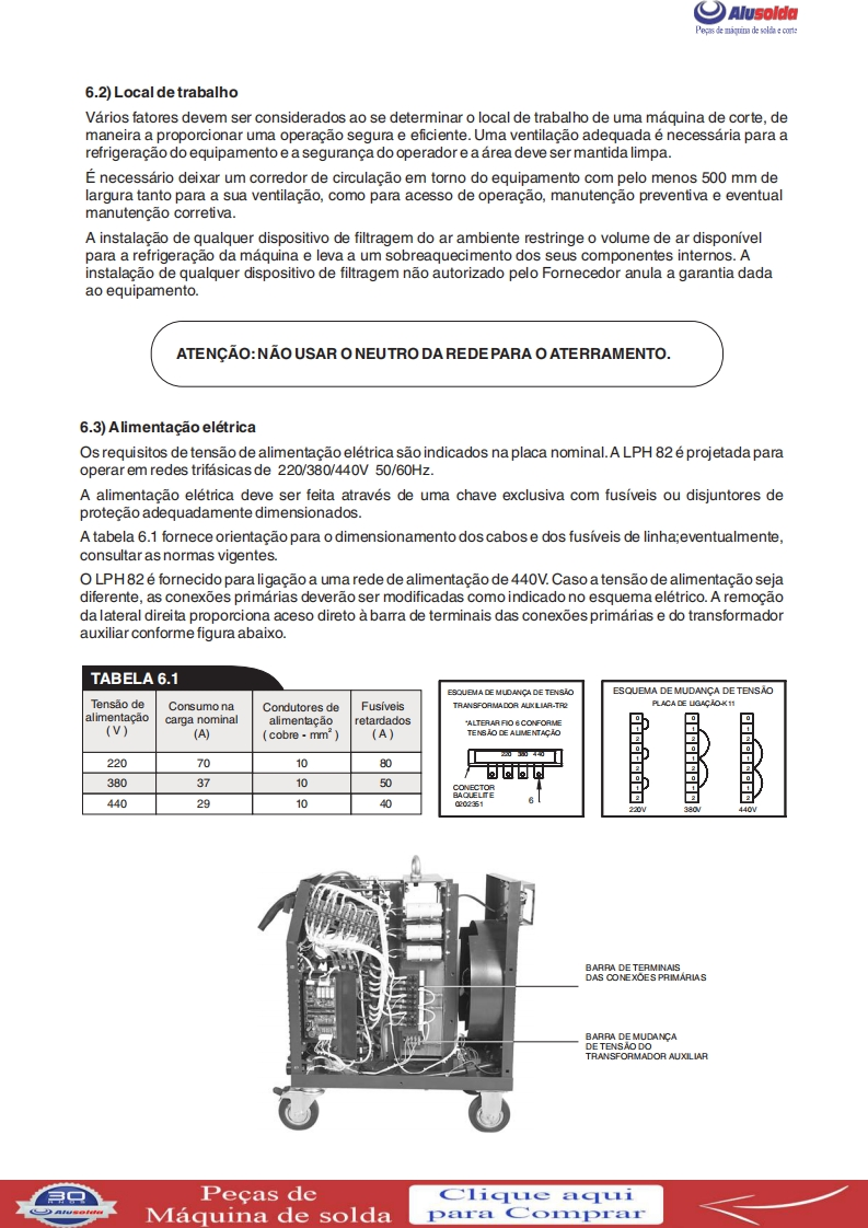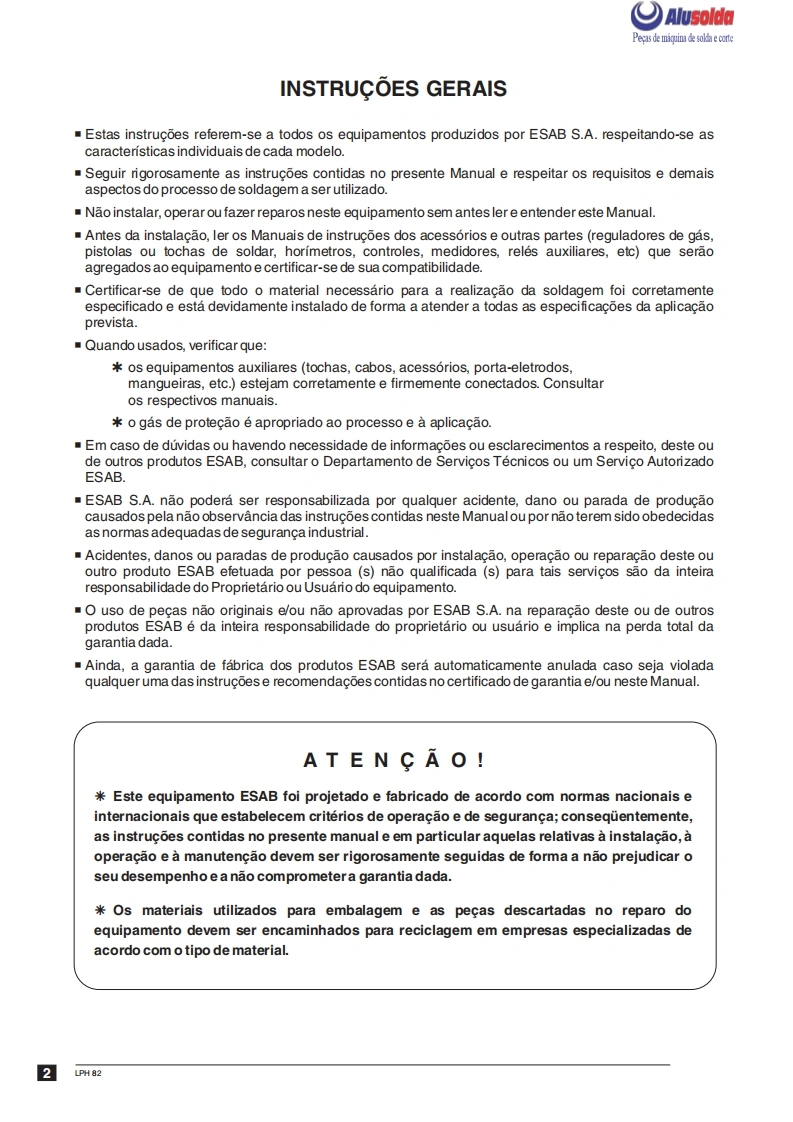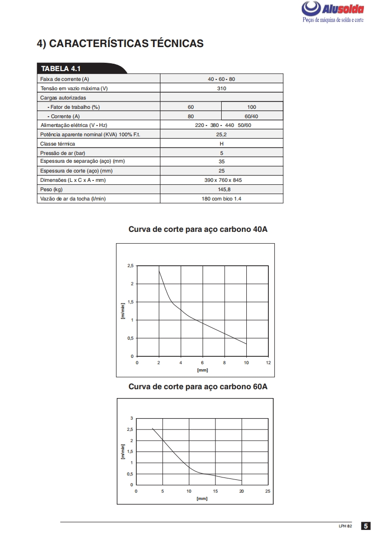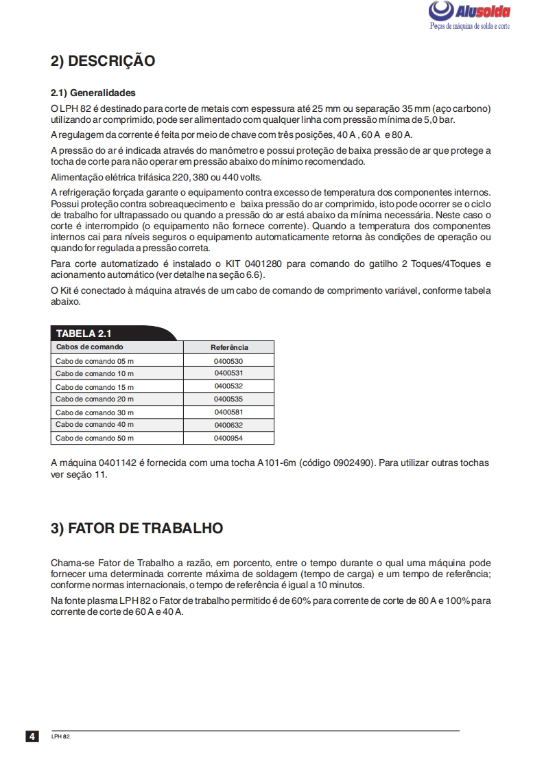 系只AlusoldaESABLPH 82Fonte para corte plasmaManual de Instrucoes0ESAB LPH 82Ref.:LPH 82 220/380/440V 50/60 Hz com tocha manual 6 metros0401142LPH 82 220/380/440V 50/60 Hz sem tocha0401281A ESAB se reserva odireito de alterar as caracteristicas tecnicas de seus equipamentos sem previo aviso.