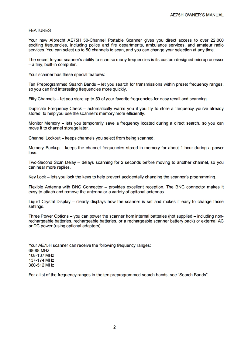 Albrecht_AE75H_Manual操作说明书手册找手册网前天发布关注私信48.41KB14页036Albrecht_AE75H_Manual操作说明书手册此内容为付费资源,请付费后查看¥19¥21黄金会员免费钻石会员免费立即购买您当前未登录!建议登陆后购买,可保存购买订单付费资源 第1页 / 共14页 第2页 / 共14页 第3页 / 共14页 第4页 / 共14页 第5页 / 共14页 第6页 / 共14页 第7页 / 共14页 第8页 / 共14页 第9页 / 共14页 第10页 / 共14页 试读已结束,还剩4页,您可下载完整版后进行离线阅读 THE END北峰/Albrecht 文本预览 AE75H OWNER'S MANUALbrecht.Kommunikationstechnik aus NorddeutschlandOWNER'S MANUALAE75H50-Channel Portable Scanner1 查看更多 收起部分 喜欢就支持一下吧收藏