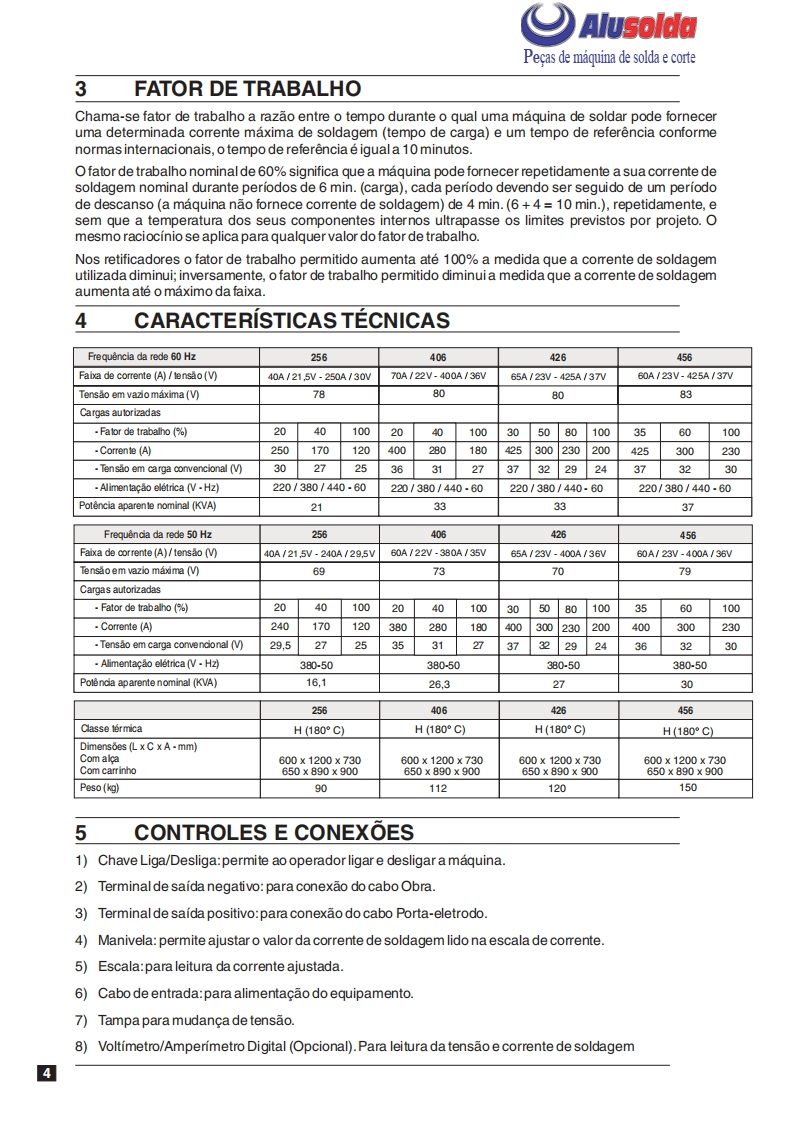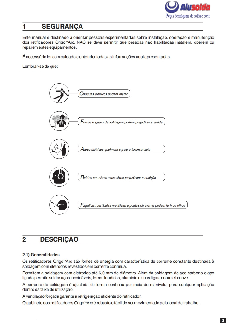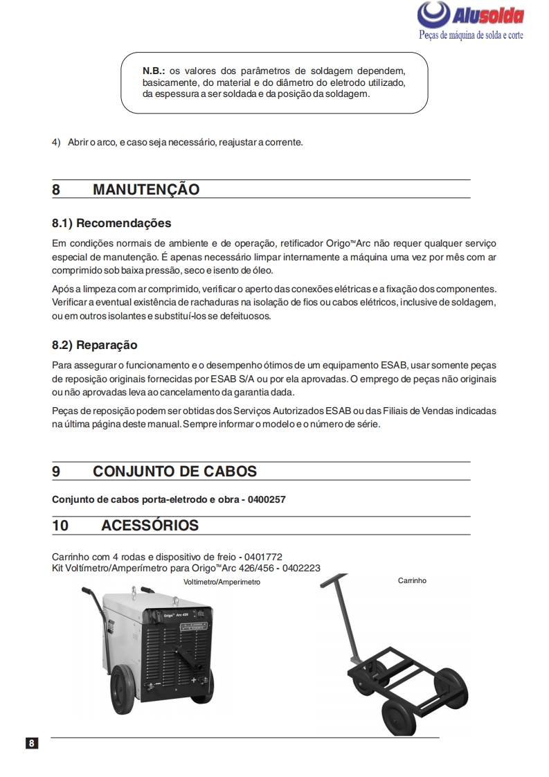AlusoldaESABOrigoTM Arc256/4061426/1456Retificador para soldagemcom eletrodos revestidosManual do usuario e pecas de reposicaoReferenciaOrigoTArc 256 com alca0401510Origo"Arc 406 com alca0401511OrigoTArc 426 com alca0402211OrigoArc 456 com alca0401512OrigoTMArc 456 com carrinho0401723OrigoMArc 456 com volt/amp.0402256A ESAB se reserva o direito de alerar as especificages sem prvio aviso.0208428082008Valido para n de serie a partir de FXXXXXX