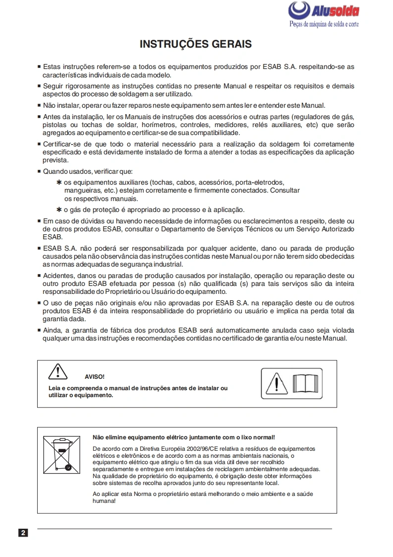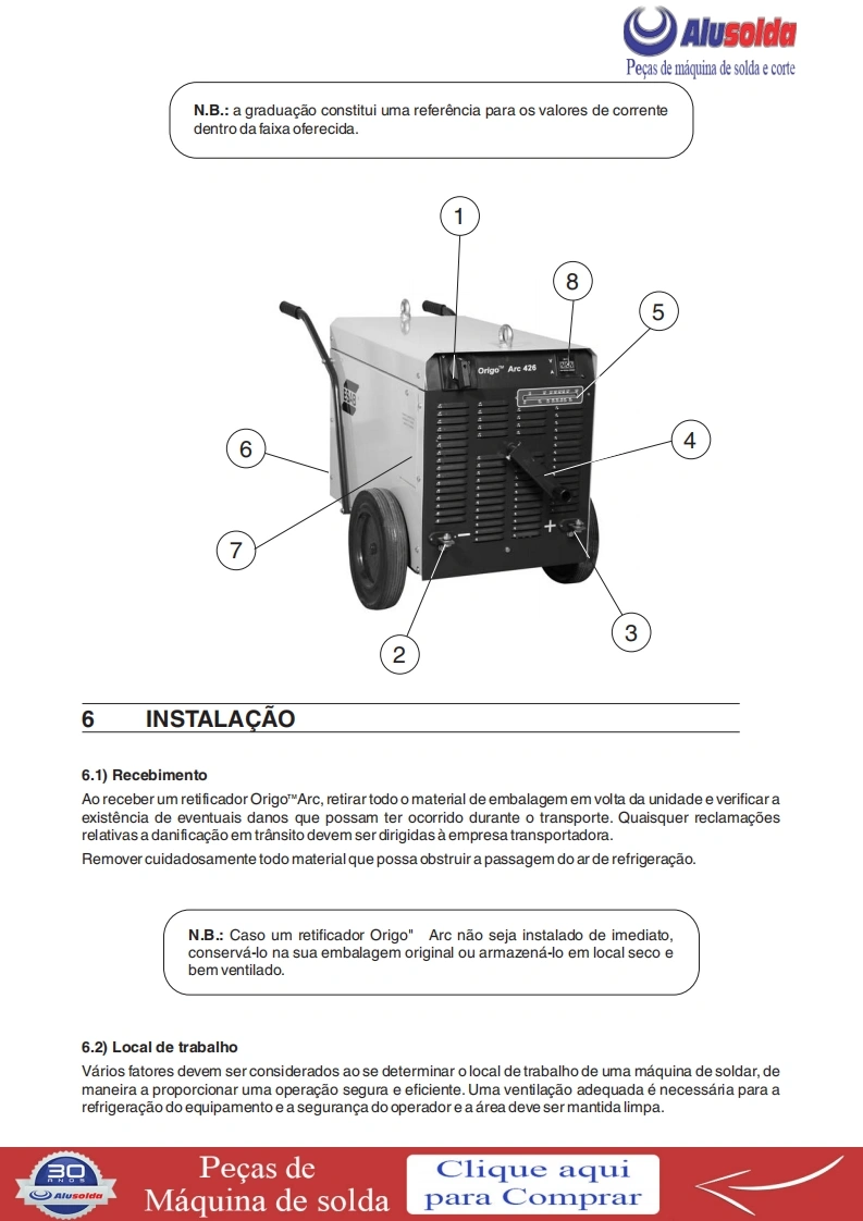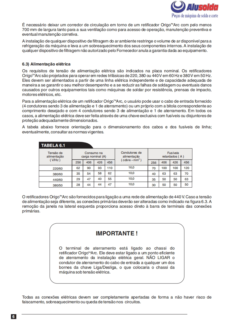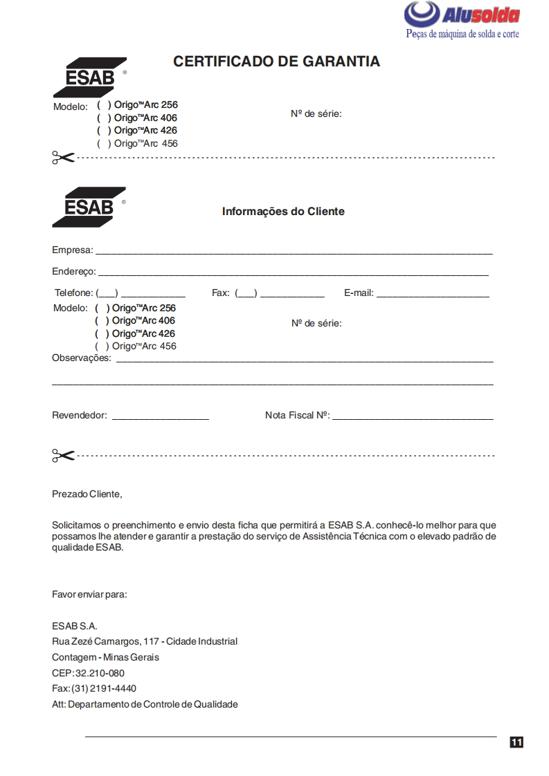 AlusoldaESABOrigoTM Arc256/4061426/1456Retificador para soldagemcom eletrodos revestidosManual do usuario e pecas de reposicaoReferenciaOrigoTArc 256 com alca0401510Origo"Arc 406 com alca0401511OrigoTArc 426 com alca0402211OrigoArc 456 com alca0401512OrigoTMArc 456 com carrinho0401723OrigoMArc 456 com volt/amp.0402256A ESAB se reserva o direito de alerar as especificages sem prvio aviso.0208428082008Valido para n de serie a partir de FXXXXXX