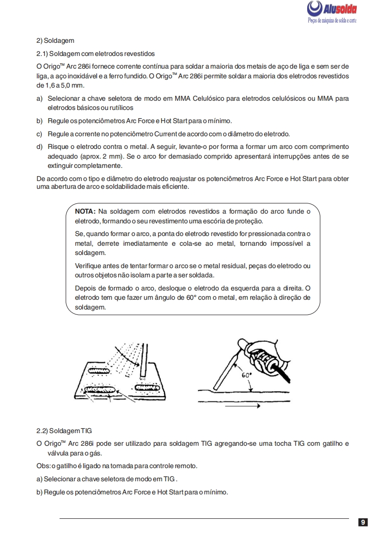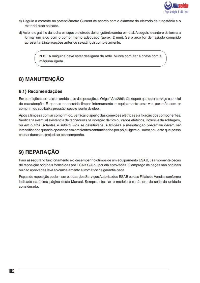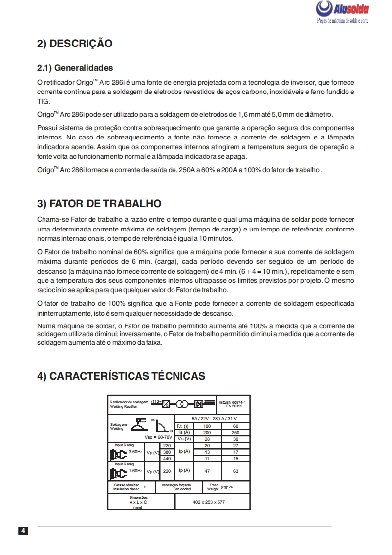 AlusoldaESABOrigoTM Arc 286iFonte de energia para soldagem comeletrodos revestidos e TIGOrigoArc 286iManual do usuario e pecas de reposicaoReferenciaOrigoTM Arc 286i0401001A ESAB se reserva o direito de alterar as especificagbes sem previo aviso.0208320082008Valido para n de serie a partir de FXXXXXX