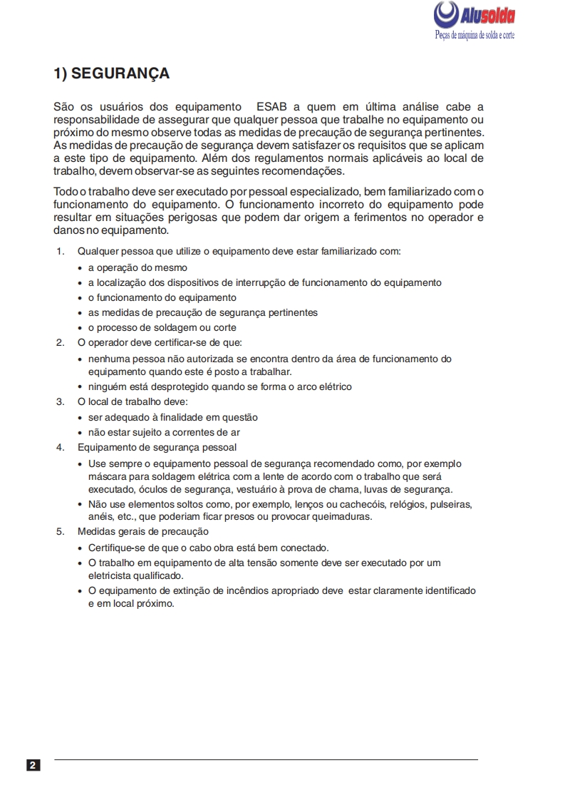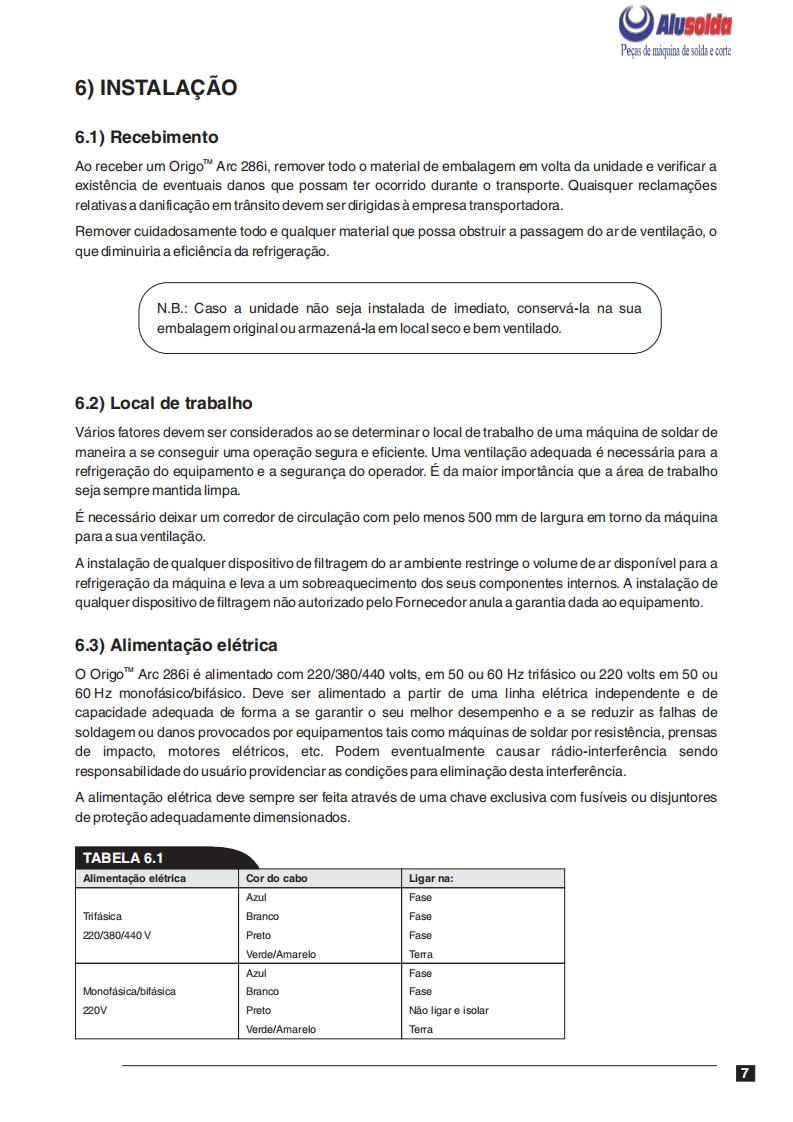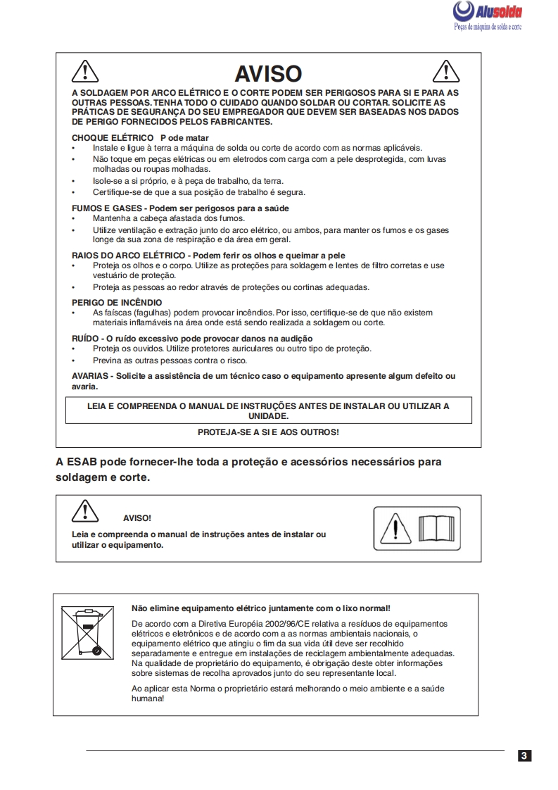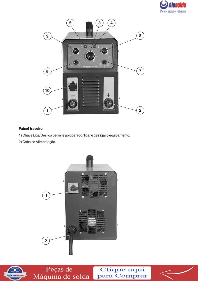 AlusoldaESABOrigoTM Arc 286iFonte de energia para soldagem comeletrodos revestidos e TIGOrigoArc 286iManual do usuario e pecas de reposicaoReferenciaOrigoTM Arc 286i0401001A ESAB se reserva o direito de alterar as especificagbes sem previo aviso.0208320082008Valido para n de serie a partir de FXXXXXX
