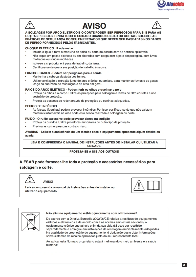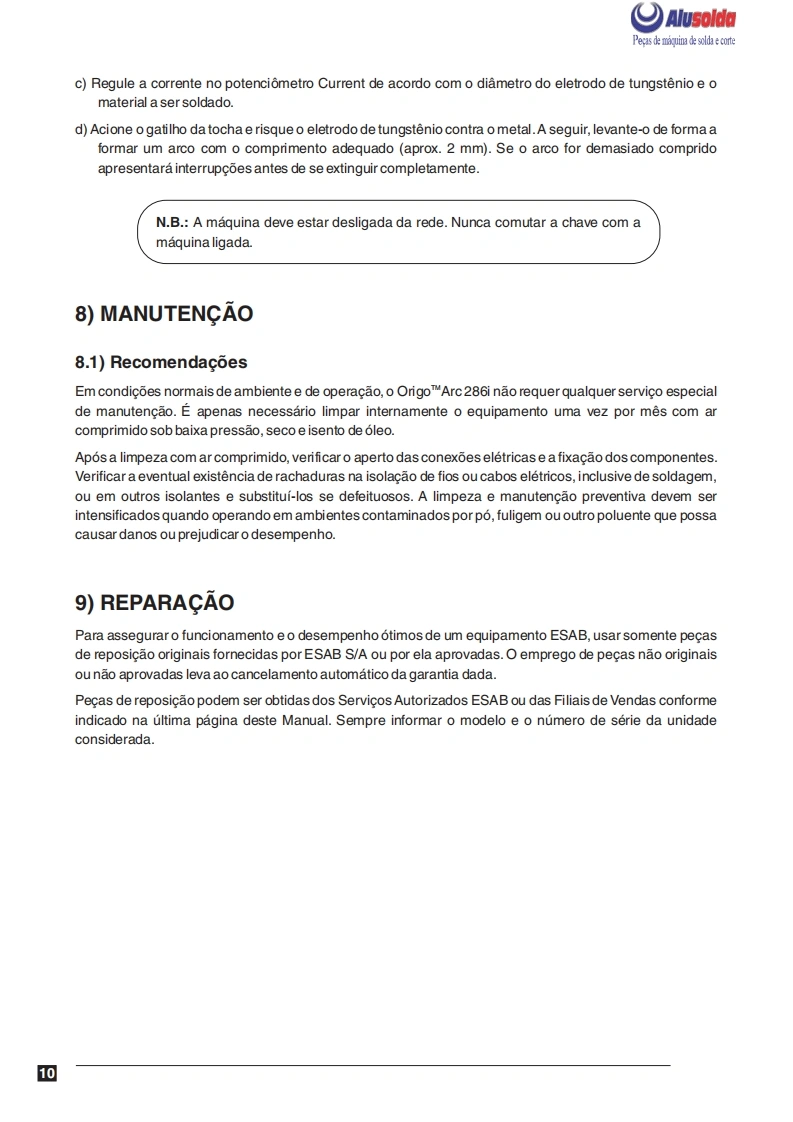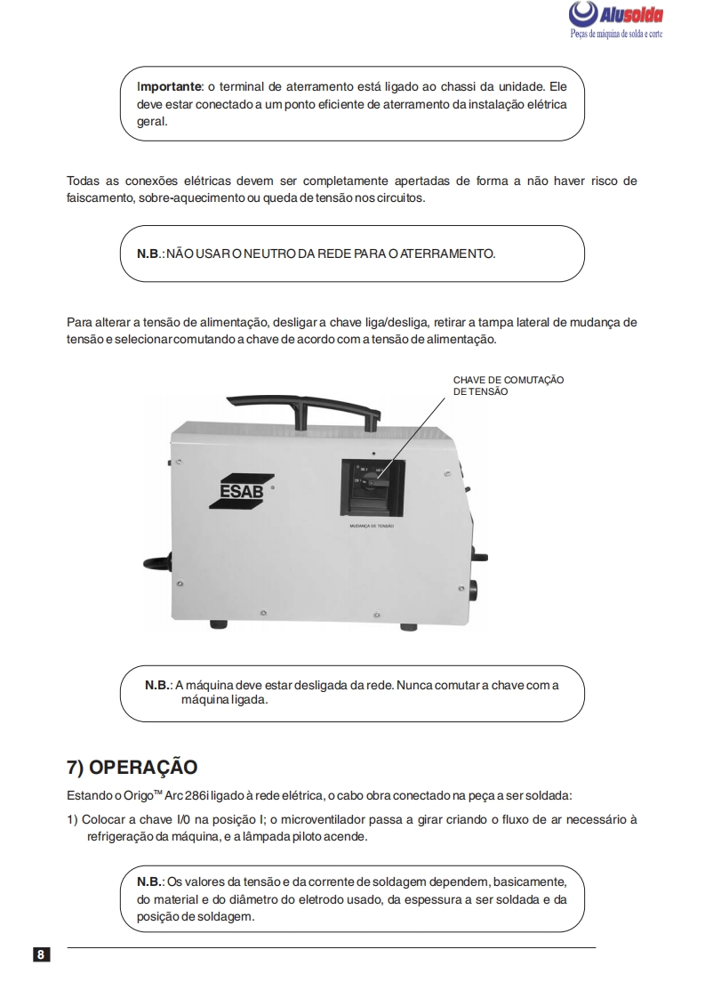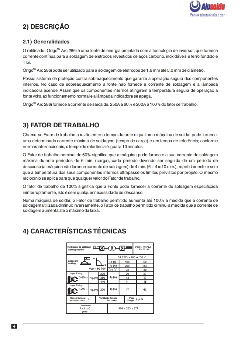争口AlusoldaESABOrigoTM Arc 286iFonte de energia para soldagem comeletrodos revestidos e TIGOrigoArc286i“Manual do usuario e pecas de reposicaoReferenciaOrigoTM Arc 286i0401001A ESAB se reserva o direito de alterar as especificagbes sem prvio aviso.0208320082008Valido para n de serie a partir de FXXXXXX