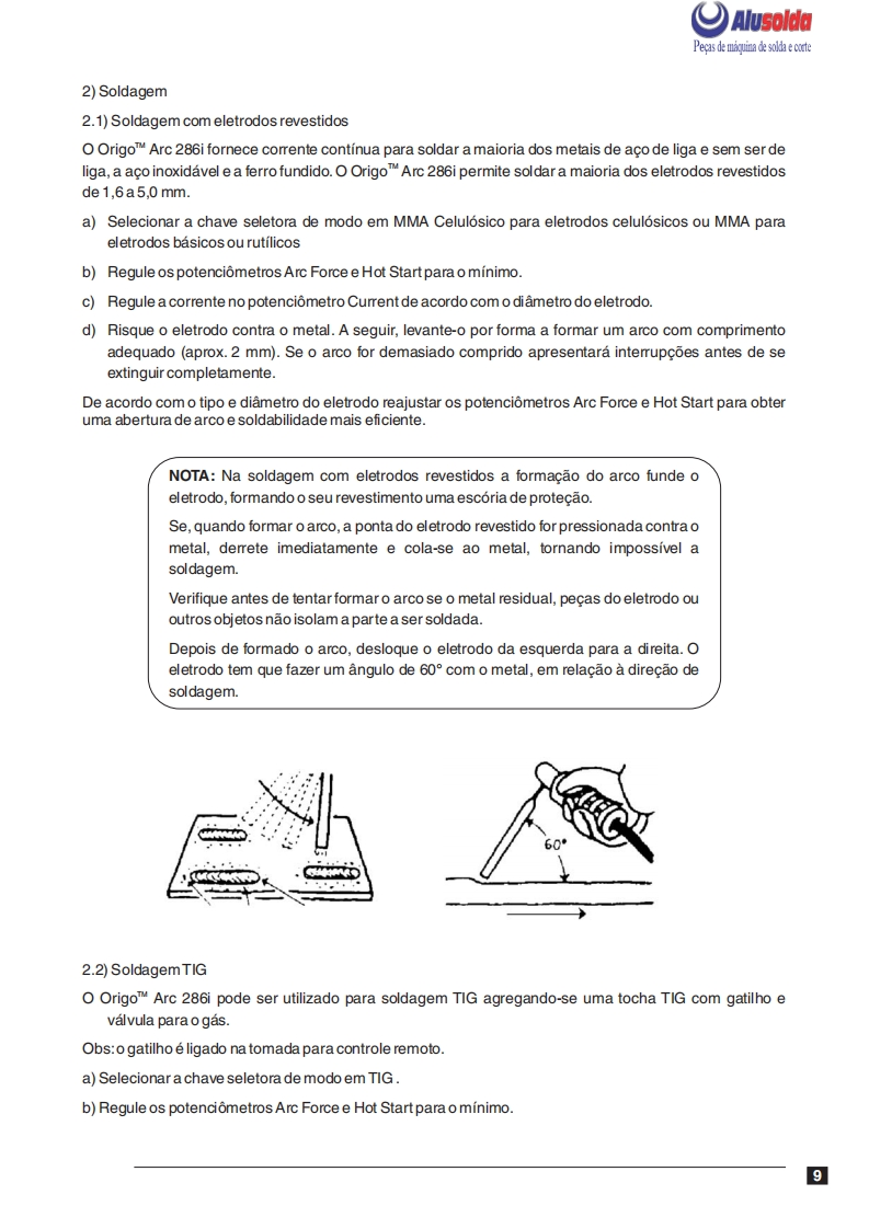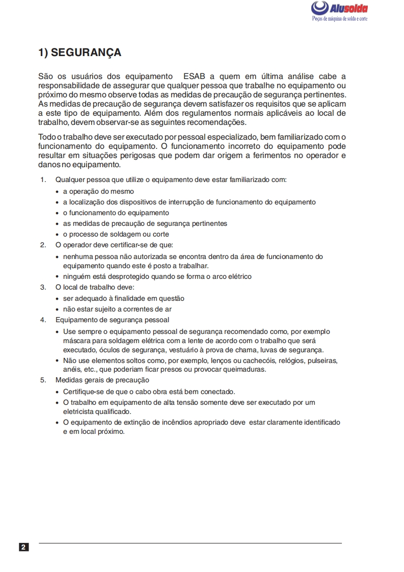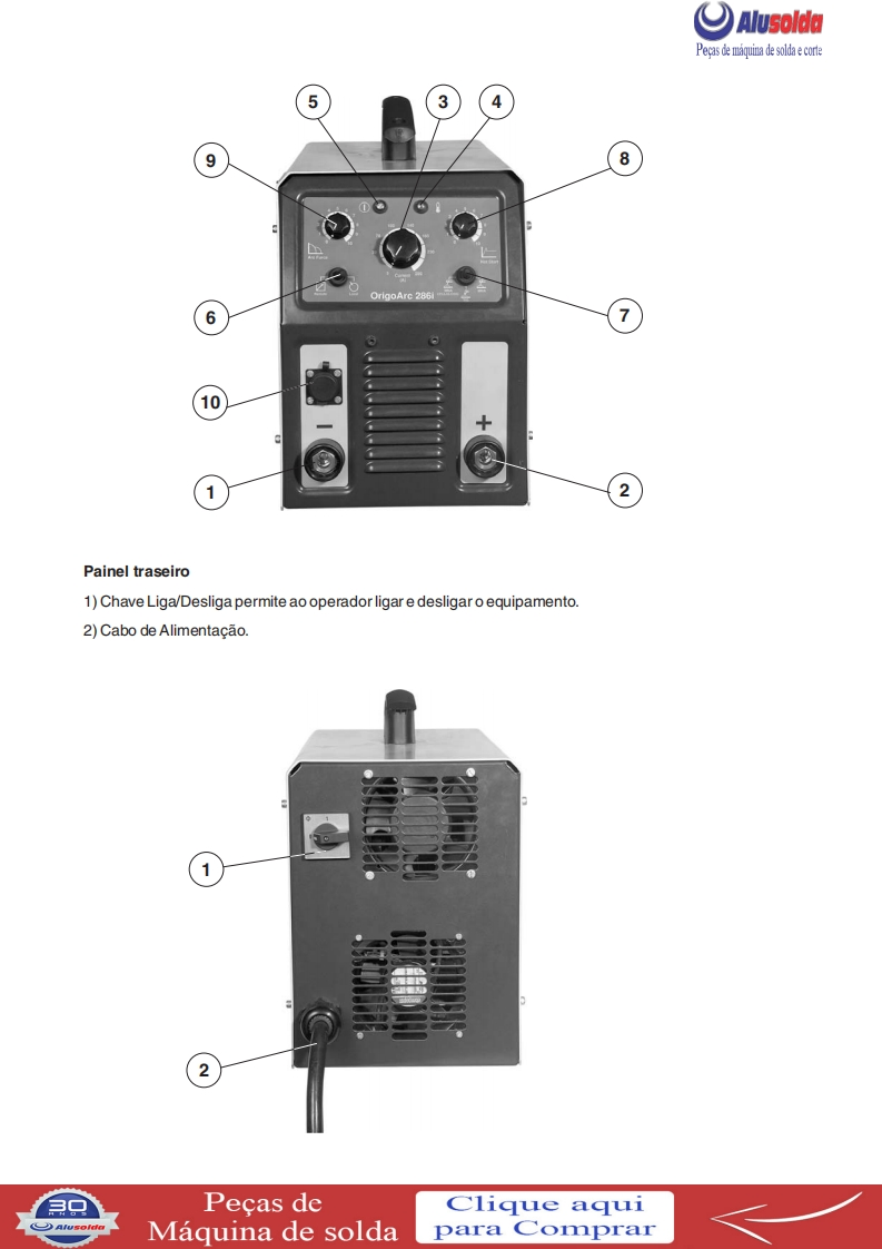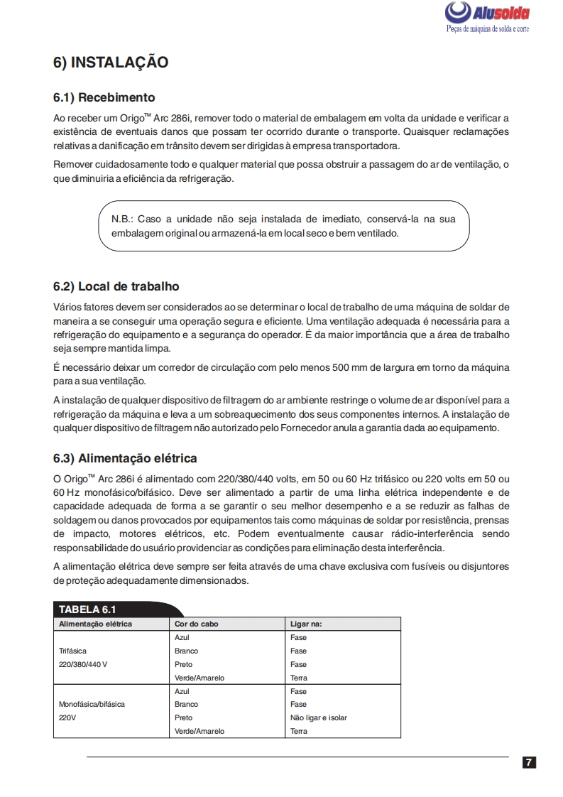 争口AlusoldaESABOrigoTM Arc 286iFonte de energia para soldagem comeletrodos revestidos e TIGOrigoArc286i“Manual do usuario e pecas de reposicaoReferenciaOrigoTM Arc 286i0401001A ESAB se reserva o direito de alterar as especificagbes sem prvio aviso.0208320082008Valido para n de serie a partir de FXXXXXX