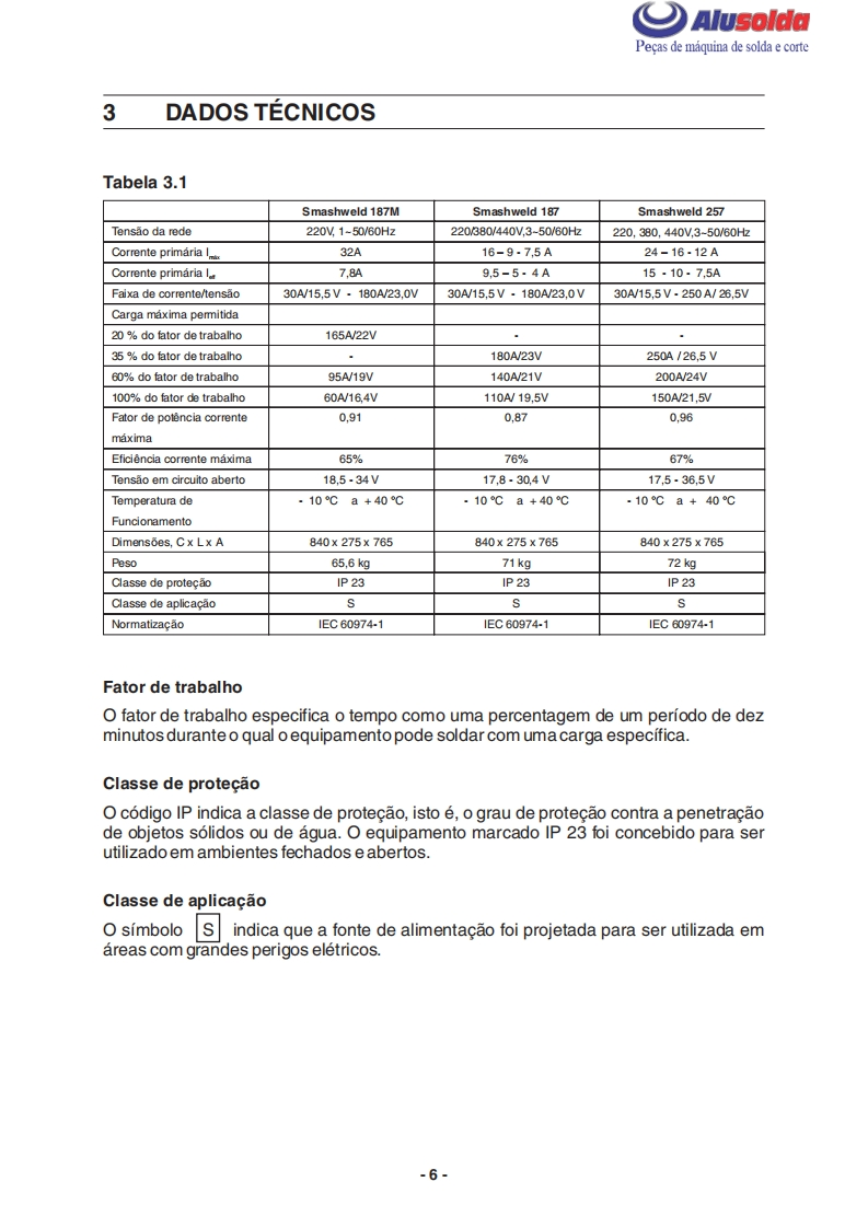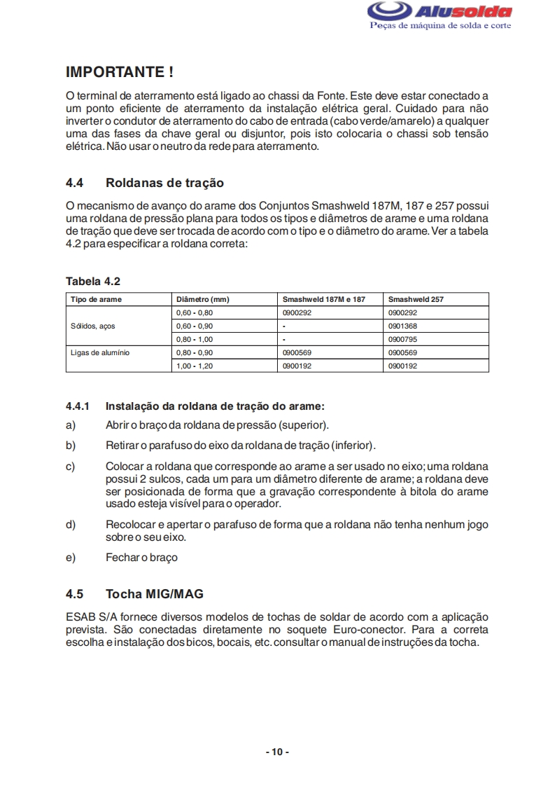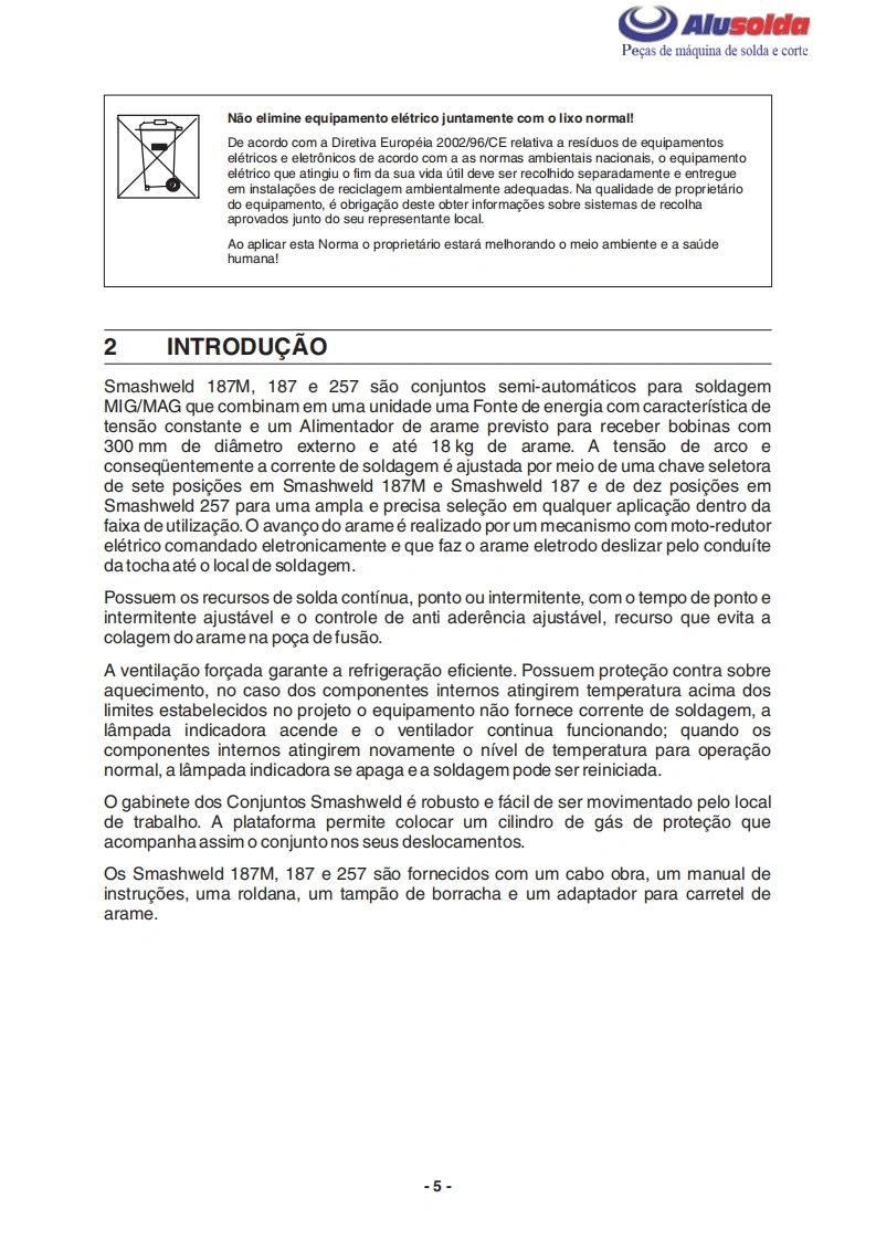 早只AlusoldaESABSmashweld 187MSmashweld 187Smashweld 257Manual do usuario e pecas de reposicaoSmashweld 187M(com volt/amp.)0402174Smashweld 187M(sem volt/amp.)0402190Smashweld 187(com volt/amp.)0402173Smashweld 187(sem volt/amp.)0402193Smashweld 257(com volt/amp.)0402071Smashweld 257(sem volt/amp.)04021960209795042009Valido a partir do n de serie F0801000
