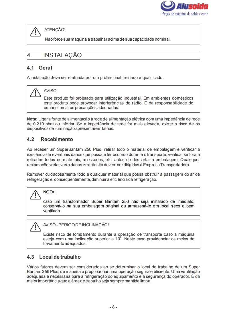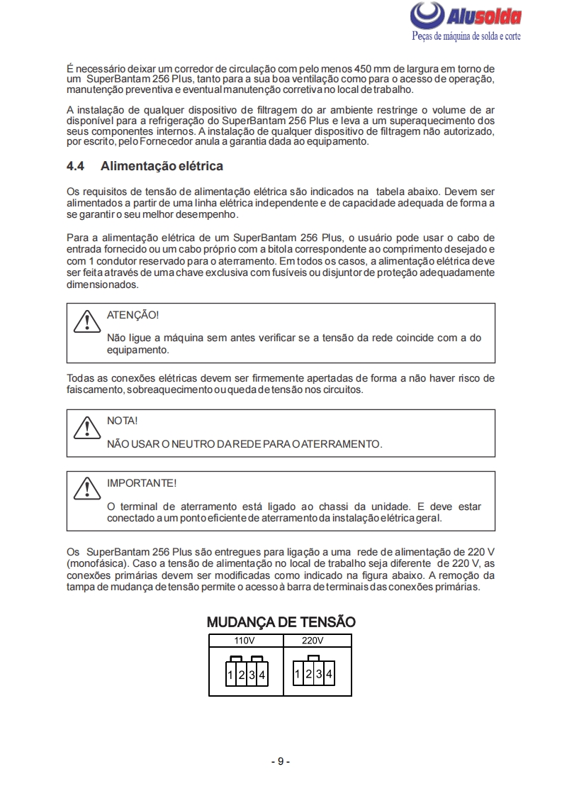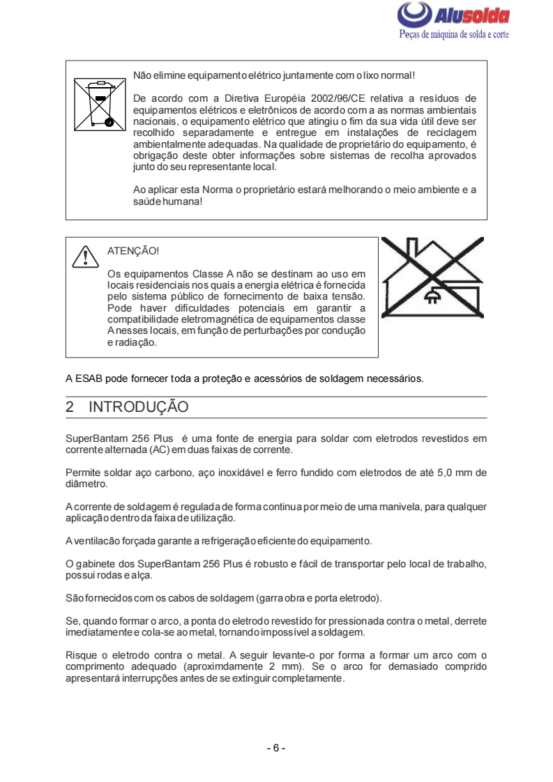 县只AlusoldaESABSuperBantam 256 PlusTransformador para soldagem com eletrodos revestidosem corrente alternada(AC)SUPERManual do usuario e pecas de reposicaoSuperBantam 256 Plus 110/220V-60Hz0402932SuperBantam 256 Plus 110/220V-50Hz0403400ESABse reservao direito de alerar as caracteristicass de seus equipamentos sem aviso previo.0212954092015