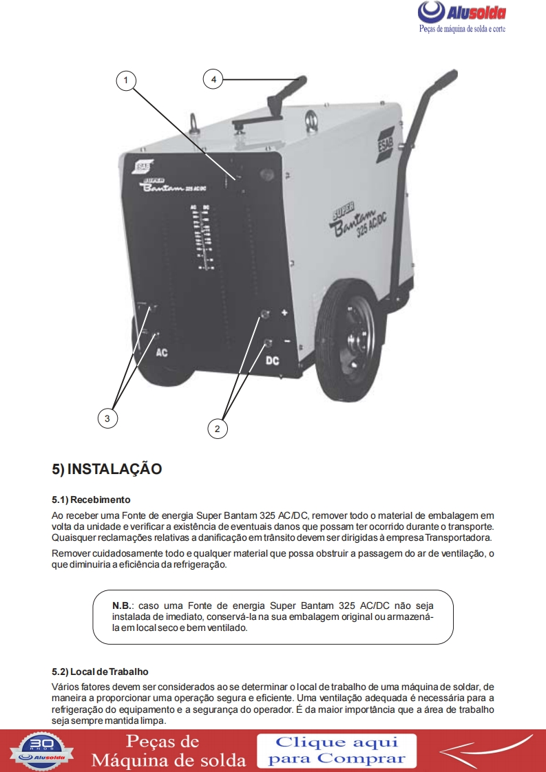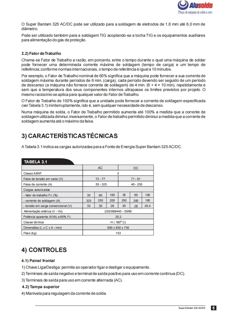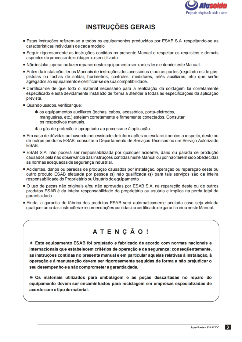 只飞)AlusoldaESABSuper Bantam 325AC/DFonte de energia para solda comeletrodos revestidos em CorrenteAlternada (AC)e Corrente Continua (DC)Manual de InstrucoesACDCRef:0400322Super Bantam 325 AC/DC com engate rapido0400364Super Bantam 325 AC/DC com borne parafuso