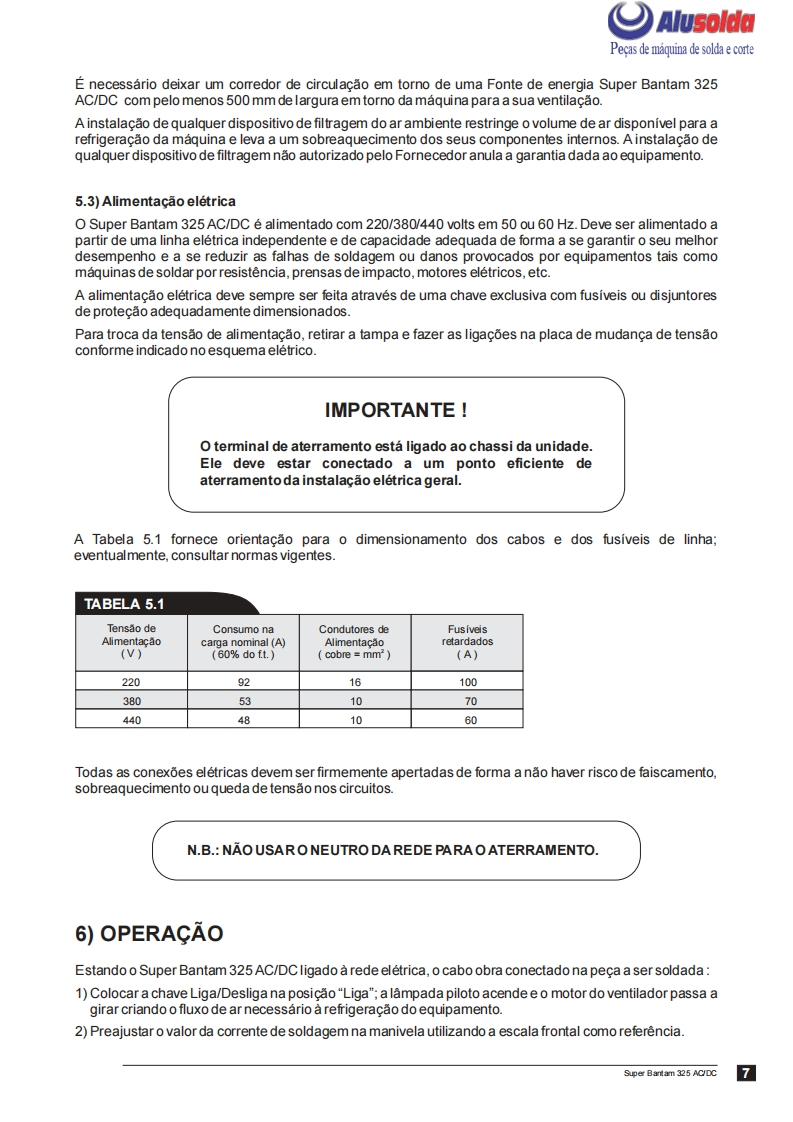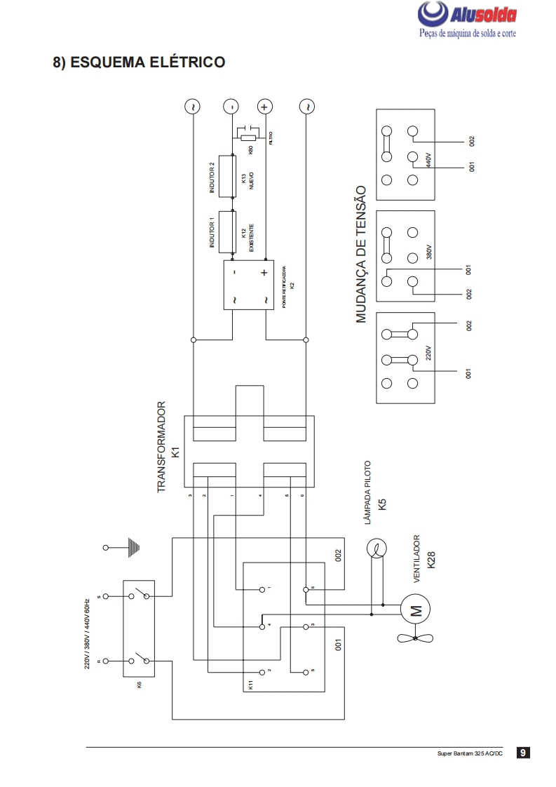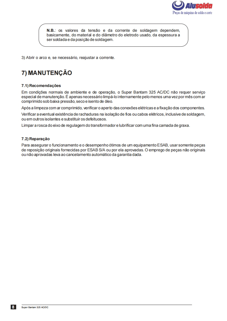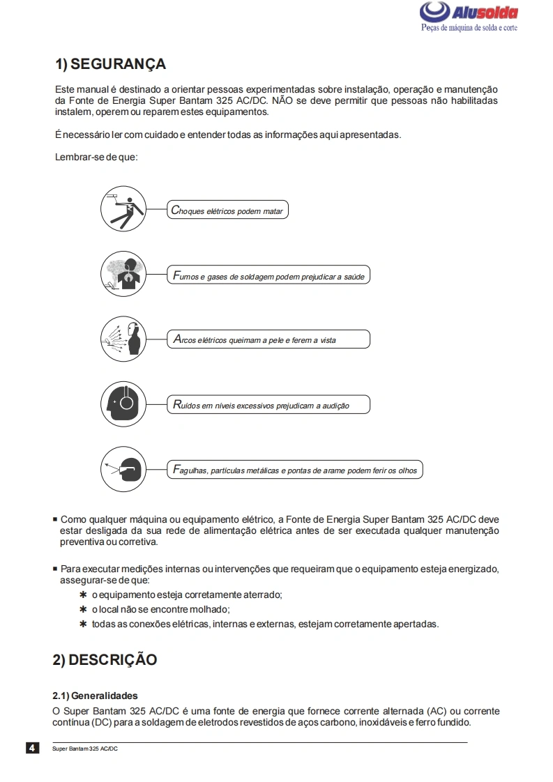 只飞)AlusoldaESABSuper Bantam 325AC/DFonte de energia para solda comeletrodos revestidos em CorrenteAlternada (AC)e Corrente Continua (DC)Manual de InstrucoesACDCRef:0400322Super Bantam 325 AC/DC com engate rapido0400364Super Bantam 325 AC/DC com borne parafuso