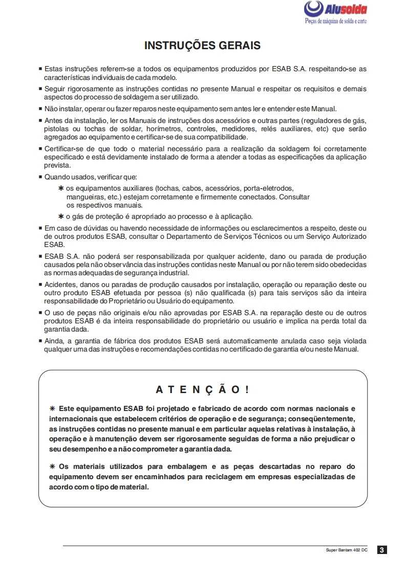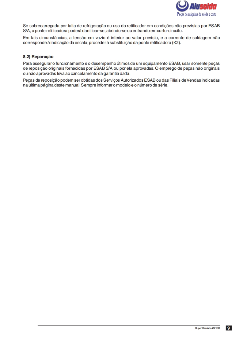 ESAB_SUPER_BANTAM_402_DC操作手册含电器原理图找手册网24天前发布关注私信1.94MB19页038ESAB_SUPER_BANTAM_402_DC操作手册含电器原理图此内容为付费资源,请付费后查看¥19¥21黄金会员免费钻石会员免费登录购买付费资源 第1页 / 共19页 第2页 / 共19页 第3页 / 共19页 第4页 / 共19页 第5页 / 共19页 第6页 / 共19页 第7页 / 共19页 第8页 / 共19页 第9页 / 共19页 第10页 / 共19页 试读已结束,还剩9页,您可下载完整版后进行离线阅读 THE ENDESAB焊机/林肯焊机 文本预览 ESAB飞AlusoldaSUPER BANTAM402DCRetificador para soldagemcom eletrodos revestidosManual de InstrucoesESAB心Ref.:Super Bantam 402 DC 0401210 查看更多 收起部分 喜欢就支持一下吧收藏