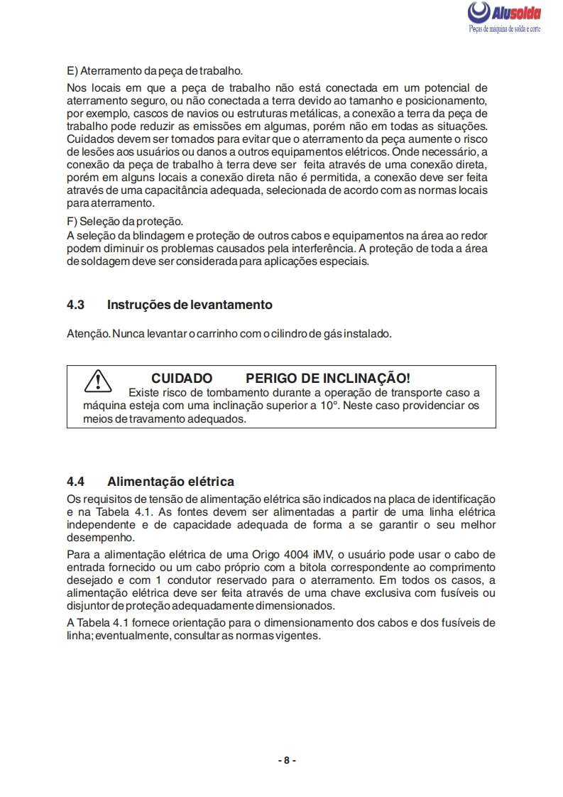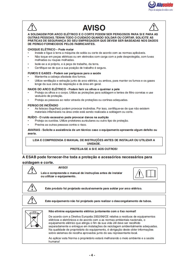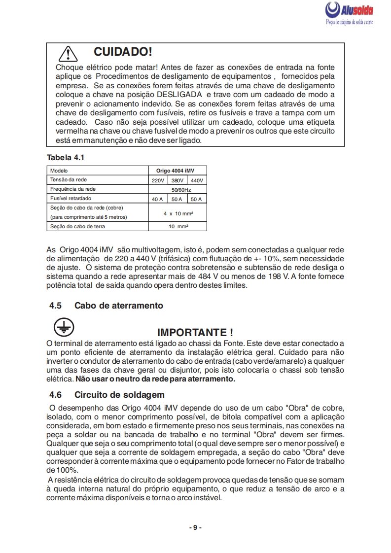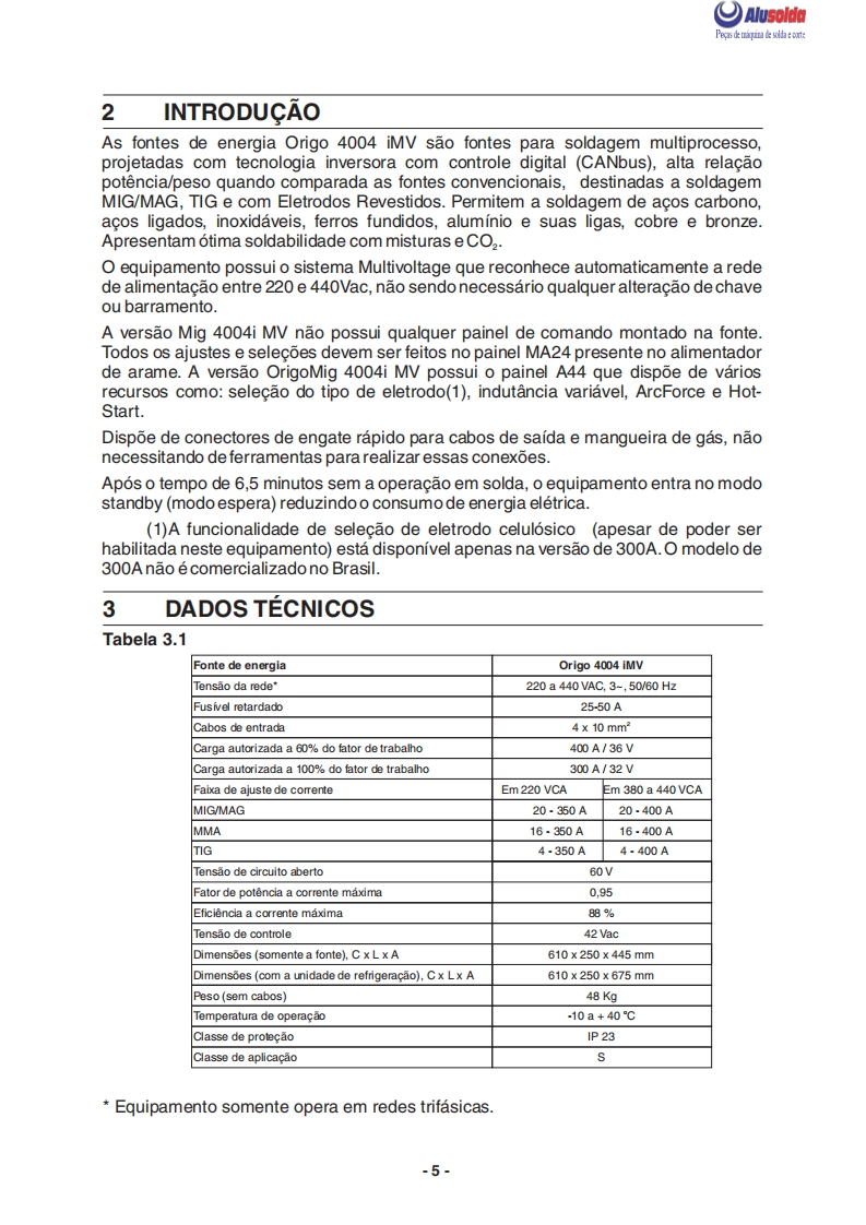 只ESABAlusoldaPTOrigo 4004i MVConjunto Inversor multiprocesso para soldagem dealto desempenho:0+Manual do usuario e pecas de reposicao0404110OrigoMig 4004 iMVMig 4004 iMV0404185ESAB se reserva o direito de alterar as caracteristicas tcnicas de seus equipamentos sem aviso previa0216835022013