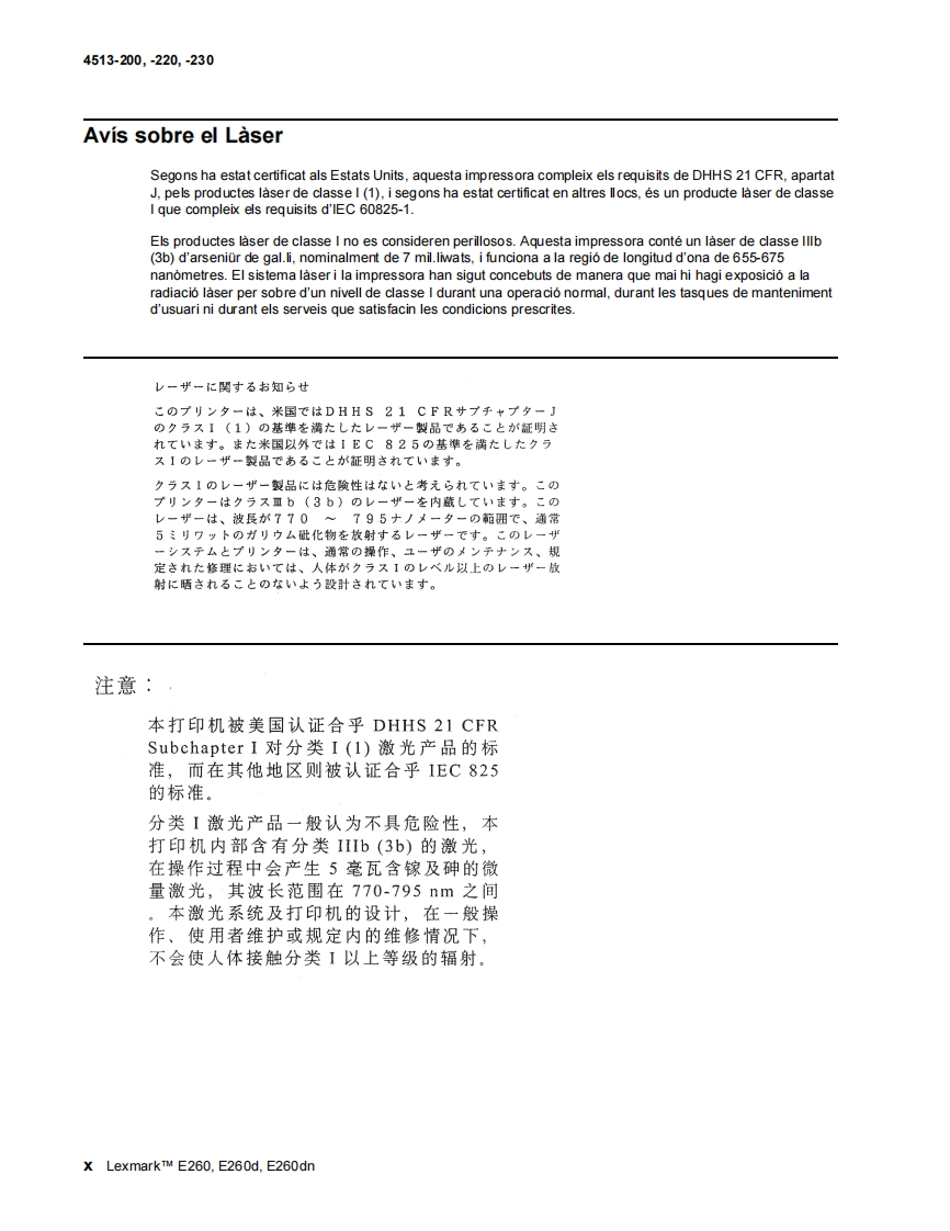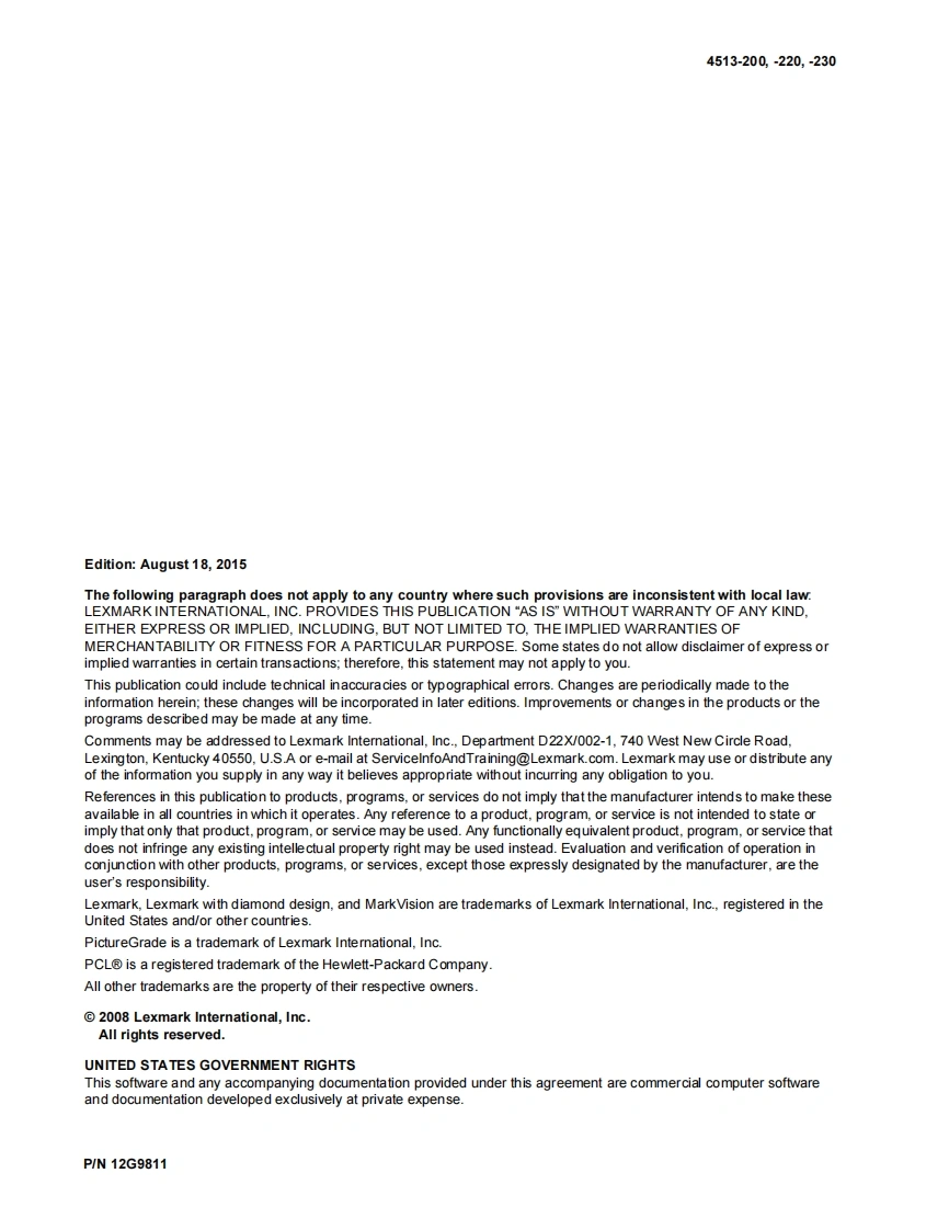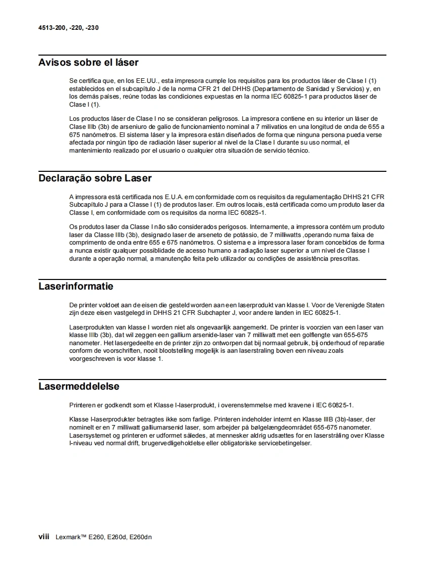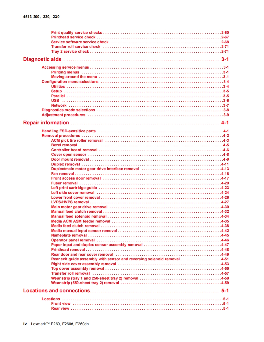 Revision date:August 18,2015Service ManualLexmarkTM E260,E260d,E260dn4513-2004513-2204513-230·Table of contents·Start diagnostics·Safety and notices·Trademarks·IndexLEXMARK.Lexmark and Lexmark with diamond design aretrademarks of Lexmark Intemational,Inc.,registeredin the United States and/or other countries