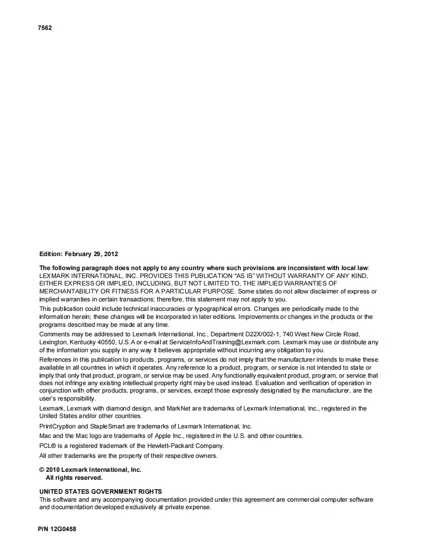 Revision:February 29.2012LexmarkTM X792 printerService ManualMachine Type 7562-4xx·Table of Contents·Start Diagnostics·Safety and Notices·Trademarks·IndexLEXMARK.Lexmark and Lexmark with diamond design aretrademarks of Lexmark Intemational,Inc.,registeredin the United States and/or other countries