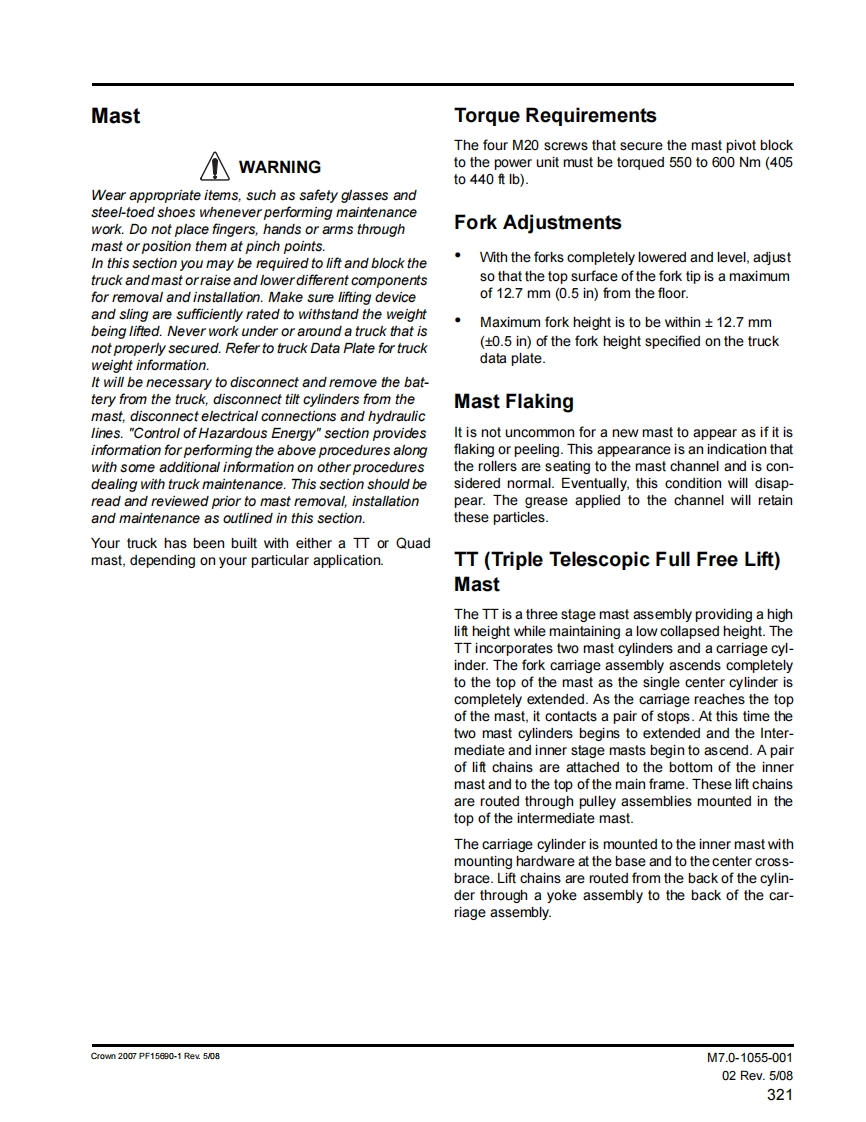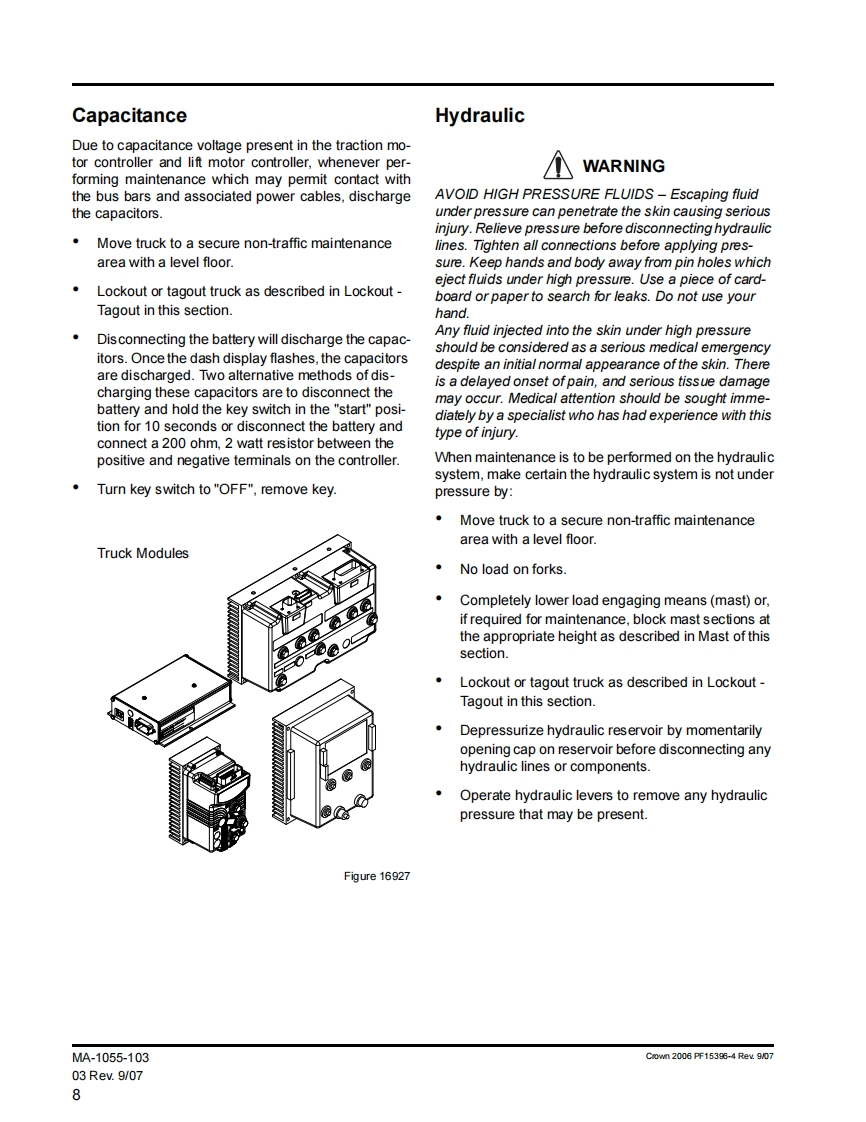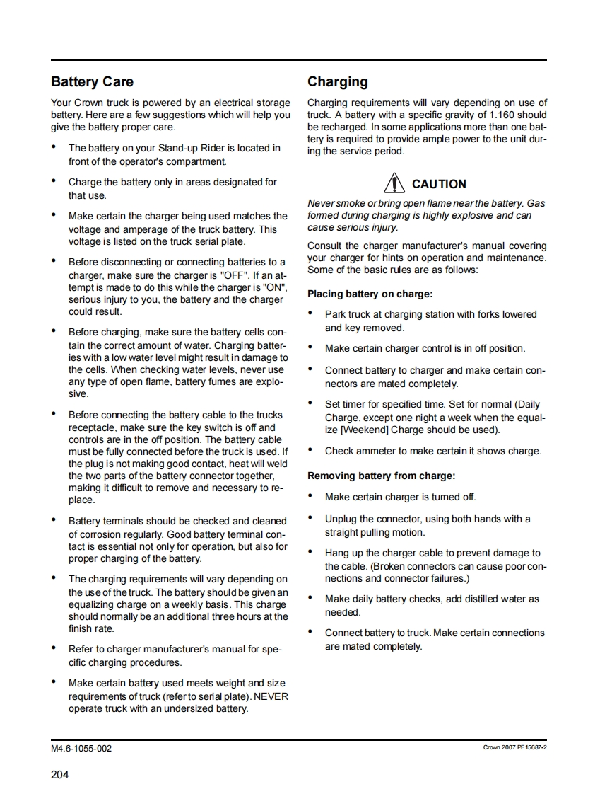 General Maintenance Instructions5.Before starting to operate truck-Be in operating position.公WARNINGApply brake.TO PREVENT SERIOUS RISK OF INJURY TOPlace directional control in neutral.YOURSELF AND OTHERS OBSERVE THE FOL-Before operating truck,check functions of liftLOWING SAFETY INSTRUCTIONSsystems,directional control,speed control,steer-Power industrial trucks may become hazardous if ade-ing,warning devices,brakes and any attachmentsquate maintenance is neglected.Therefore,adequateif any used.maintenance facilities,trained personnel and proce-6.Avoid fire hazards and have fire protection equip-dures should be provided.ment present.Do not use an open flame to checkMaintenance and inspection shall be performed in con-level,or for leakage of electrolyte and fluids or oil.formance with the following practices:Do not use open pans of fuel or flammable clean-ing fluids for cleaning parts.1.A scheduled planned maintenance,lubrication,and inspection system should be followed.7.Keep shop well ventilated,clean and dry.2.Only qualified and authorized personnel shall be8.Brakes,steering mechanisms,control mecha-permitted to maintain,repair,adjust and inspectnisms,lift overload devices,guards,and safety de-truck.vices shall be inspected regularly and maintainedin a safe operating condition.3.Before leaving the truck-All guards must be installed to factory configu-Stop truck.ration and condition before operating truck.Do notFully lower the load engaging means.operate truck if any guards or fasteners are dam-aged,improperly installed or missing.Place directional controls in neutral.9.Capacity,operation and maintenance instructionApply the parking brake.plates or decals shall be maintained in legible con-Turn off power (power disconnect).dition.Remove key.10.All parts of lift mechanisms shall be inspected tomaintain them in safe operating condition.Block the wheels if truck is on an incline.11.All hydraulic systems shall be regularly inspected4.Before working on truck-and maintained in conformance with good practice.Raise drive wheel free of floor or disconnectCylinders,valves,and other similar parts shall bepower sources.checked to assure that"drift"has not developed tothe extent that it would create a hazardUse chocks or other positive positioning de-vices.12.Batteries,motors,controllers,limit switches,pro-tective devices,electrical conductors,and connec-Block load engaging means,inter masts,ortions shall be maintained in conformance withchassis before working under them.good practice.Special attention shall be paid to theOperation to check performance of truck or at-condition of electrical insulation.tachments shall be conducted in an authorized13.Trucks shall be kept in a clean condition to mini-safe clearance area.mize fire hazards and facilitate detection of looseor defective parts.Crown 1976 PF2821-1 Rev.10/08MA-04.0-00105Rev.10/0803
