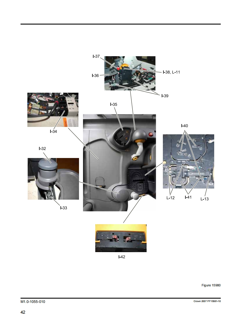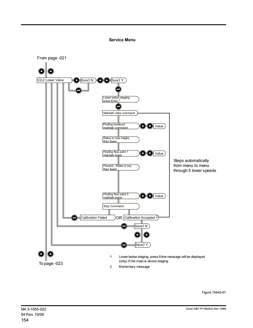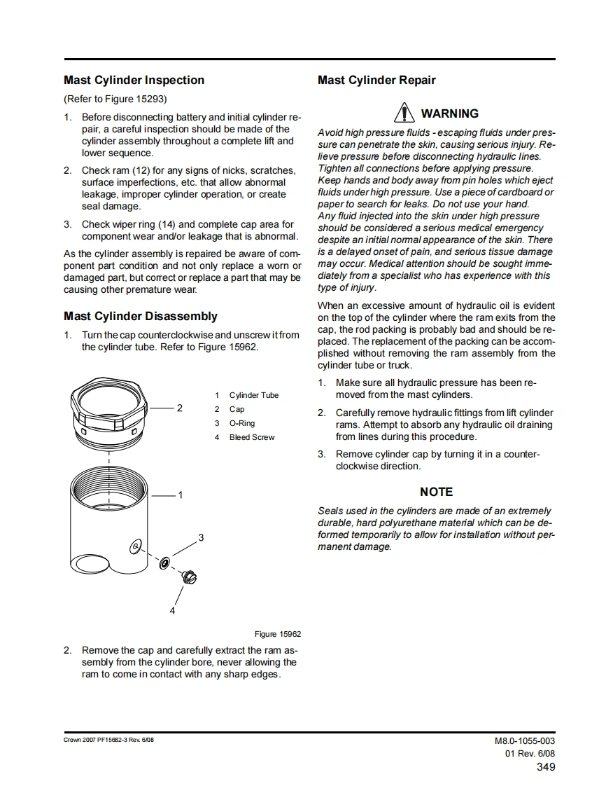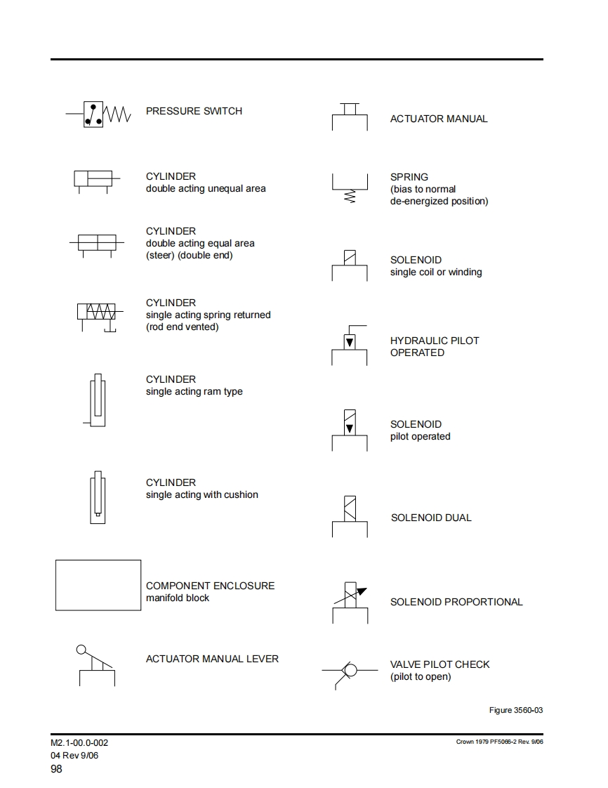 General Maintenance Instructions5.Before starting to operate truck-Be in operating position.公WARNINGApply brake.TO PREVENT SERIOUS RISK OF INJURY TOPlace directional control in neutral.YOURSELF AND OTHERS OBSERVE THE FOL-Before operating truck,check functions of liftLOWING SAFETY INSTRUCTIONSsystems,directional control,speed control,steer-Power industrial trucks may become hazardous if ade-ing,warning devices,brakes and any attachmentsquate maintenance is neglected.Therefore,adequateif any used.maintenance facilities,trained personnel and proce-6.Avoid fire hazards and have fire protection equip-dures should be provided.ment present.Do not use an open flame to checkMaintenance and inspection shall be performed in con-level,or for leakage of electrolyte and fluids or oil.formance with the following practices:Do not use open pans of fuel or flammable clean-ing fluids for cleaning parts.1.A scheduled planned maintenance,lubrication,and inspection system should be followed.7.Keep shop well ventilated,clean and dry.2.Only qualified and authorized personnel shall be8.Brakes,steering mechanisms,control mecha-permitted to maintain,repair,adjust and inspectnisms,lift overload devices,guards,and safety de-truck.vices shall be inspected regularly and maintainedin a safe operating condition.3.Before leaving the truck-All guards must be installed to factory configu-Stop truck.ration and condition before operating truck.Do notFully lower the load engaging means.operate truck if any guards or fasteners are dam-aged,improperly installed or missing.Place directional controls in neutral.9.Capacity,operation and maintenance instructionApply the parking brake.plates or decals shall be maintained in legible con-Turn off power (power disconnect).dition.Remove key.10.All parts of lift mechanisms shall be inspected tomaintain them in safe operating condition.Block the wheels if truck is on an incline.11.All hydraulic systems shall be regularly inspected4.Before working on truck-and maintained in conformance with good practice.Raise drive wheel free of floor or disconnectCylinders,valves,and other similar parts shall bepower sources.checked to assure that"drift"has not developed tothe extent that it would create a hazardUse chocks or other positive positioning de-vices.12.Batteries,motors,controllers,limit switches,pro-tective devices,electrical conductors,and connec-Block load engaging means,inter masts,ortions shall be maintained in conformance withchassis before working under them.good practice.Special attention shall be paid to theOperation to check performance of truck or at-condition of electrical insulation.tachments shall be conducted in an authorized13.Trucks shall be kept in a clean condition to mini-safe clearance area.mize fire hazards and facilitate detection of looseor defective parts.Crown 1976 PF2821-1 Rev.10/08MA-04.0-00105Rev.10/0803