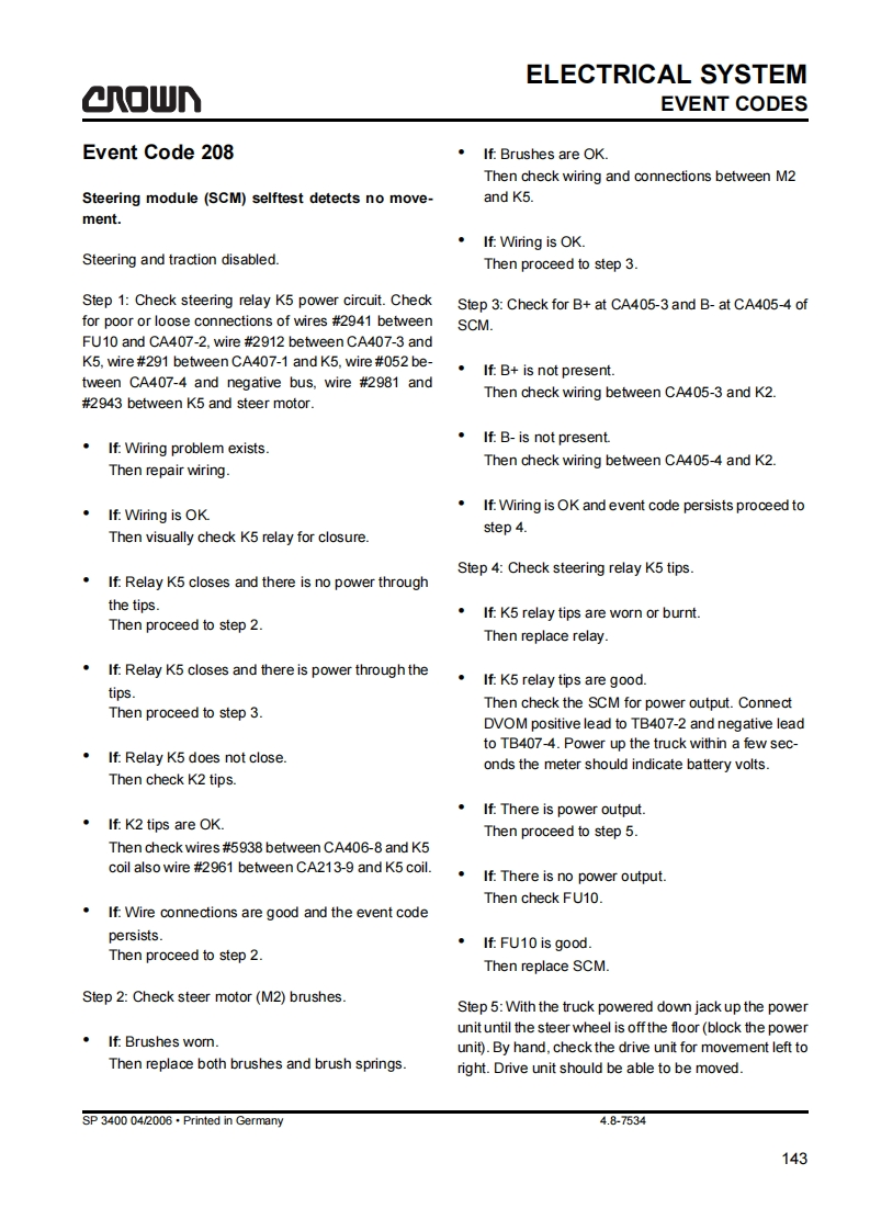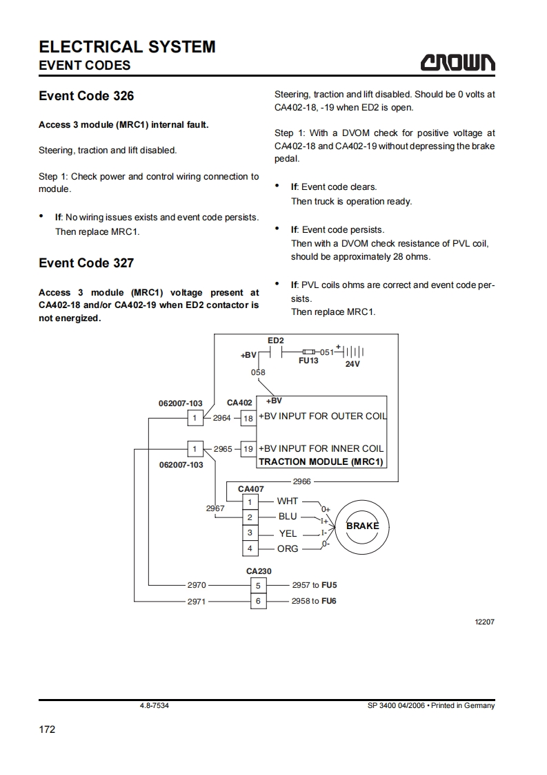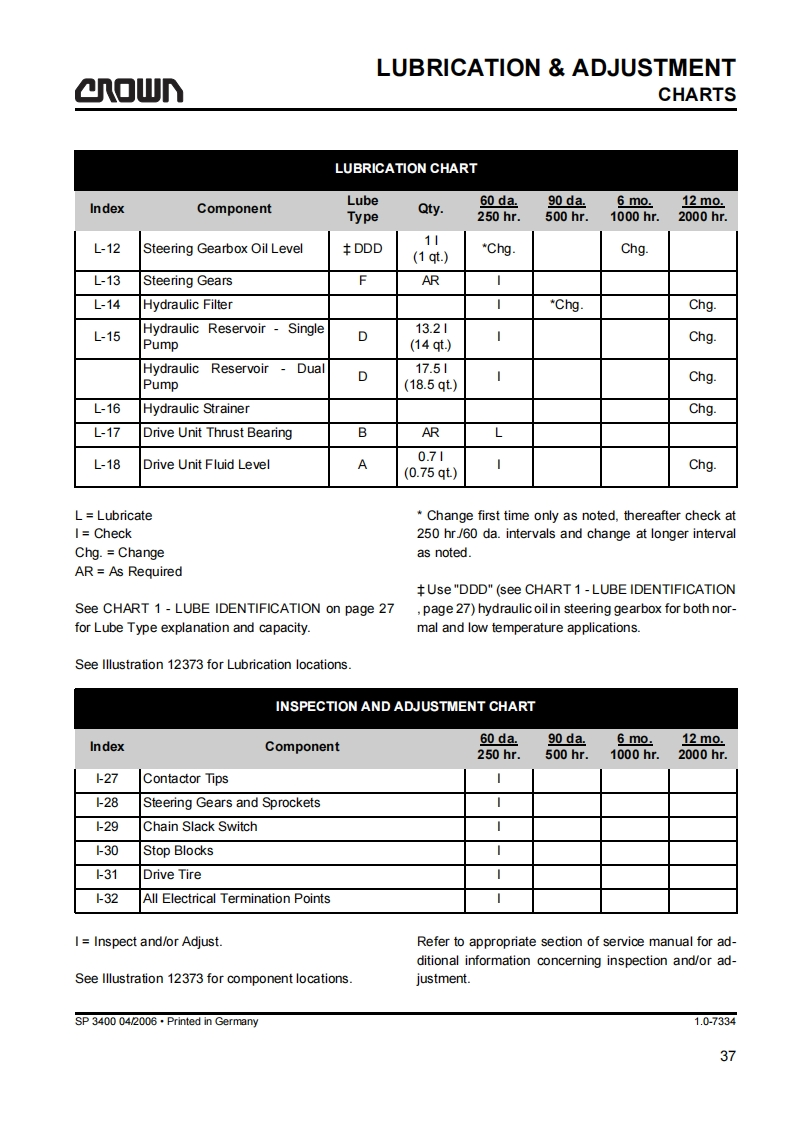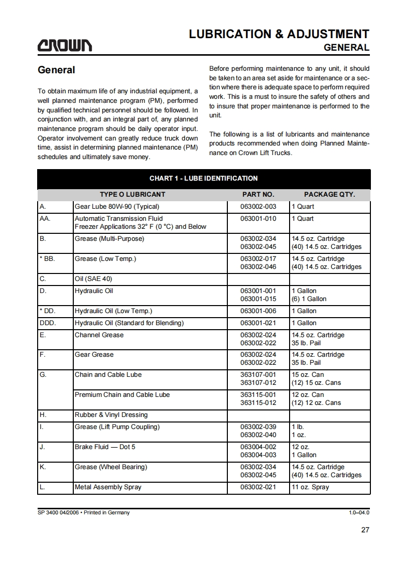 SAFETYGENERAL SAFETY INSTRUCTIONSa▣wGeneral Safety InstructionsDo not allow oils to penetrate the ground or thedrain system.Used oil must be recycled correctly.Oil filters and dehumidifying inserts must beMaintenance and Repair Instruc-treated as special waste.Observe the local author-tionsity regulations.Danger!Immediately neutralize and thoroughly rinse anyObserve the safety instructions in thespilled battery fuid.maintenance manual and the truck op-erator manual.Keep the truck clean.This will facilitate tracingloose or faulty componentsFailure to do so could result in seriousor even fatal injuries to maintenanceMaintain the legibility of the data capacity plate andand other personnel.data plate,waming and instruction decals.Motorised trucks can become hazardous if mainte-Truck modifications and additions may only be per-nance and servicing work are neglected.For this rea-formed with Crown's prior written approval.son maintenance and inspections must be performedat sufficiently short intervals.There must be suitablyThe reliability,safety and suitability of Crowntrained personnel and proper guidelines at your placeof work.trucks can only be ensured by using original Crownparts.Maintenance and RepairBefore Parking the TruckAlways carry out work in accordance with the testBrake until the truck comes to restand maintenance schedule enclosed in thesemaintenance instructions and any applicable ser-vice bulletins.Lower the fork carriage fully.Only qualified and authorized personnel may carryApply the parking brake.out work on the truck.Switch off the truck and remove the key.Keep fire protection equipment at hand and do notuse a naked flame to check fluid levels or to test forWhen parking on a slope or incline always chockleaks.all wheels.Use groundwater neutral,non-flammable solventsBefore Working on the Truckfor cleaning.Always perform cleaning work over anoil separator.Protect the electrical system againstdamp.Jack up the truck so that the drive wheel is clear ofthe ground.Apply the Emergency Disconnect andKeep the work place and battery charging stationdisconnect the battery.clean,dry and well ventilated.MA-0000SP 3400 04/2006.Printed in Gemmany