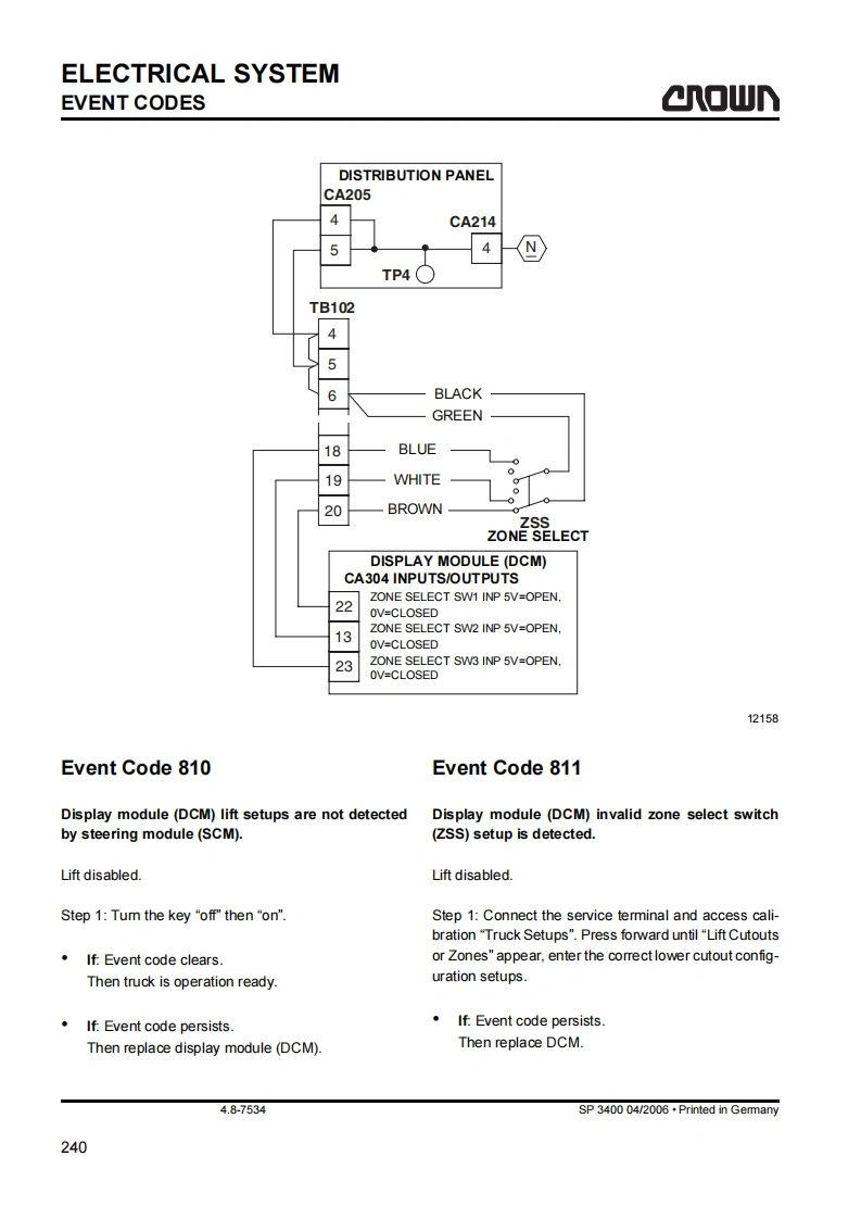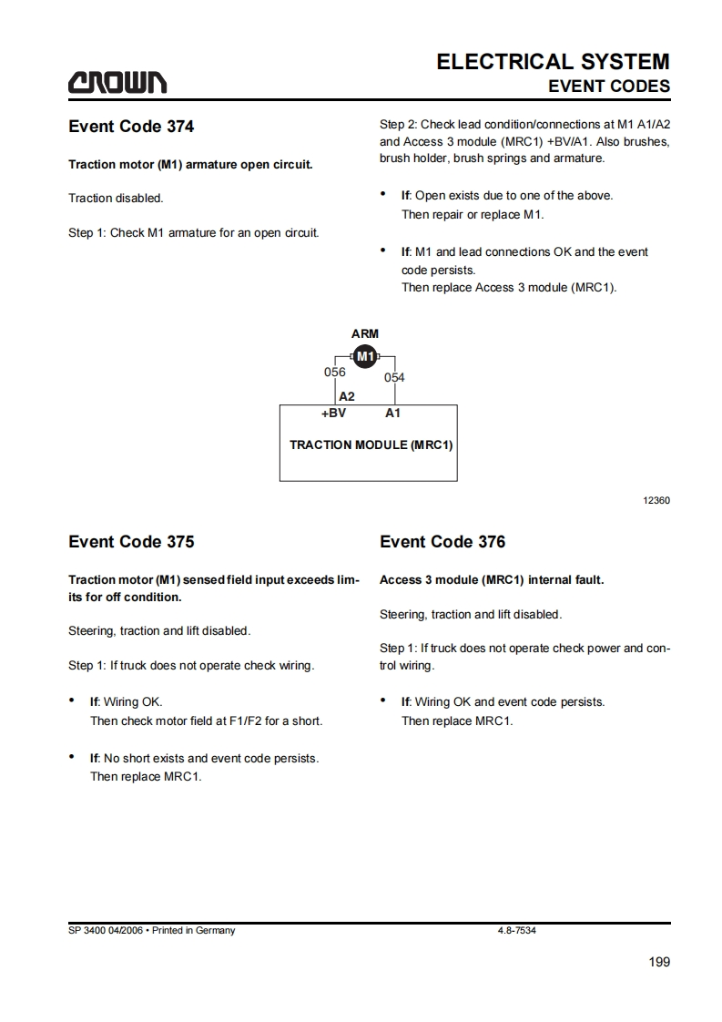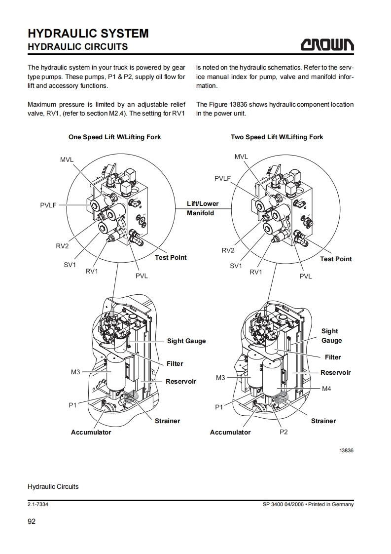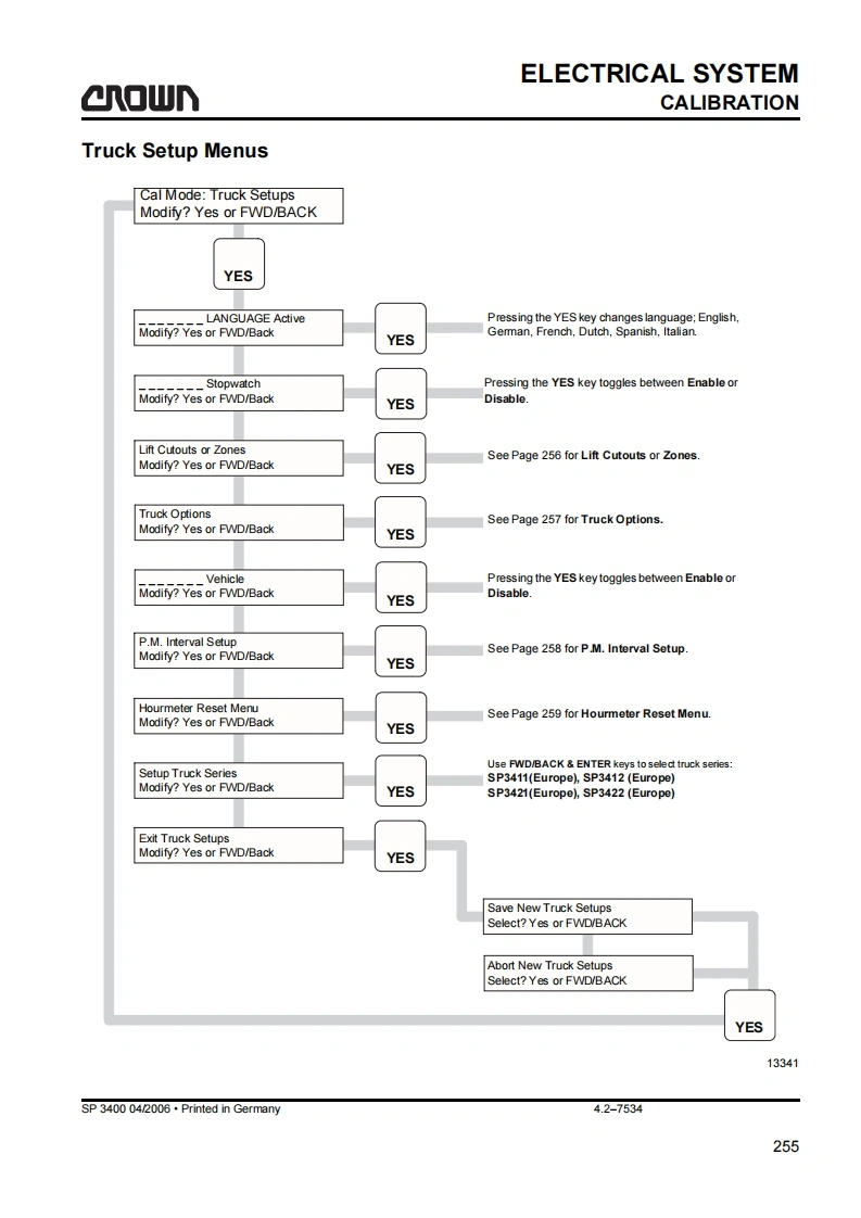 SAFETYGENERAL SAFETY INSTRUCTIONSa▣wGeneral Safety InstructionsDo not allow oils to penetrate the ground or thedrain system.Used oil must be recycled correctly.Oil filters and dehumidifying inserts must beMaintenance and Repair Instruc-treated as special waste.Observe the local author-tionsity regulations.Danger!Immediately neutralize and thoroughly rinse anyObserve the safety instructions in thespilled battery fuid.maintenance manual and the truck op-erator manual.Keep the truck clean.This will facilitate tracingloose or faulty componentsFailure to do so could result in seriousor even fatal injuries to maintenanceMaintain the legibility of the data capacity plate andand other personnel.data plate,waming and instruction decals.Motorised trucks can become hazardous if mainte-Truck modifications and additions may only be per-nance and servicing work are neglected.For this rea-formed with Crown's prior written approval.son maintenance and inspections must be performedat sufficiently short intervals.There must be suitablyThe reliability,safety and suitability of Crowntrained personnel and proper guidelines at your placeof work.trucks can only be ensured by using original Crownparts.Maintenance and RepairBefore Parking the TruckAlways carry out work in accordance with the testBrake until the truck comes to restand maintenance schedule enclosed in thesemaintenance instructions and any applicable ser-vice bulletins.Lower the fork carriage fully.Only qualified and authorized personnel may carryApply the parking brake.out work on the truck.Switch off the truck and remove the key.Keep fire protection equipment at hand and do notuse a naked flame to check fluid levels or to test forWhen parking on a slope or incline always chockleaks.all wheels.Use groundwater neutral,non-flammable solventsBefore Working on the Truckfor cleaning.Always perform cleaning work over anoil separator.Protect the electrical system againstdamp.Jack up the truck so that the drive wheel is clear ofthe ground.Apply the Emergency Disconnect andKeep the work place and battery charging stationdisconnect the battery.clean,dry and well ventilated.MA-0000SP 3400 04/2006.Printed in Gemmany