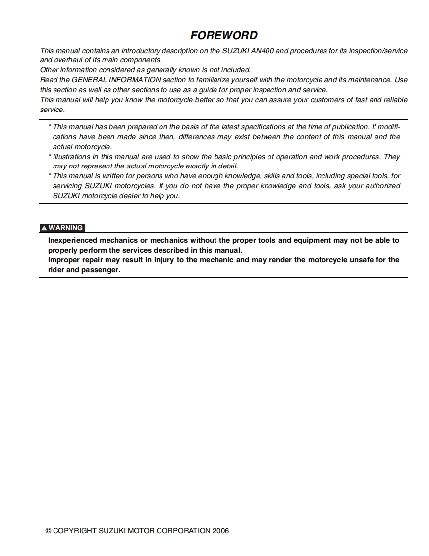 suzuki_an400k7-k8-k9-维修维护手册找手册网前天发布关注私信35.82MB475页030suzuki_an400k7-k8-k9-维修维护手册此内容为付费资源,请付费后查看¥19¥21黄金会员免费钻石会员免费立即购买您当前未登录!建议登陆后购买,可保存购买订单付费资源 第1页 / 共475页 第2页 / 共475页 第3页 / 共475页 第4页 / 共475页 第5页 / 共475页 第6页 / 共475页 第7页 / 共475页 第8页 / 共475页 第9页 / 共475页 第10页 / 共475页 试读已结束,还剩465页,您可下载完整版后进行离线阅读 THE ENDSuzuki 文本预览 SUZUKIAN400SERVICE MANUAL99500-34100-01E 查看更多 收起部分 喜欢就支持一下吧收藏