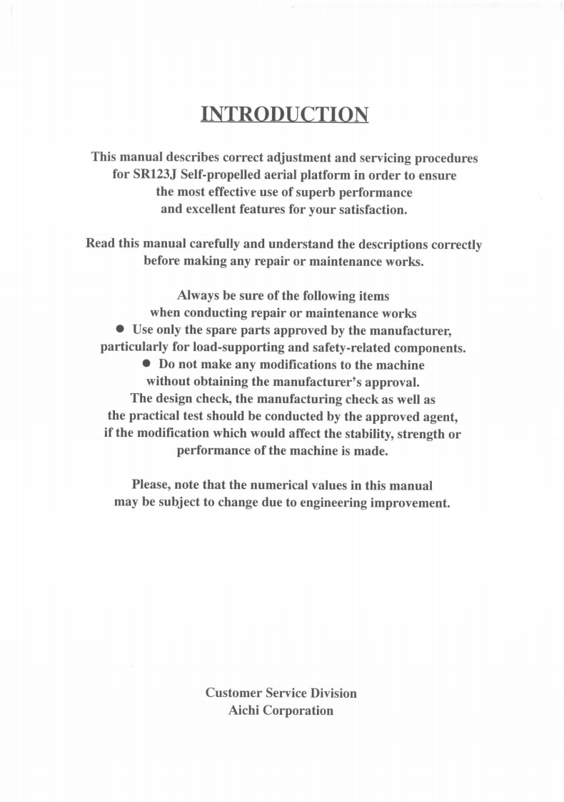 SR123J维修维护说明书手册找手册网昨天发布关注私信39.09MB146页033SR123J维修维护说明书手册此内容为付费资源,请付费后查看¥29¥31黄金会员免费钻石会员免费立即购买您当前未登录!建议登陆后购买,可保存购买订单付费资源 第1页 / 共146页 第2页 / 共146页 第3页 / 共146页 第4页 / 共146页 第5页 / 共146页 第6页 / 共146页 第7页 / 共146页 第8页 / 共146页 第9页 / 共146页 第10页 / 共146页 试读已结束,还剩136页,您可下载完整版后进行离线阅读 THE ENDGenie/Aichi 文本预览 SME-120SERVICE MANUALSELF PROPELLED AERIAL PLATFORMSR123J/ISR403JICHICORPORATION1152,RYOKE,AGEO,SAITAMA,JAPAN. 查看更多 收起部分 喜欢就支持一下吧收藏