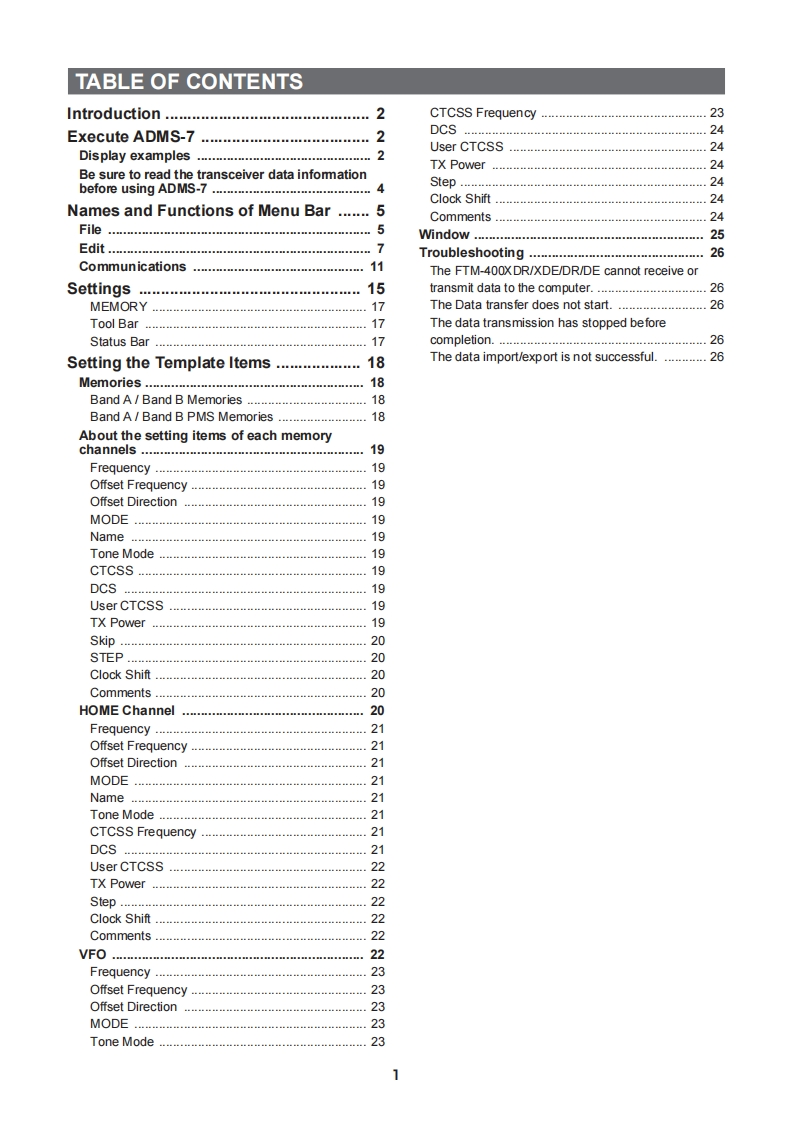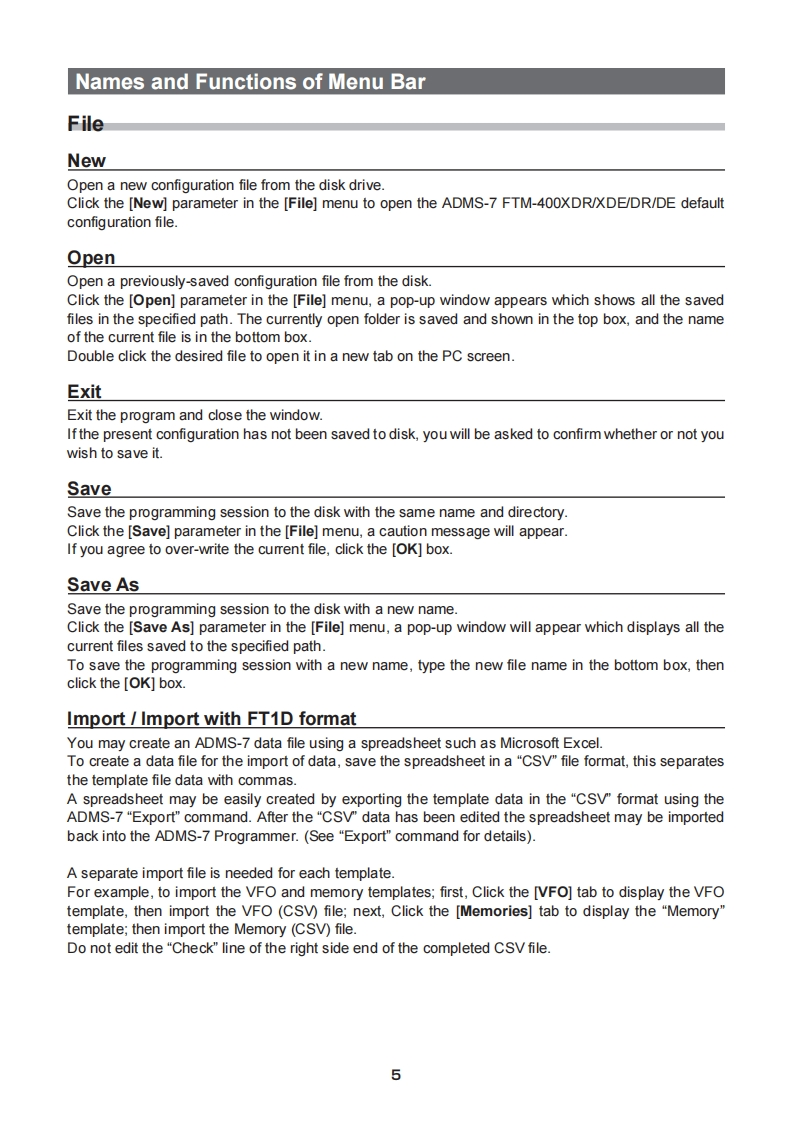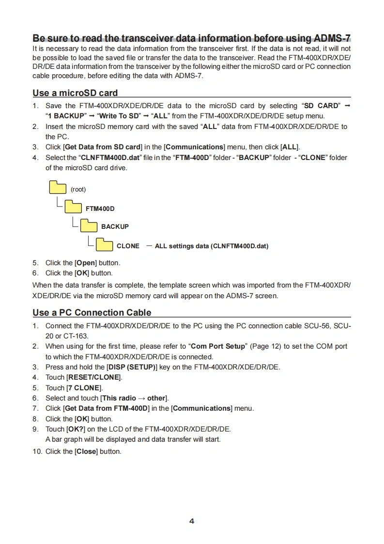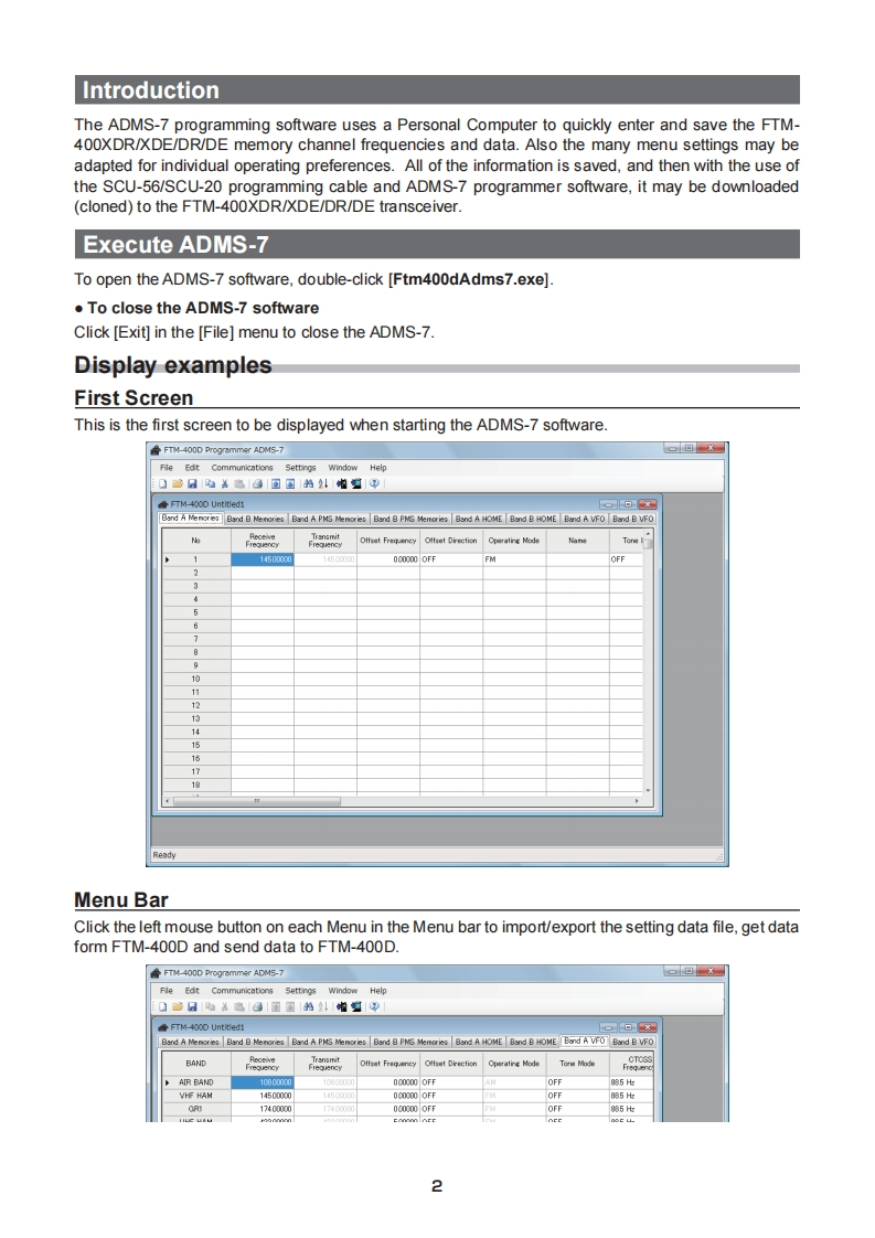 YAESUThe radioADMS-7(Ver.1.1 or later)DG-ID and DP-ID Feature CompatibleOperation ManualThe ADMS-7 software provides convenient editing of the FTM-400XDR/XDE/DR/DEmemory channel frequencies,channel information and alpha tags,using a personalcomputer.Also the transceiver parameters and the setup menu items may be edited andconfigured easily from the computer keyboard.AttentionThe ADMS-7 software (Ver.1.1 or later)can only be used with FTM-400XDR/XDEMAIN firmware version"Ver.4.00"or later and FTM-400DR/DE MAIN firmware version"Ver.3.00"or later.YAESU MUSEN CO.,LTD.