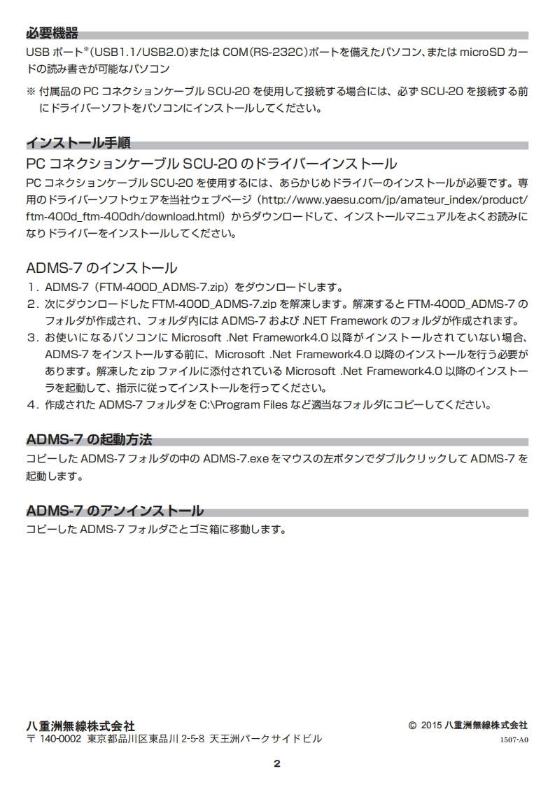 YAESUThe radioADMS-7(FTM-4OOD/DH用X毛y一镉集ソフ卜)不又卜一儿又二ユ了儿ADMS-7I:、FTM4O0D/DHDX毛)一于ヤ)ネ儿术太U各種設定在Windows八y门yc行5乙七C老石X毛)辐集ソフ卜ヴ工了c寸。付属品0P℃门ネ夕)3竹一ブ儿SCU-20(USB)、ま:才ブ)3)0デ一夕ヶ一ブ儿CT-163ま左:CT.165(RS-232C)cFTM400D/DH亡/)口)左接続寸石乙亡c、VF0也Xモ)一内容D辐集、乜y卜毛一ド)設定:ビ卷行1、FTM4OOD/DH本体忙転送寸石乙亡ic走ま寸。同樣microSD力一ド在使用福集寸乙上右c走未寸。项目名表示这上:日本語表示对底乙书b、八心ソ口)D大走:画面上c快適仁操作寸石乙亡C走未可。OVF0、X毛)一于ヤ)ネ儿、HOME于ヤ)ネ儿在之D樣々辐集(周波数、X毛少一ネ一厶、又ヶ儿于設定、少上一夕設定、送信電力、口X)卜在)。フ了)夕)3牛一D機能割b当乙D設定O分b也寸操作可能在乜y卜了yブ二1一①各種設定OGM機能0ヴ儿一ブ、メ八一設定、APRS通信機能①各種設定O検索也口匕一、移動存使L也寸镉集機能下記示寸“ソフ卜ヴ工了使用条件”在<蔬动儿龙龙志同意)上c本)フ卜ヴ工了在岁中口一ド乙<龙这。)フ卜夕工了使用条件·ソフ卜户工了D著作椎:当社保有儿乙书bま寸。·当社D許可在<取极說明書节ソフ卜户工了D内容0一部、未左:全部卷複製、改变L左口、電子义一儿仁添付乙送信左b寸石乙上住c志ま世h。·取极說明害也))卜ヴ工了卷利用儿乙、金品上D交换:C老ま世·本)フ卜户工了卷使用龙结果IC一儿1乙D责任:、1:石場合c老負ま世h。ADMS-7卷使用寸:、书使忙石/心ソ口亿))卜夕工了在)又卜一儿寸石必要杨bま寸)C、乙仞又二1了儿卷太<読忙在b、ソ)卜ヴ工了苍)久卜一儿儿乙<龙。動作環境对応0SMicrosoft Windows"8.1(32ピy卜/64ピy卜)Microsoft Windows"8(32y卜/64ピy卜)Microsoft Windows"7(32ピy卜/64ピy卜)Microsoft Windows Vista"(Service Pack1以降)※书使在石心ソ口亿Microsoft.NET Framework4.0以降i)又卜一儿这九乙)石必要杨b$。亻又卜一儿ル九乙L:L場合l体、ADMS-7I添付这九乙Microsoft.NET Framework4.O以降卷久卜一儿儿乙<龙。