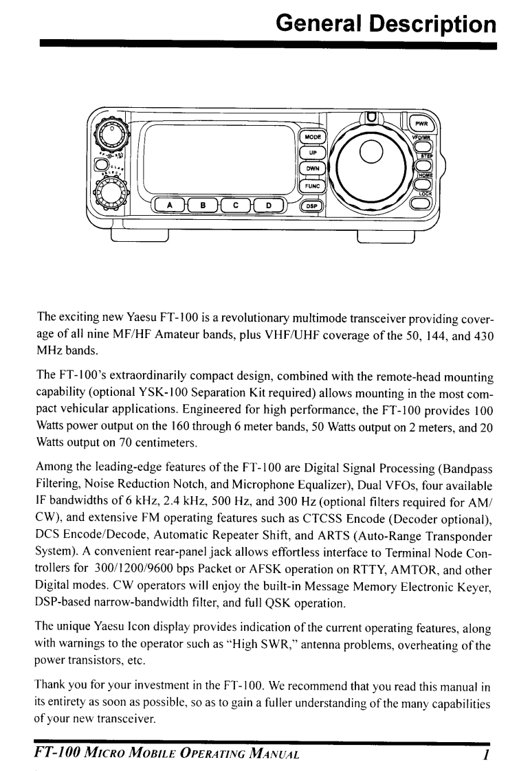YAESUFT-100DOPERATING MANUALMICRO MOBILEYAESU MUSEN CO.,LTD.4-8-8 Nakameguro,Meguro-Ku,Tokyo 153-8644,JapanYAESU U.S.A.17210 Edwards Rd.,Cerritos,CA 90703,U.S.A.YAESU EUROPE B.V.P.O.Box 75525 1118 ZN,Schiphol,The NetherlandsYAESU UK LTD.Unit 12,Sun Valley Business Park,Winnall CloseWinchester,Hampshire,SO23.0LB,U.K.YAESU GERMANY GmbHAm Kronberger Hang 2,D-65824 Schwalbach,GermanyYAESU HK LTD.11th Floor Tsim Sha Tsui Centre,66 Mody Rd.,Tsim Sha Tsui East,Kowloon,Hong Kong
