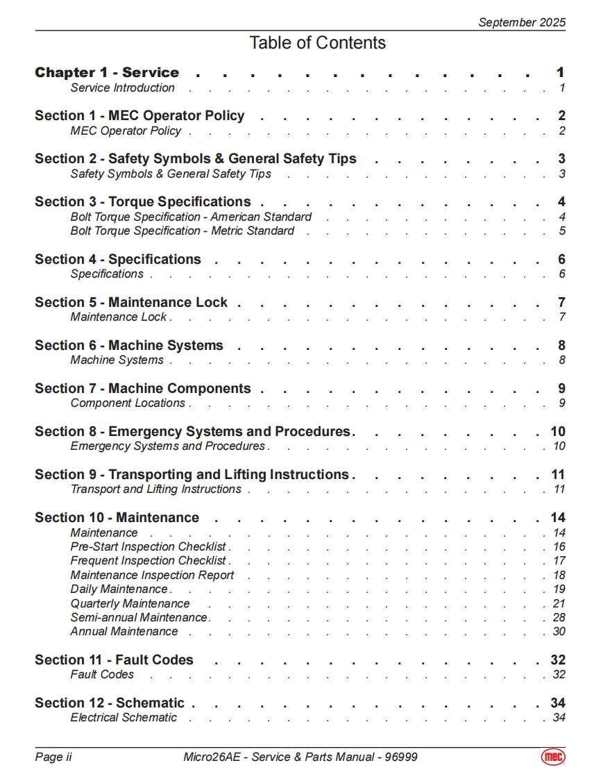 mec-Servic-ce—Parts-Manual-Micro26AE维修图纸手册零部件选型手册找手册网昨天发布关注私信9.80MB80页043mec-Servic-ce—Parts-Manual-Micro26AE维修图纸手册零部件选型手册此内容为付费资源,请付费后查看¥19¥21黄金会员免费钻石会员免费立即购买您当前未登录!建议登陆后购买,可保存购买订单付费资源 第1页 / 共80页 第2页 / 共80页 第3页 / 共80页 第4页 / 共80页 第5页 / 共80页 第6页 / 共80页 第7页 / 共80页 第8页 / 共80页 第9页 / 共80页 第10页 / 共80页 试读已结束,还剩70页,您可下载完整版后进行离线阅读 THE END利勃海尔/Swift/Mec 文本预览 mecService Parts ManualMicro26AEMeets requirements of ANSI A92.20-2020 and CSA B354.6-2019.Part 96999Serial Number Range 19100025-UpSeptember 2025 查看更多 收起部分 喜欢就支持一下吧收藏