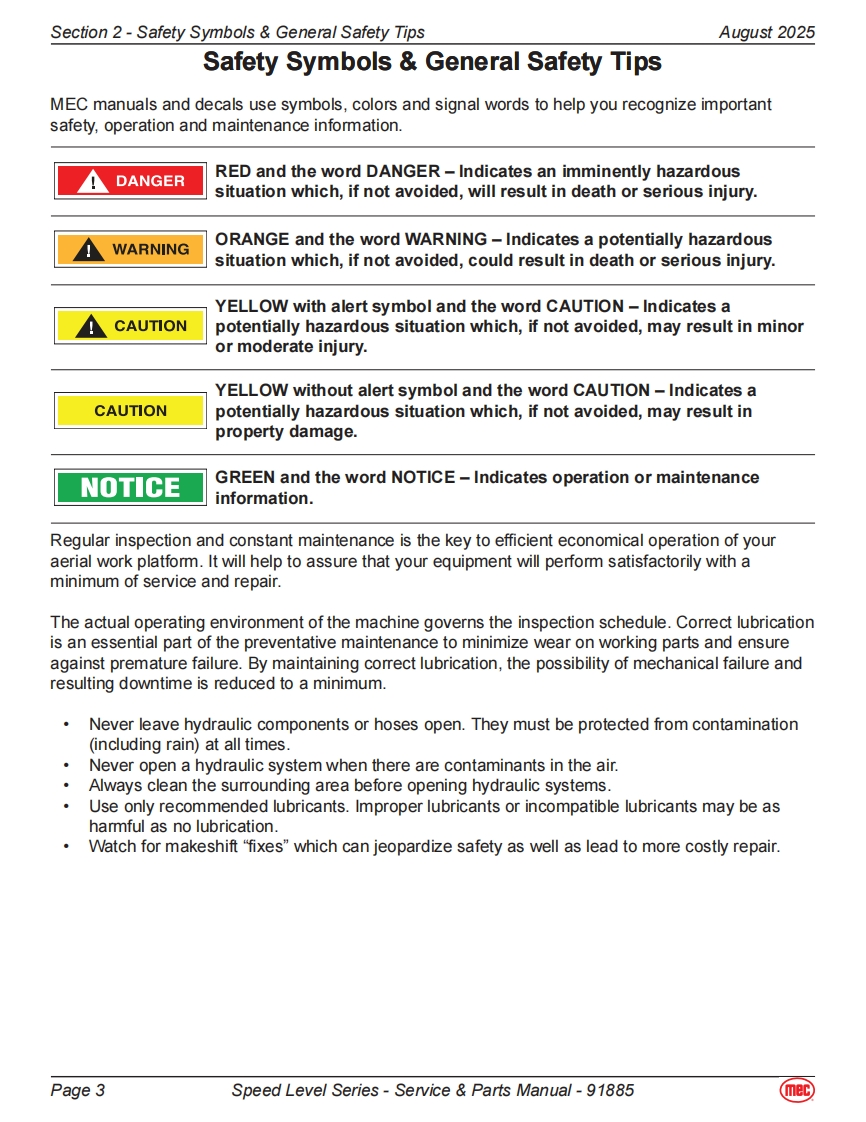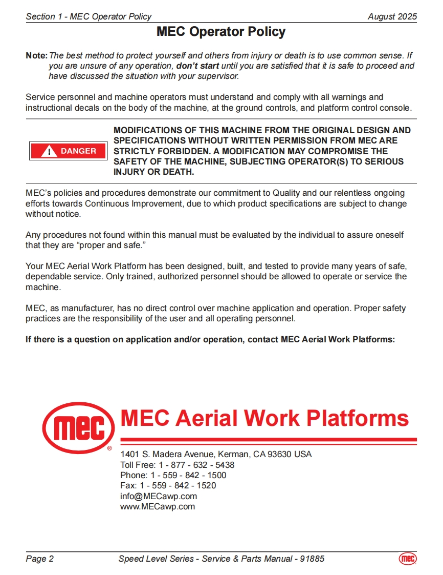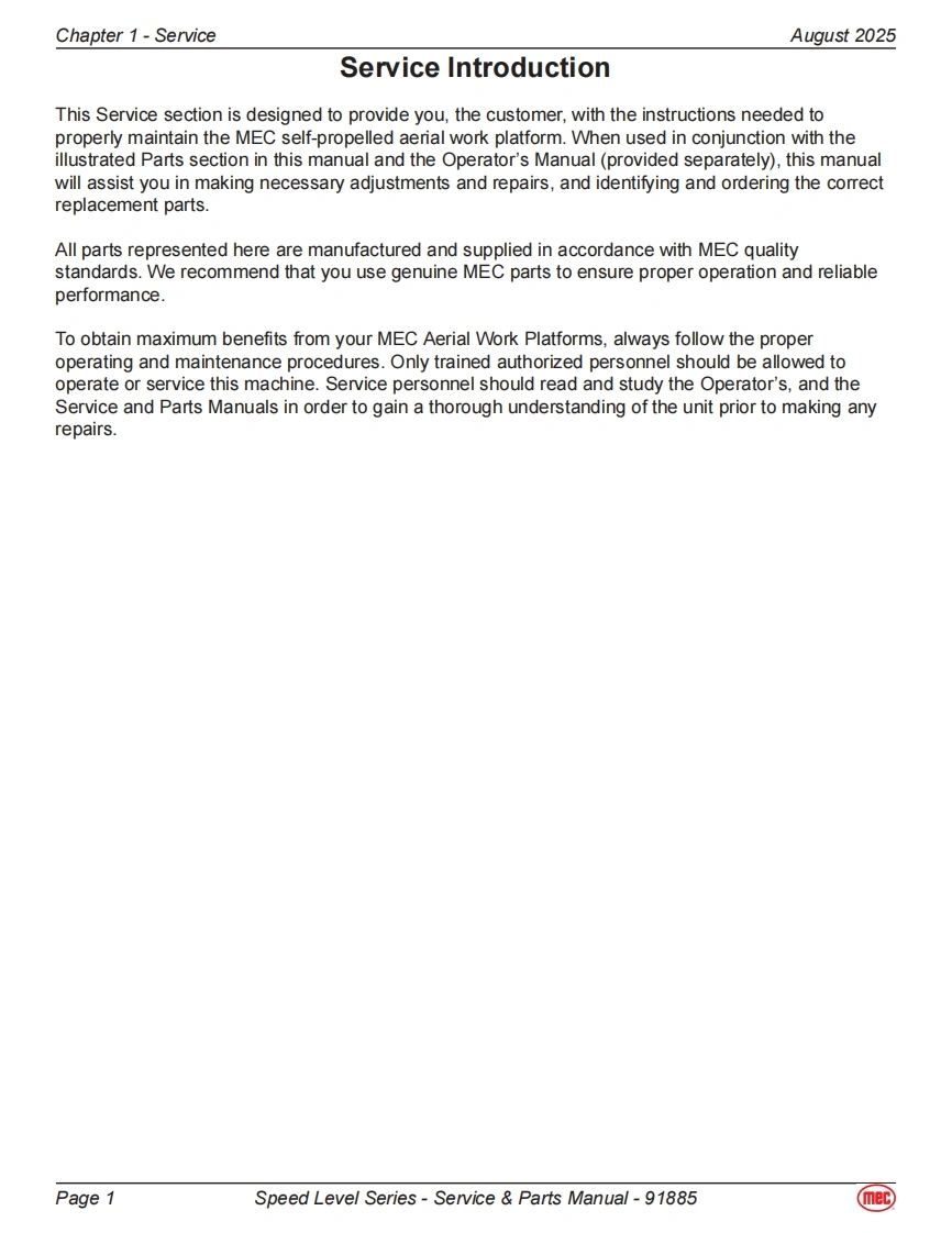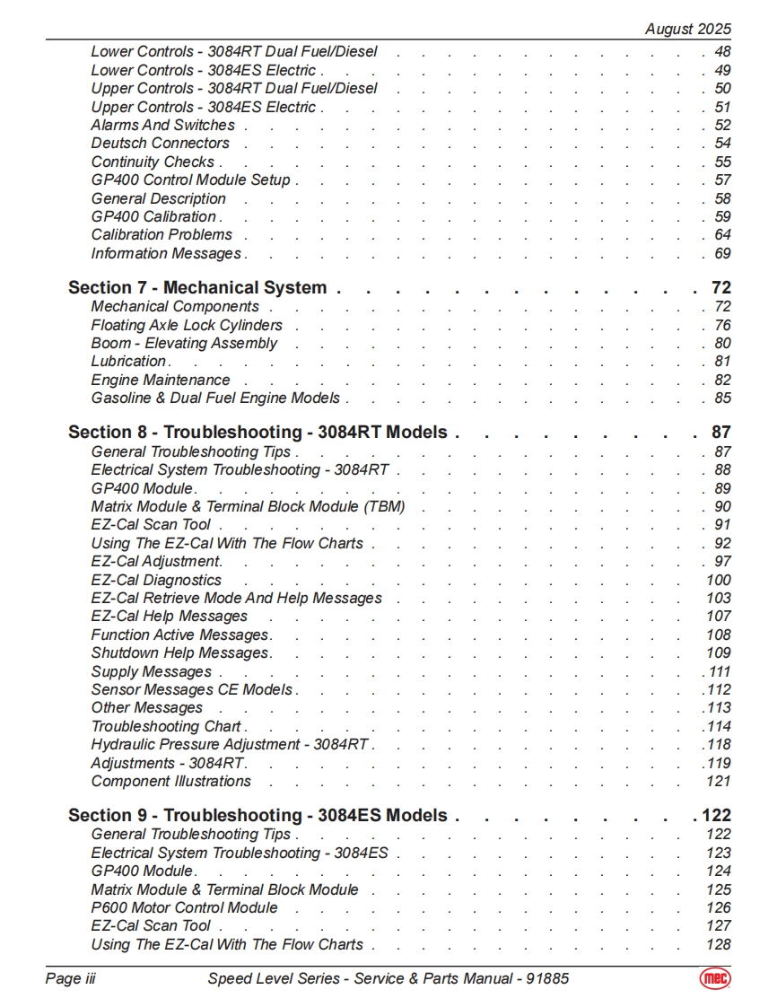 mecService Parts ManualSpeed Level SeriesRT-Internal Combustion2684ES Serial Number Range 12700000-UpPart#91885ES-Electric2684RT Serial Number Range 12800000-UpAugust 20253084ES Serial Number Range 11700000-Up3084RT Serial Number Range 11800000-Up
