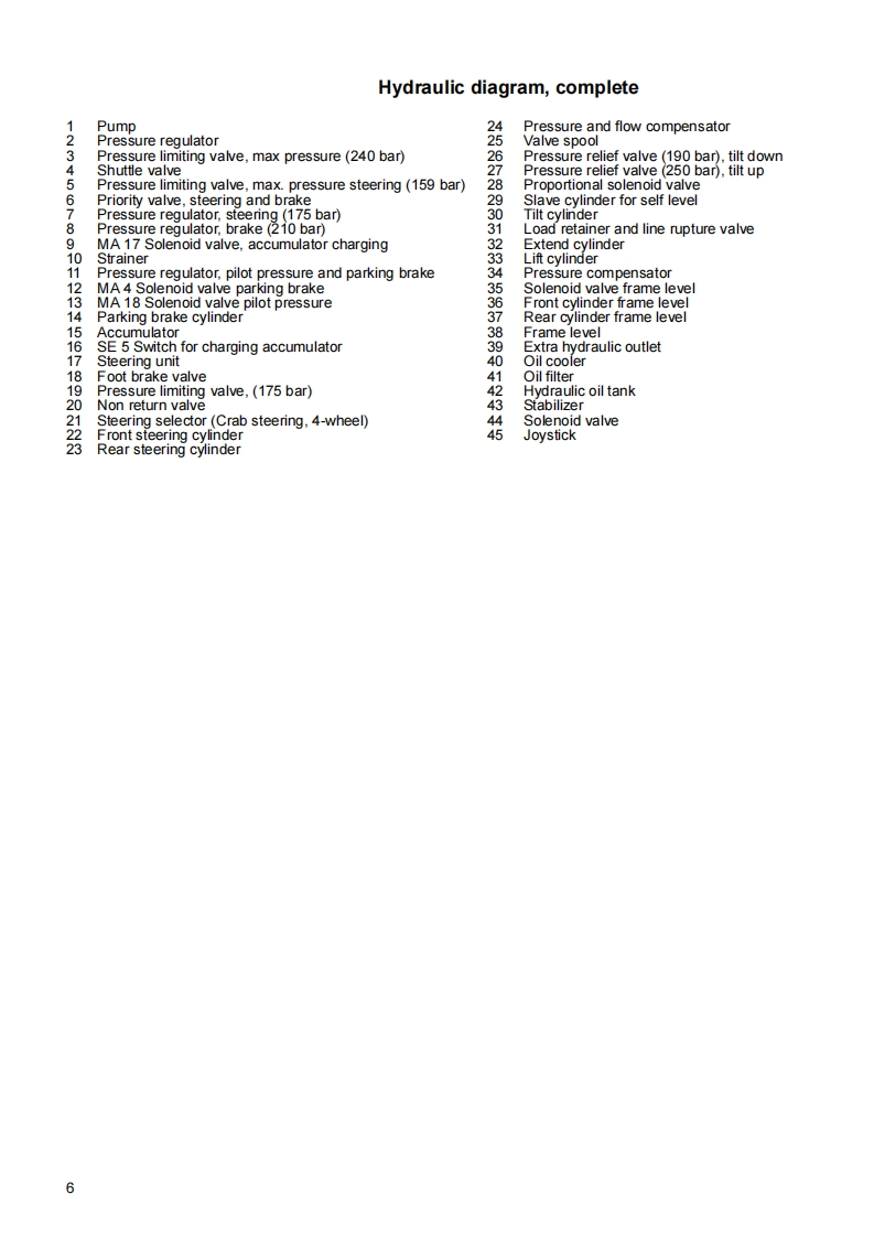 Hydraulic pressure,specificationsFunction at High idleChecking pointsPressureaccording toMPaPSIbarhydraulic diagramServo pressurePS-port3±0.5435±7330±5Ap LS-pressure/Pump pressurePM-LS-port(LS-port2±0.2290±2920±2on manifold)Pump pressure Boom and tilt,PM-port24±0.53480±73240±5upPressure regulator for brakeACC1M-port210.53046±73210±5accumulator,(Max.pressure)Pressure in brake accumulator.ACC1M-port15.0-18.22176-2640150-SE5(Max.pressure)182Pressure in brake accumulator.ACC1M-port14.9-12.82161-1856149-SE5(Min.pressure)128Precharge pressure in brakePort on accumulator4.83±024700±3548.3±2.4accumulator-@70FSteering,pressure limiting valveLS-port15.90.52306±73159±5LSSteering,pressure regulatorPM-port17.52538175Pressure limiting valve for BoomPM-port17.52538175down,Tilt down,Extend andExtra hydraulic outlet,Framelevel5